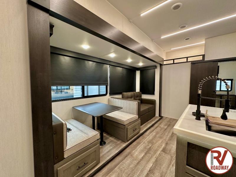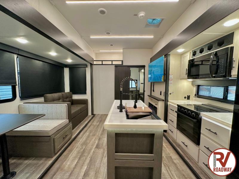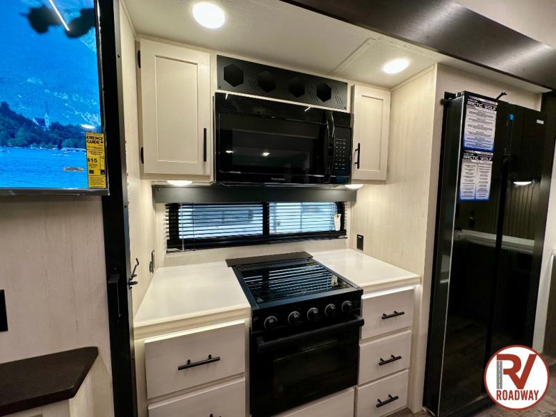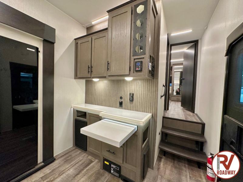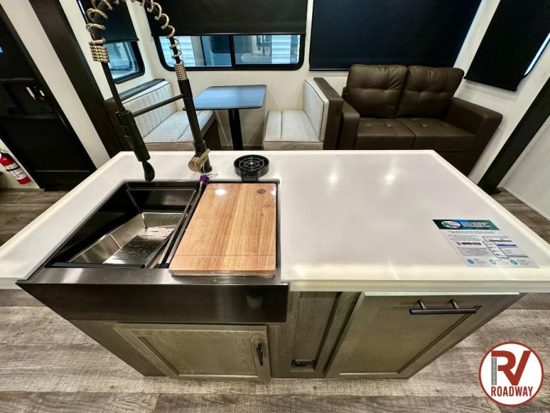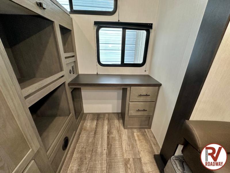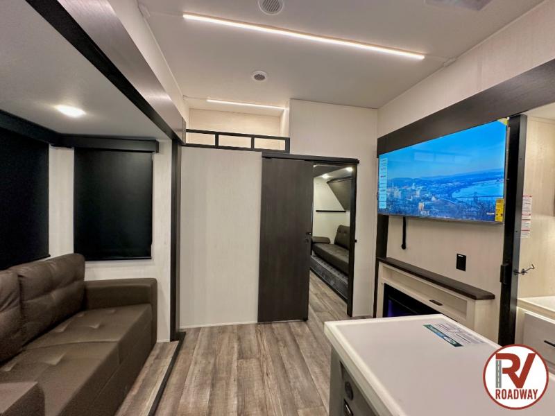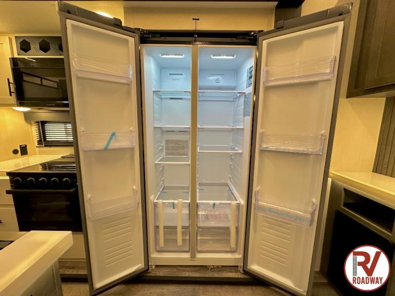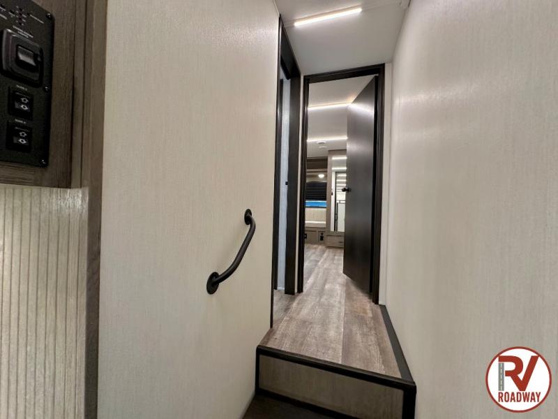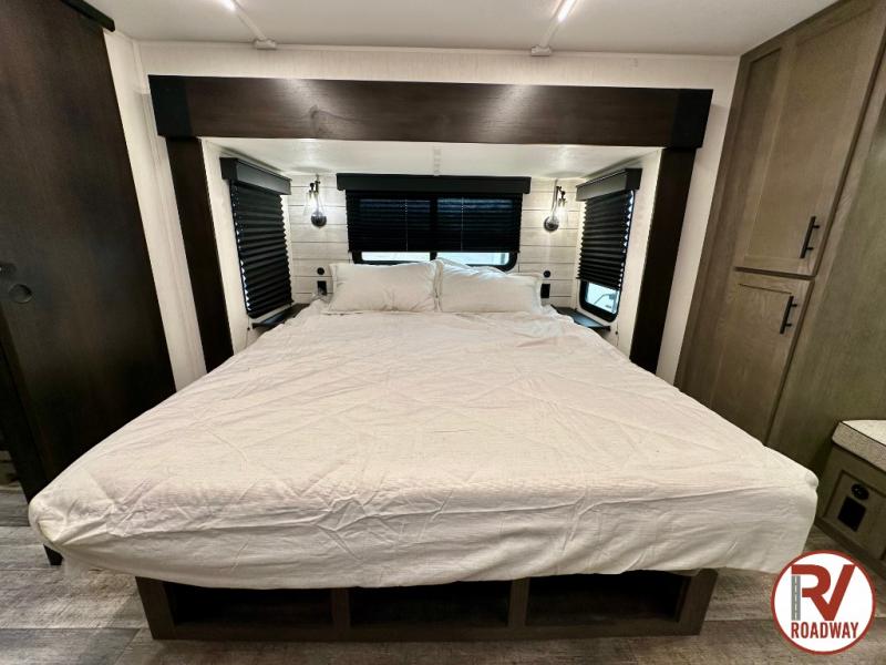 You can't beat this dual entry fifth wheel packed with luxury amenities! Your guests will love the rear private bunkhouse which maximizes sleeping capacity with a 28" x 72" bunk, 54" x 74" bunk, and jack knife sofa with a trundle! This room also has its own full bath with an exterior entry door for ultimate convenience. Up front you will find a luxurious master bedroom, with a king bed slide, fireplace, wardrobe with a sun bench, and washer/dryer prep. The full bath here features a radius shower and plenty of storage. The main kitchen and living area includes dual opposing slides, a tri-fold sofa across from the fireplace, and a dinette. The kitchen includes a 16 cu. ft. 12V residential refrigerator, a hutch, and a pantry for storage as well. Head outdoors to enjoy the exterior griddle and two exterior awnings, plus the pass-through storage!