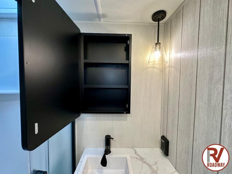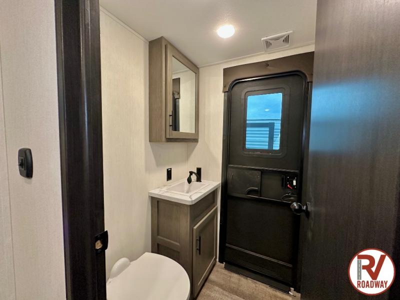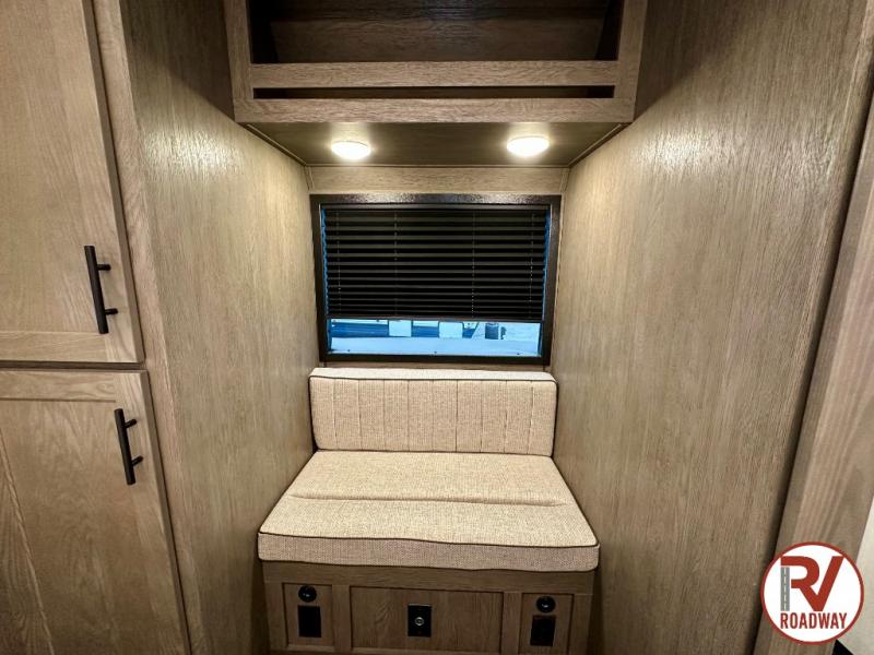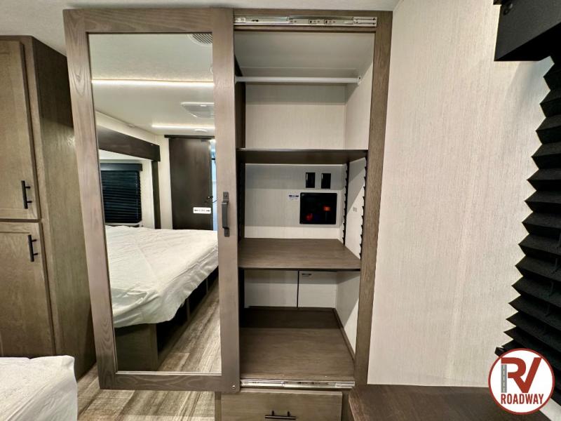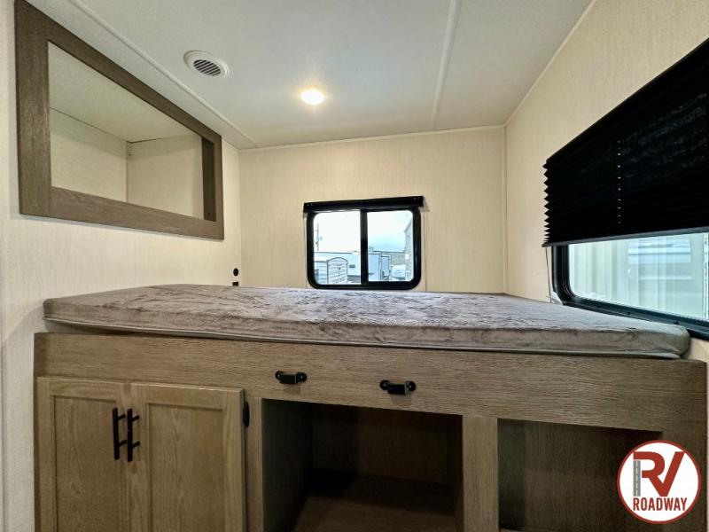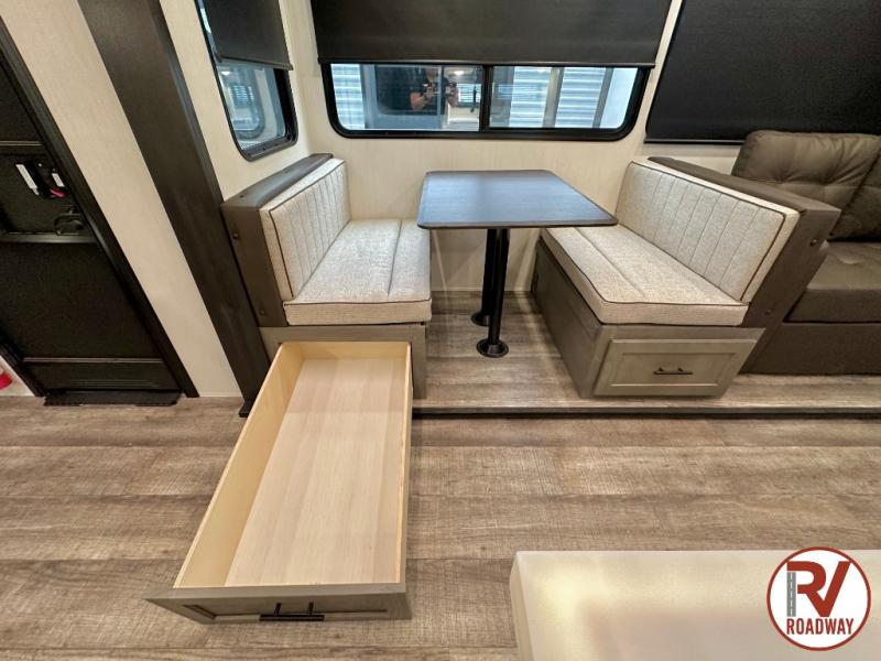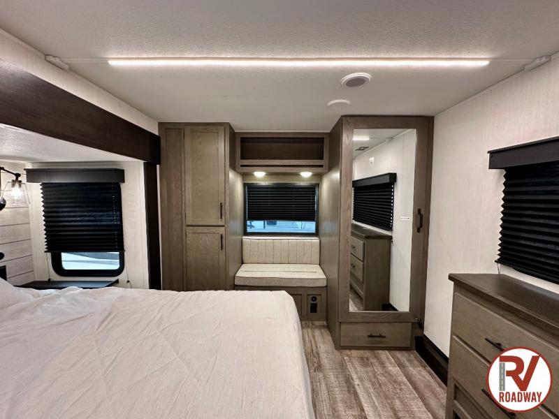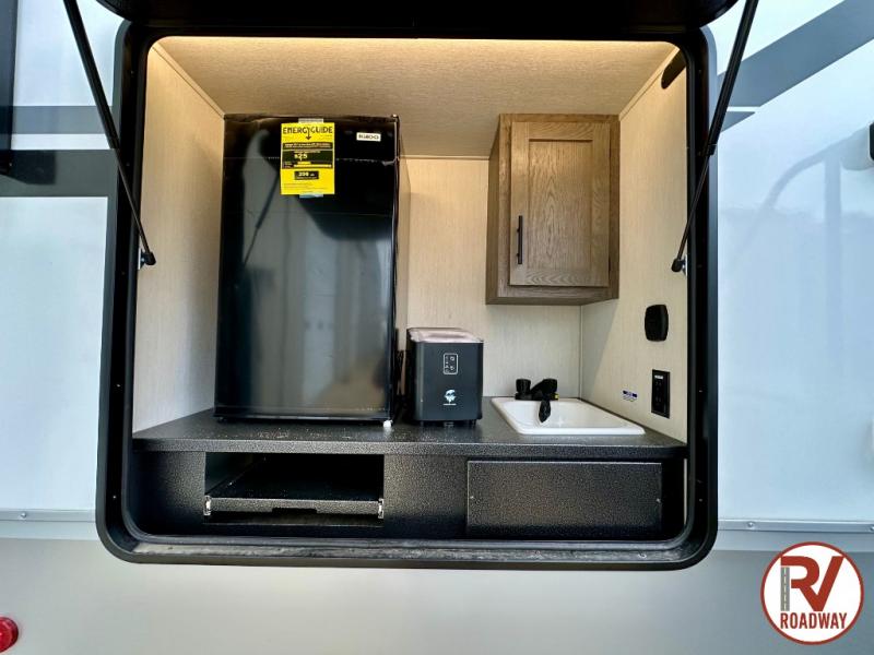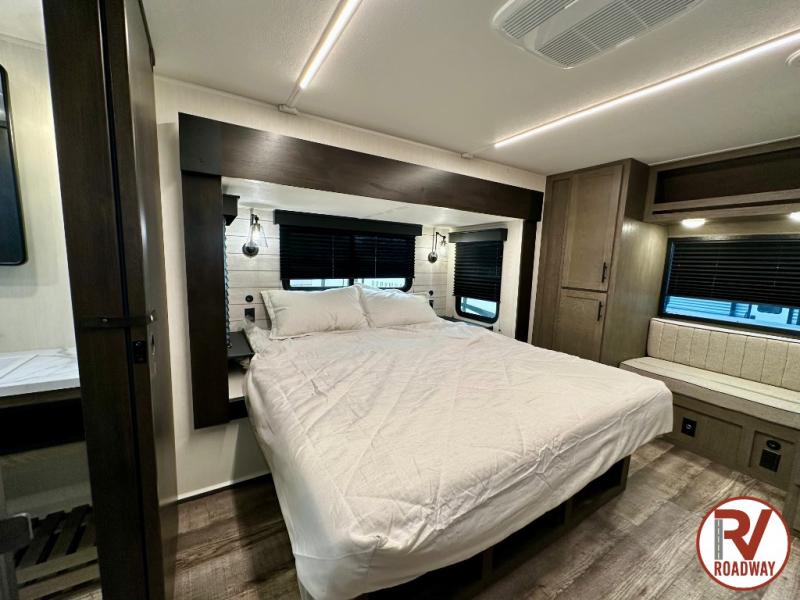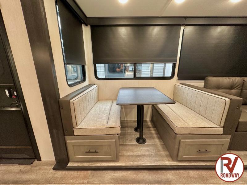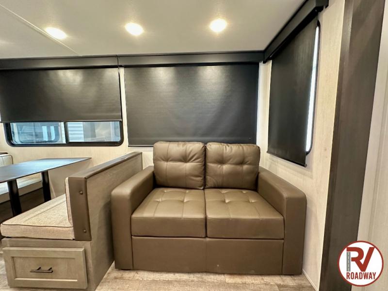 You can't beat this dual entry fifth wheel packed with luxury amenities! Your guests will love the rear private bunkhouse which maximizes sleeping capacity with a 28" x 72" bunk, 54" x 74" bunk, and jack knife sofa with a trundle! This room also has its own full bath with an exterior entry door for ultimate convenience. Up front you will find a luxurious master bedroom, with a king bed slide, fireplace, wardrobe with a sun bench, and washer/dryer prep. The full bath here features a radius shower and plenty of storage. The main kitchen and living area includes dual opposing slides, a tri-fold sofa across from the fireplace, and a dinette. The kitchen includes a 16 cu. ft. 12V residential refrigerator, a hutch, and a pantry for storage as well. Head outdoors to enjoy the exterior griddle and two exterior awnings, plus the pass-through storage!