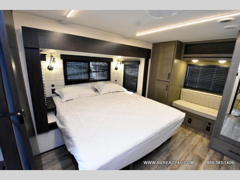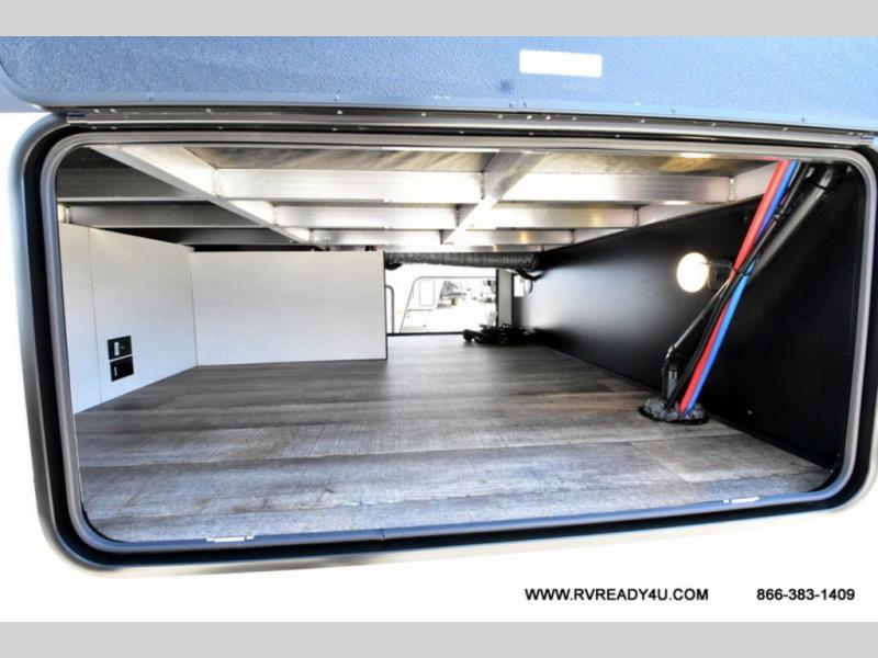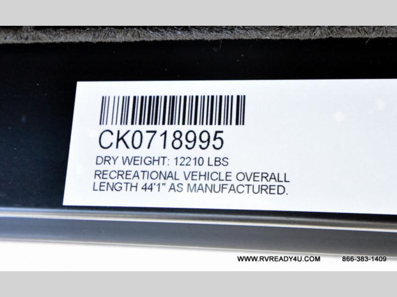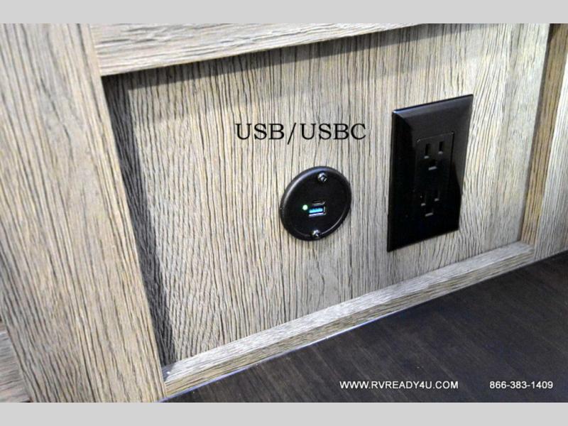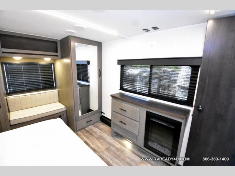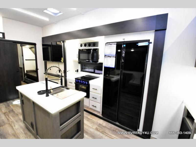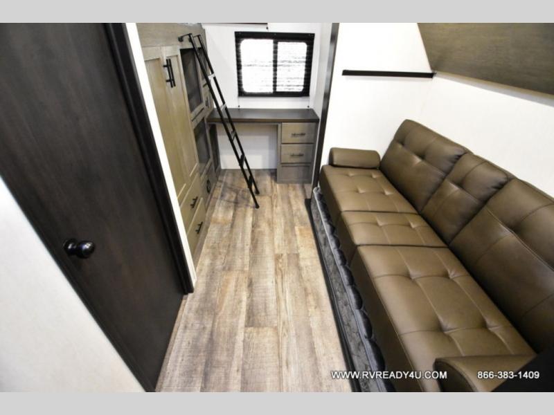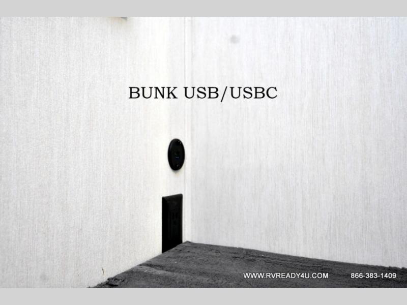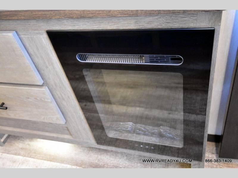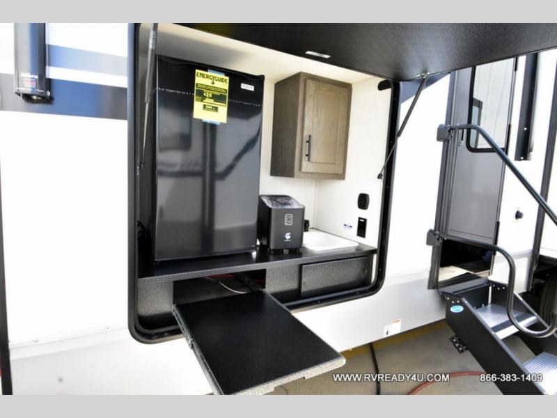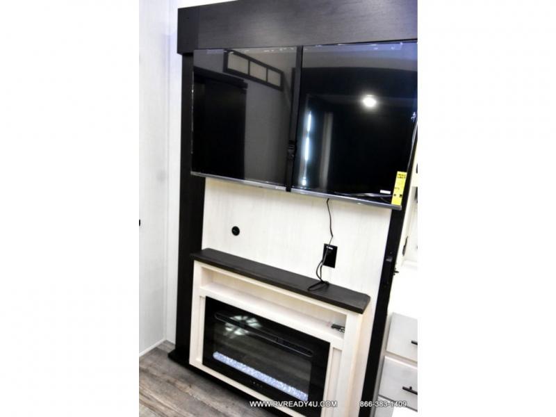 You can't beat this dual entry fifth wheel packed with luxury amenities! Your guests will love the rear private bunkhouse which maximizes sleeping capacity with a 28" x 72" bunk, 54" x 74" bunk, and jack knife sofa with a trundle! This room also has its own full bath with an exterior entry door for ultimate convenience. Up front you will find a luxurious master bedroom, with a king bed slide, fireplace, wardrobe with a sun bench, and washer/dryer prep. The full bath here features a radius shower and plenty of storage. The main kitchen and living area includes dual opposing slides, a tri-fold sofa across from the fireplace, and a dinette. The kitchen includes a 16 cu. ft. 12V residential refrigerator, a hutch, and a pantry for storage as well. Head outdoors to enjoy the exterior griddle and two exterior awnings, plus the pass-through storage!