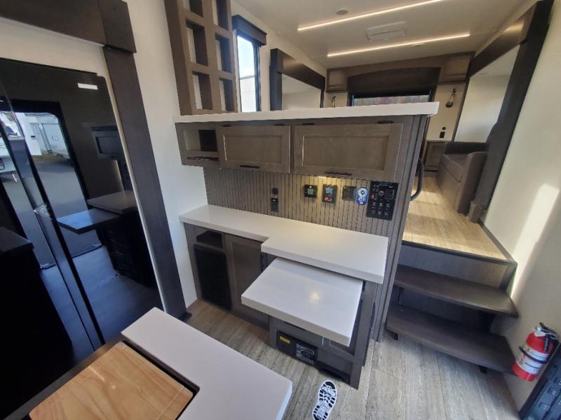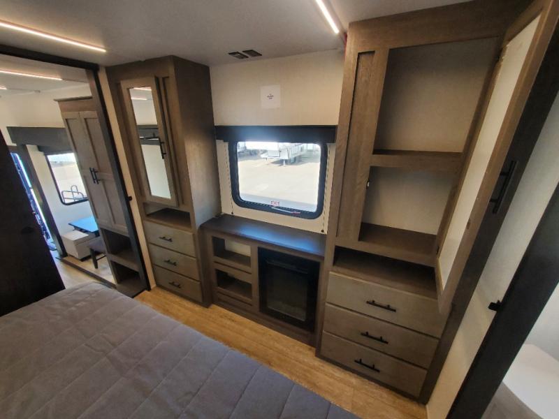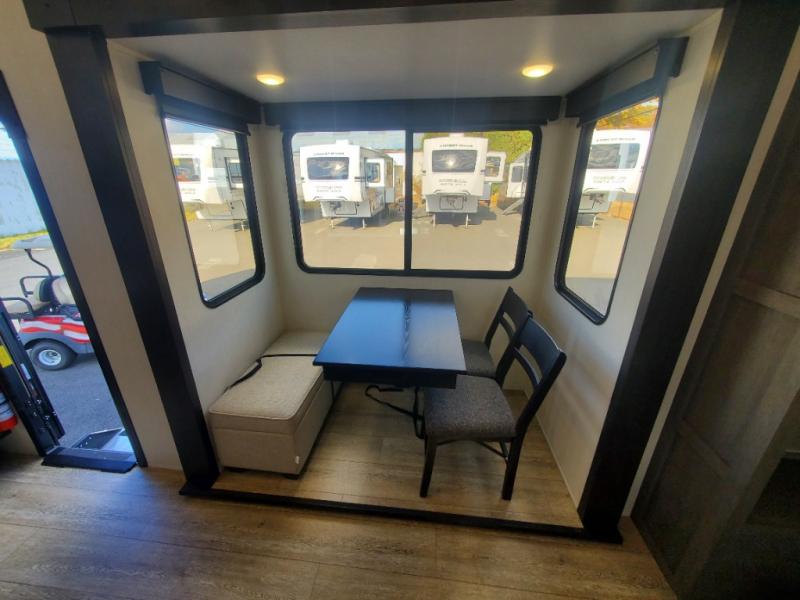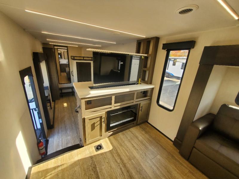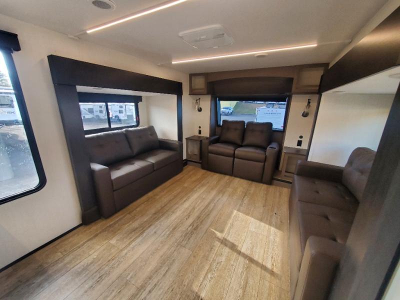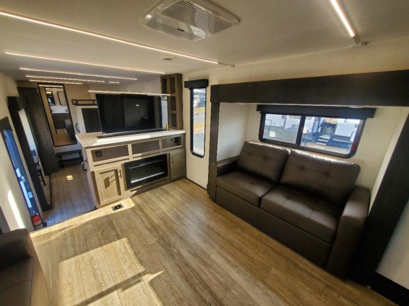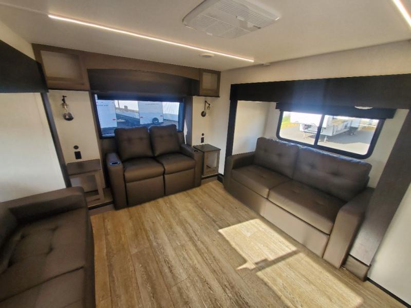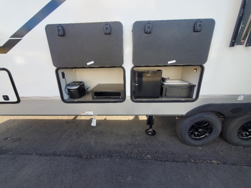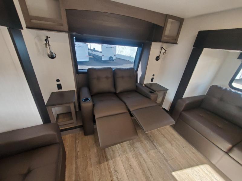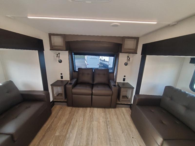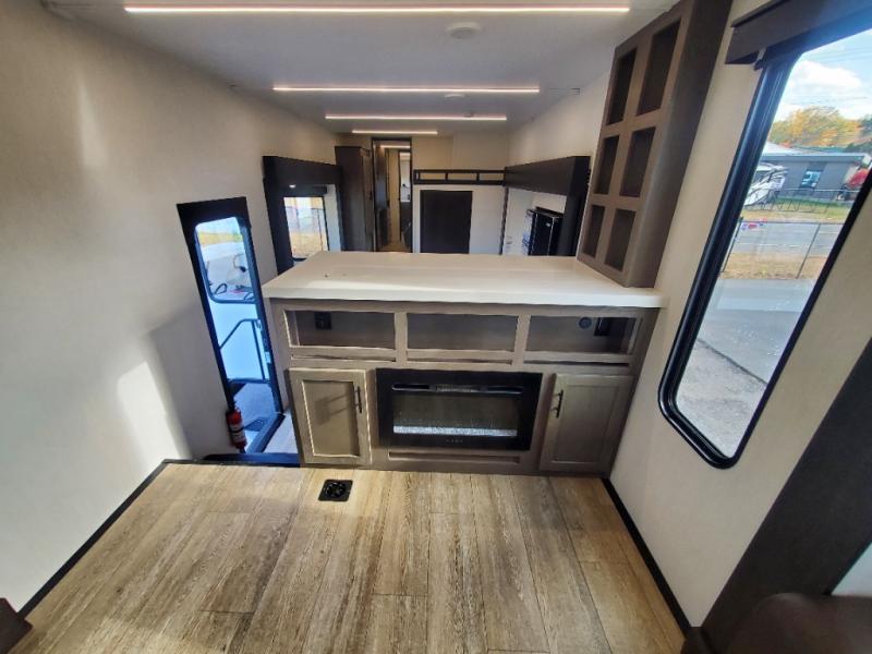 Five slides, a bath and a half, plus sleeping space for six make this fifth wheel the perfect choice! Once you arrive at your destination, prepare lunch on the exterior kitchen. Inside, you'll find a kitchen island, plenty of storage space, plus a free-standing table with chairs and a storage ottoman seat. The front living area will be a favorite place to hang out and this room can double as a bedroom with the two tri-fold sofas. There is also theater seating across from the entertainment center and fireplace, plus storage cabinets for movies or board games. When you're ready to call it a night, head to the master bedroom for a great night's rest on the king bed slide out. You will also love the full rear bath with dual sinks, a spacious shower, plus a closet with stackable washer and dryer prep!