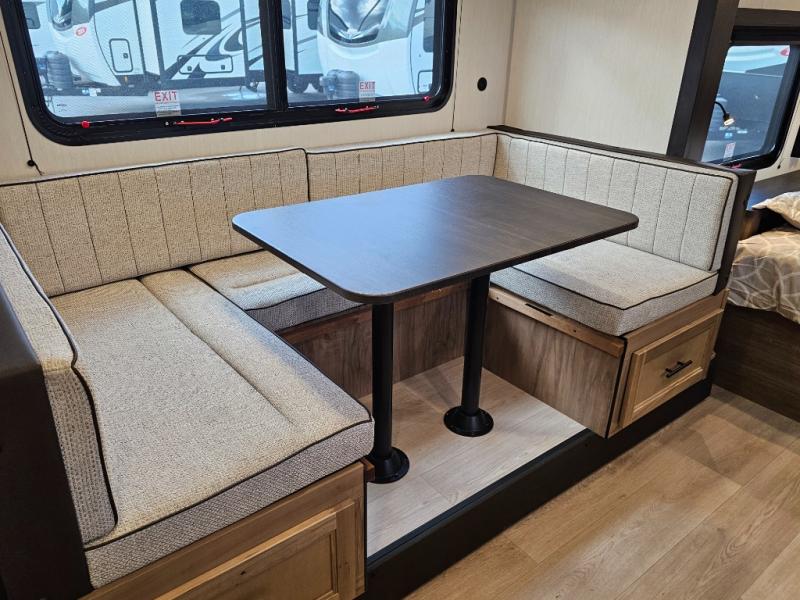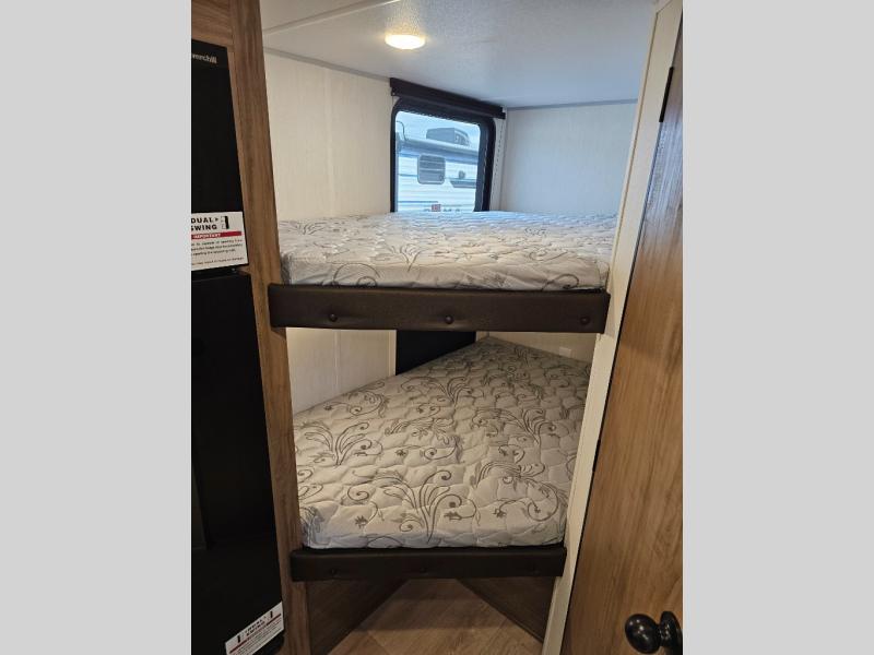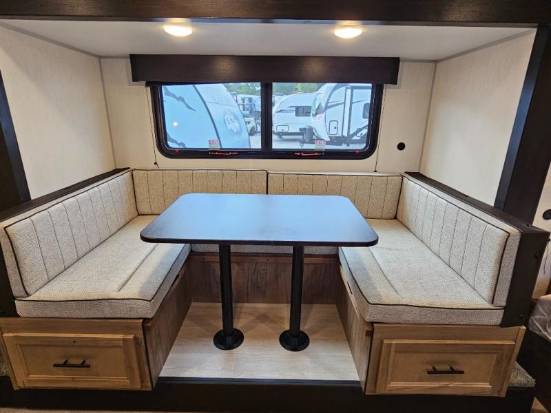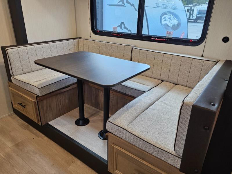 The Wolf Pup Black Label 17JWBL is a lightweight travel trailer that’s big on features, combining modern style with functional design. With double-size bunks, a queen bed, a versatile U-shaped dinette, and premium Black Label upgrades, this trailer is perfect for adventurous families who want comfort and convenience without sacrificing towability.