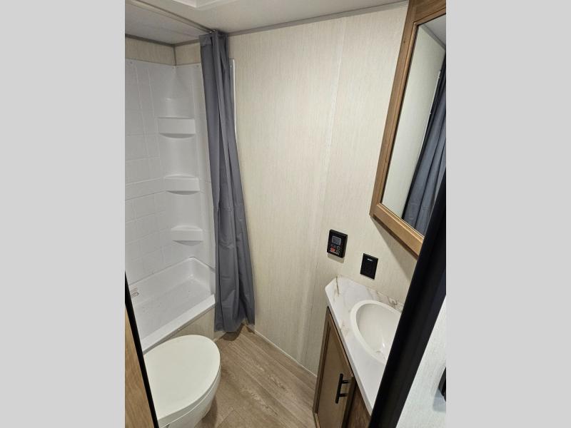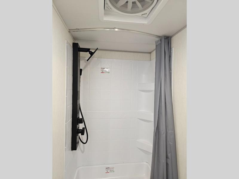 Full rear bath with shower, toilet, and robe hooks for added convenience