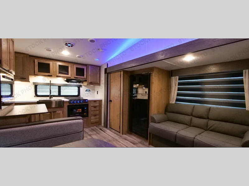 You will have the best camping trip in this fifth wheel starting with the rear kitchen which includes a pantry, and a refrigerator and sofa in a slide for more interior space. Enjoy your meals at the booth dinette then play a card game while you enjoy the fireplace next to it. You could even prepare your meals at the outside kitchen with an outside mount ready for you to hook up your TV. Freshen up each morning in the shower with a seat and head into the front private bedroom which has a queen bed with wardrobes on either side, a TV mount, and an area prepped to add an optional washer and dryer for clean clothes throughout your trip!