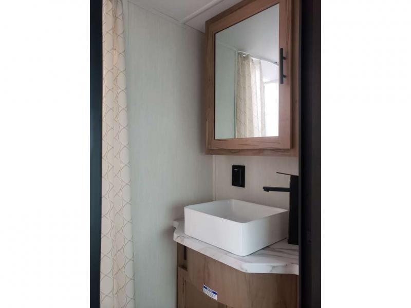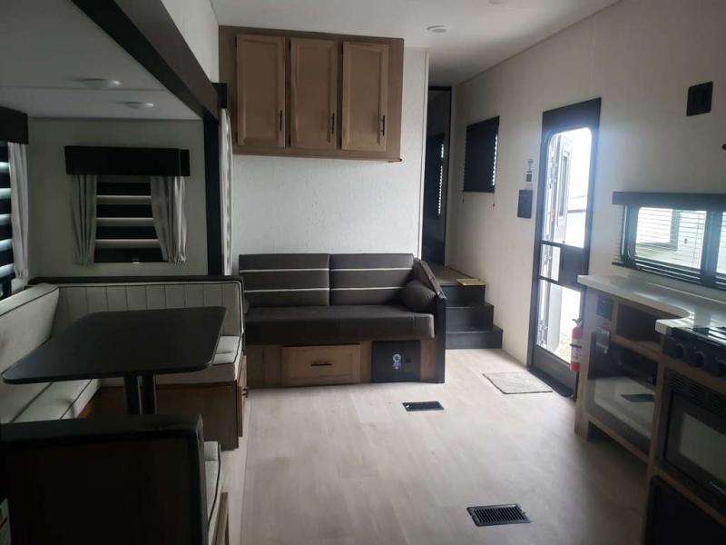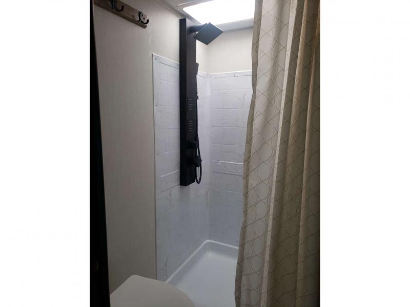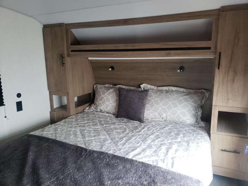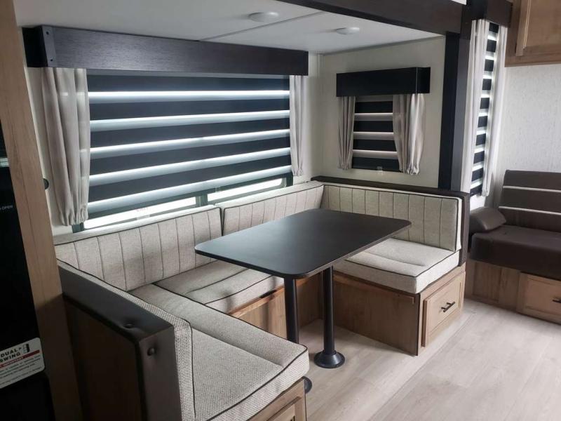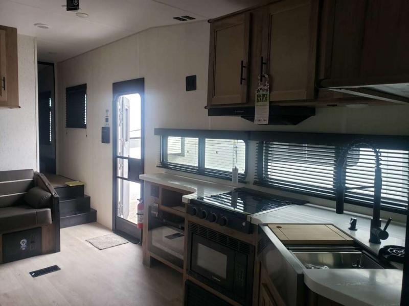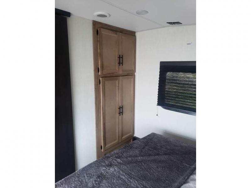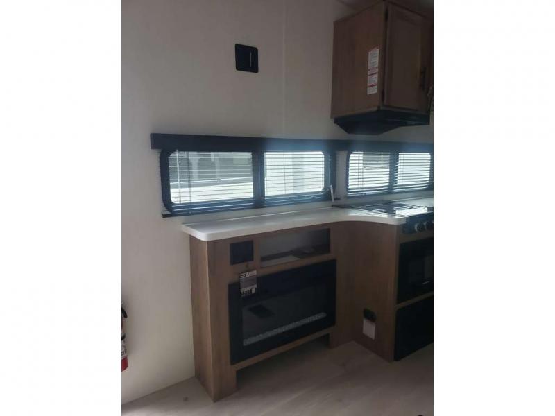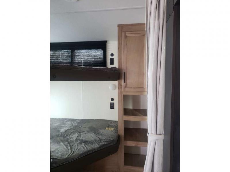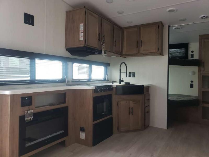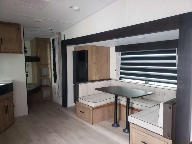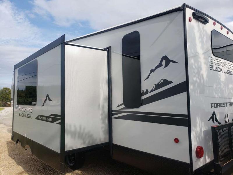 Perfect for your larger family, or one that likes to travel with friends, this Cherokee Black Label features double bed bunks, a queen bed in the front private bedroom, and a u-shaped dinette that can easily be converted to sleeping if needed. There is also a sofa in the combined living and kitchen area to accommodate all. When inside, the dinette is a great place to gather for meals or games, and between the dinette and sofa all can easily view the entertainment center with fireplace. The kitchen features everything you need to create meals as you vacation, and you also have a mini kitchen outside under the 15' awning where there is also a TV mount. The bathroom features a shower with a seat, a medicine cabinet above the vanity, and a toilet. In the front bedroom, you will enjoy a peaceful sleep each night on a queen bed with storage cabinets and a shelf overhead, plus nightstands on both sides of the bed as well. If you enjoy reading, there are also upgraded reading lights overhead on each side. Opposite the foot of the bed, a linen cabinet is available for storage or you can choose to add the optional washer/dryer in its place.