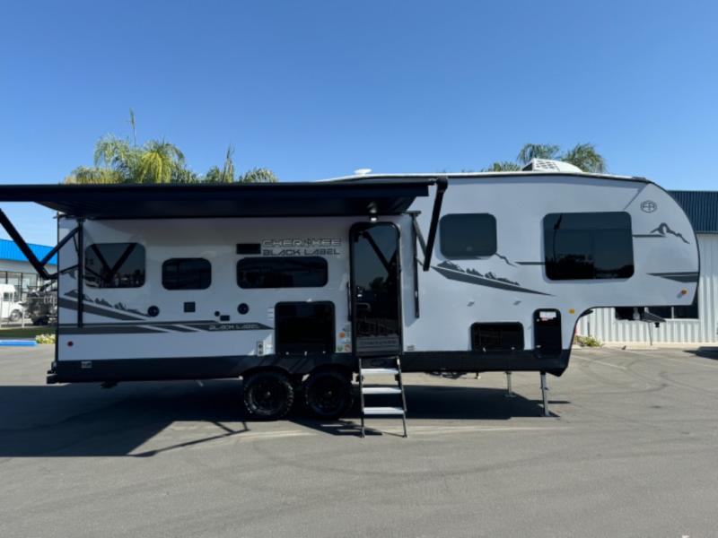 Take your adventures up a notch with the Cherokee Black Label by Forest River. There are a variety of models to choose from, including travel trailers, fifth wheels, destination trailers, and even a fifth wheel toy hauler to fit your needs best. You'll love the sleek hung fiberglass gel coat sided walls, along with the frameless window package and Thermo-Foil arctic insulation to help extend your camping season. Head inside to find upgraded solid surface countertops, upgraded reading lights, designer cushion fabric, and many more comforts.