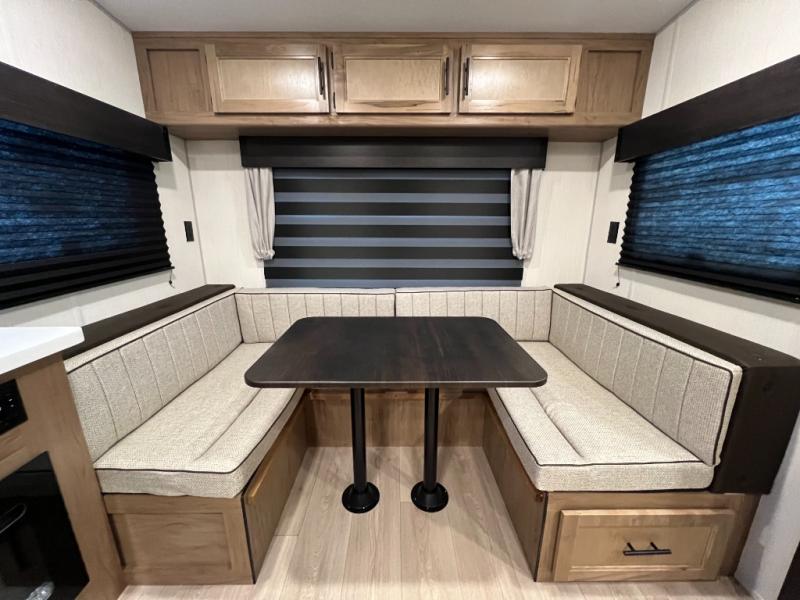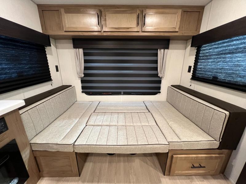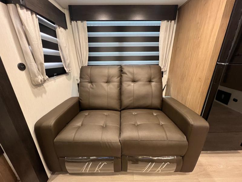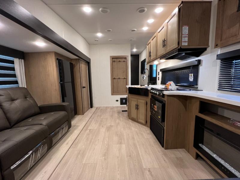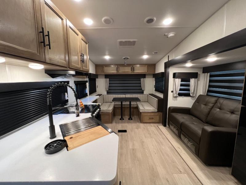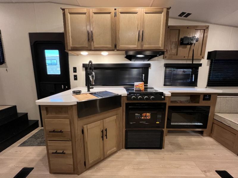 Camping trips are made complete in this fifth wheel! There is a large slide in the combined living area and kitchen, and here you'll find theater seating plus a pantry and a refrigerator for food storage. The rear U-shaped dinette provides more seating space, as well as dining and sleeping space for any guests you may have. The chef of your group will have all the appliances needed to cook meals, including an air fryer, although they may just find themselves cooking outdoors on the outside kitchen. A full bath will let you freshen up after a day at the lake, and the RV king bed is sure to provide a great night's rest. There are also dual wardrobes to keep your space tidy, along with a linen closet with a washer/dryer option!