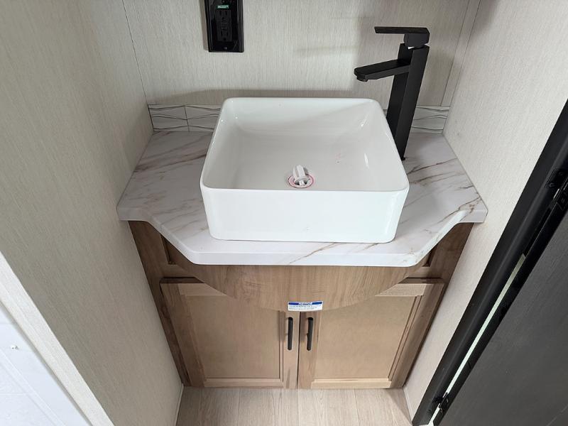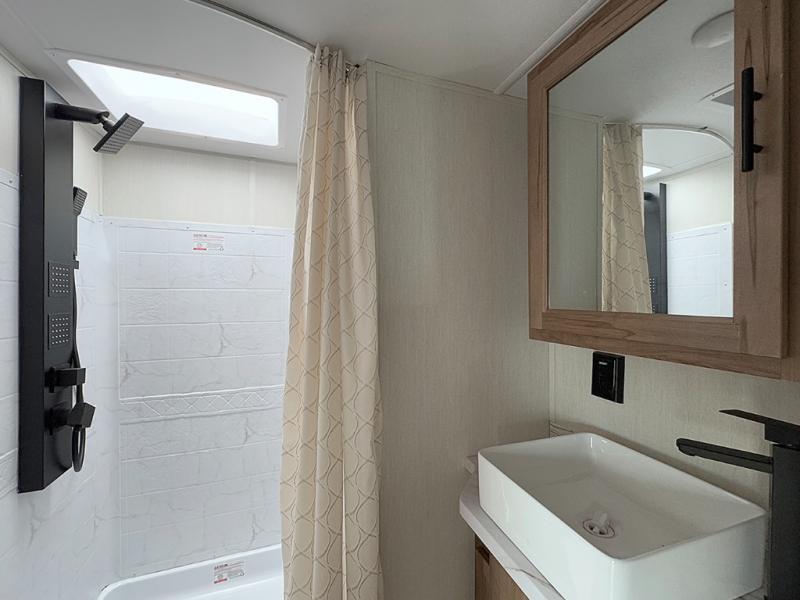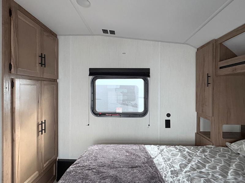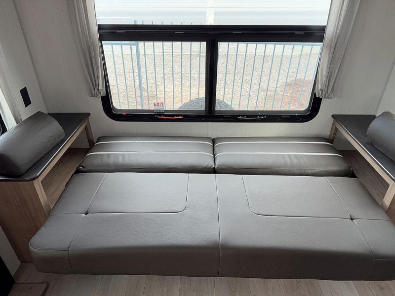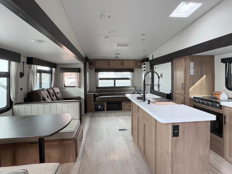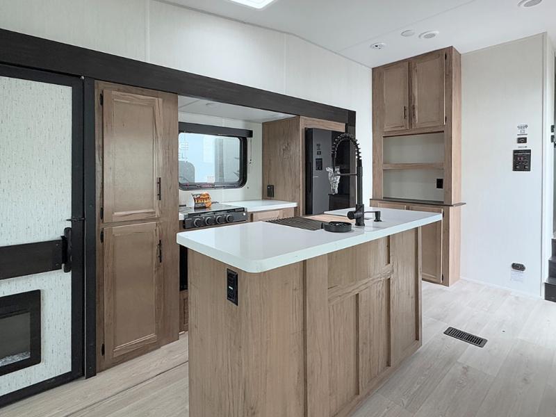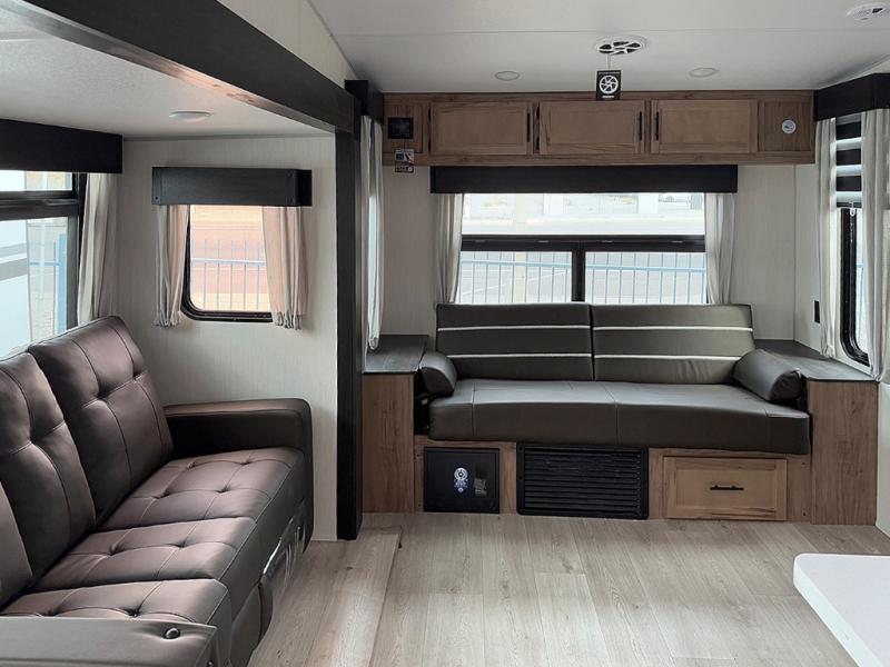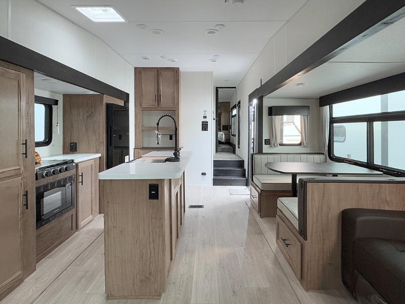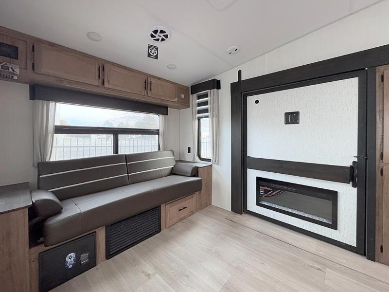 Camping trips are made complete in this spacious fifth wheel! There are dual opposing slides in the main living area plus a kitchen island for more counter space. The sofa, booth dinette, and theater seating provide comfortable seating spaces, and there is a fireplace with hidden shelves for smart storage solutions. The chef of your group will have all the appliances needed to cook meals, along with a hutch and pantry for even more storage. A full bath will let you freshen up after a day at the lake, and the RV king bed is sure to provide a great night's rest. There are also dual wardrobes to keep your space tidy, along with a linen closet with a washer/dryer option!