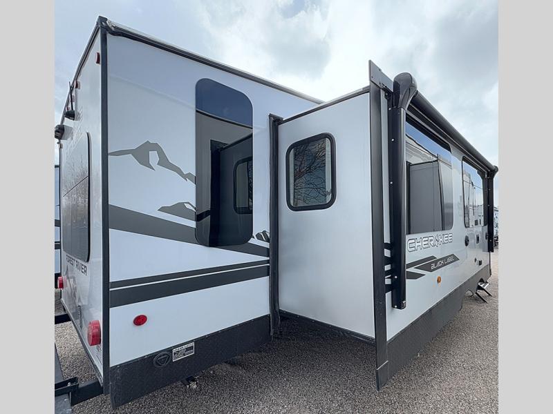 Take your adventures up a notch with the Cherokee Black Label by Forest River. There are a variety of models to choose from, including travel trailers, fifth wheels, destination trailers, and even a fifth wheel toy hauler to fit your needs best. You'll love the sleek hung fiberglass gel coat sided walls, along with the frameless window package and Thermo-Foil arctic insulation to help extend your camping season. Head inside to find upgraded solid surface countertops, upgraded reading lights, designer cushion fabric, and many more comforts.