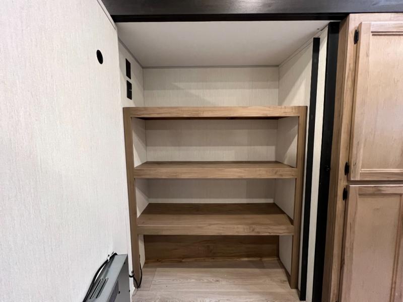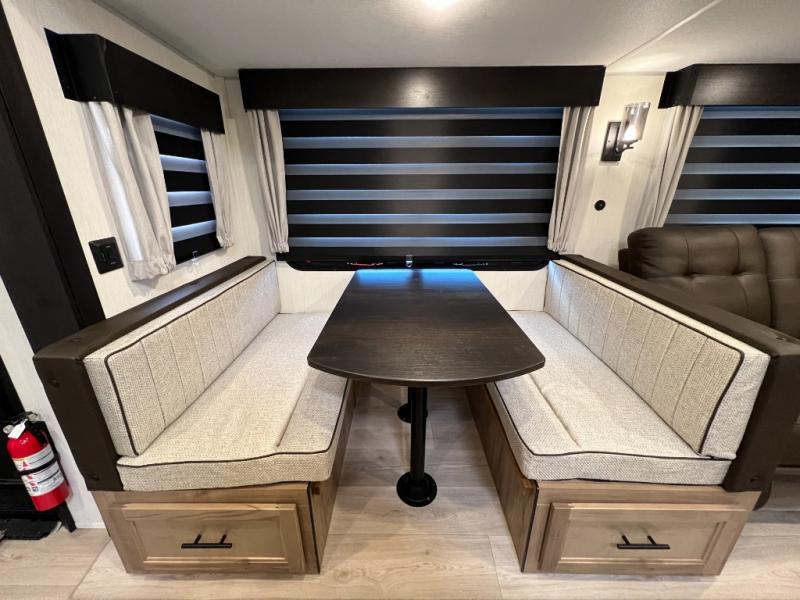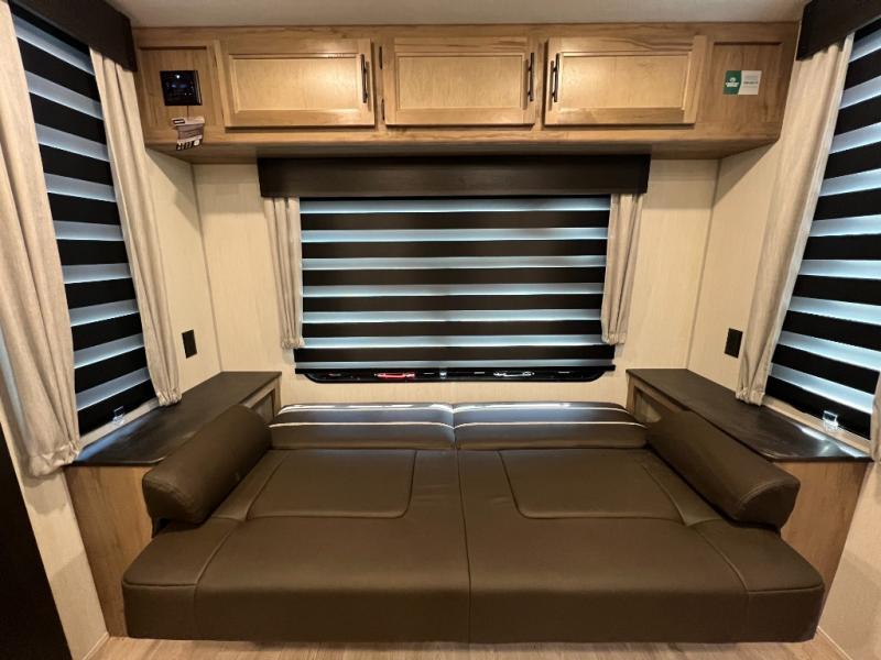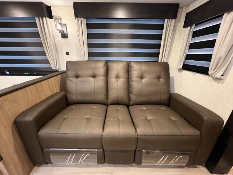 Camping trips are made complete in this spacious fifth wheel! There are dual opposing slides in the main living area plus a kitchen island for more counter space. The sofa, booth dinette, and theater seating provide comfortable seating spaces, and there is a fireplace with hidden shelves for smart storage solutions. The chef of your group will have all the appliances needed to cook meals, along with a hutch and pantry for even more storage. A full bath will let you freshen up after a day at the lake, and the RV king bed is sure to provide a great night's rest. There are also dual wardrobes to keep your space tidy, along with a linen closet with a washer/dryer option!