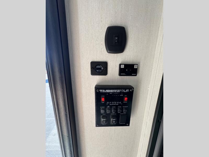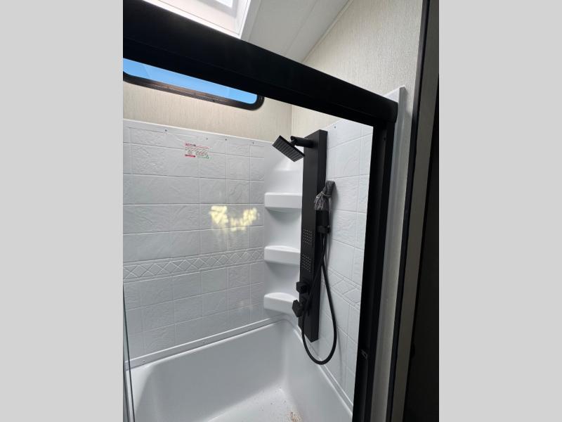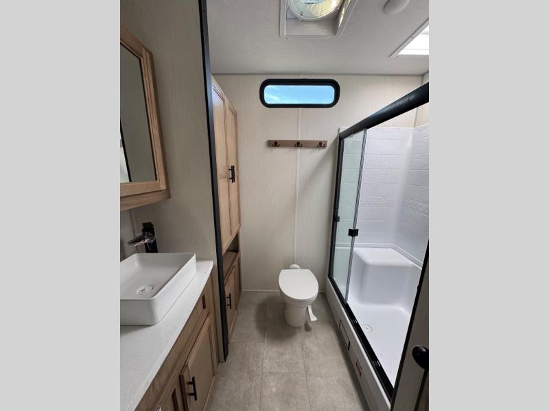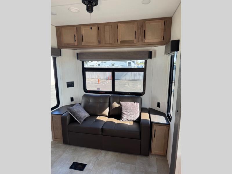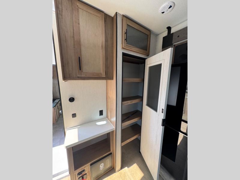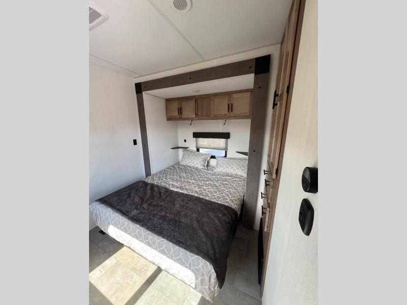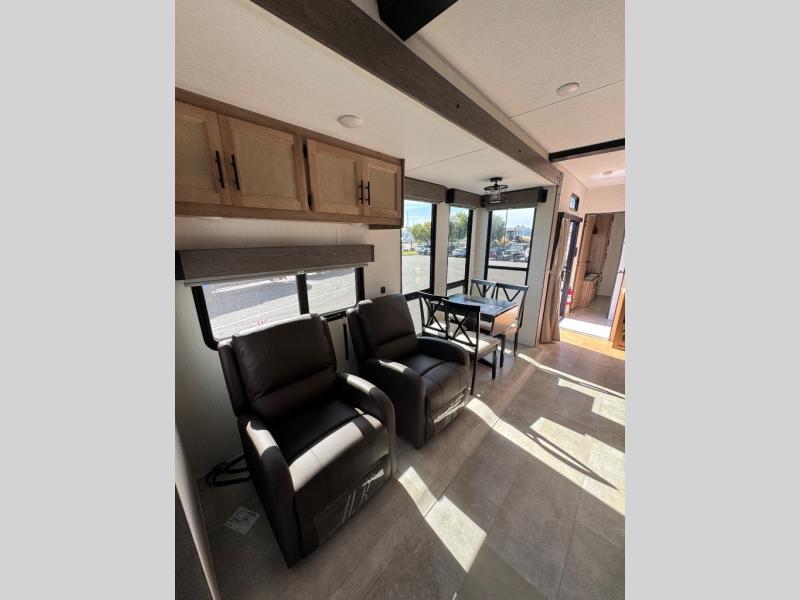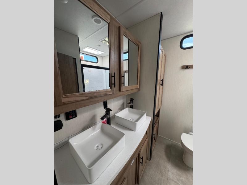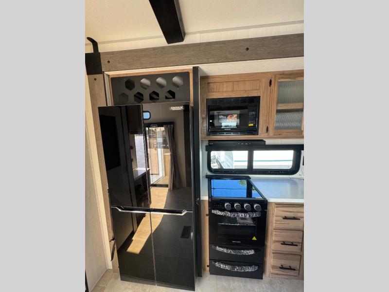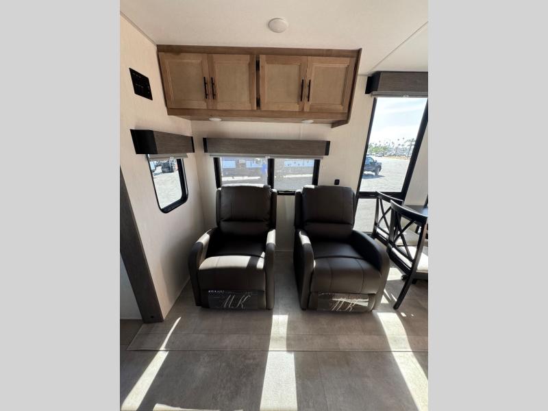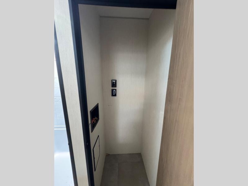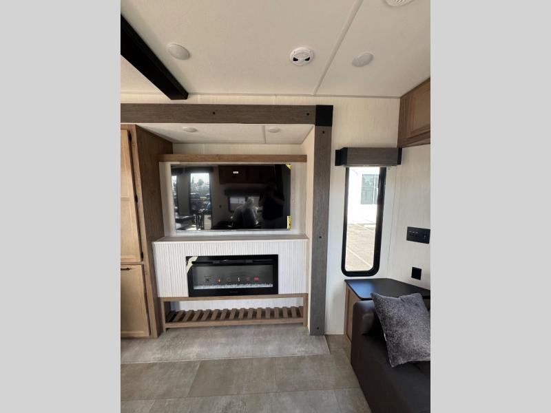 Spacious and comfortable describe this destination travel trailer featuring triple slides with dual opposing slides in the living area which creates a wide open space for a dining table and four chairs, two lounge chairs, an entertainment center with a fireplace, and a sofa along the very front wall. The roadside slide also houses the kitchen appliances which include a refrigerator, stove and microwave oven. There is a pantry and a hutch adjacent to the slide, and a kitchen island for more food prep space, and this is where your sink is located so you can be facing all of the seating areas in the room while prepping meals and doing the dishes. A centrally located half bath is convenient just inside the main patio door entry. Towards the rear of the coach, a private bedroom featuring comfortable sleeping along with storage space for your clothing. In the very back, a master suite bath featuring a vanity with dual sinks, a shower with a seat, linen storage, and a wardrobe that has been prepped for a stackable washer and dryer if you choose to add. You will love the outside TV mount and 21' covered awning space to create a nice size outdoor living area to enjoy on sunny days or pleasant evenings.