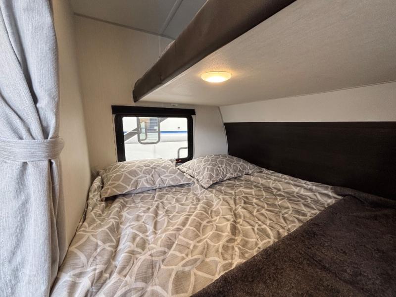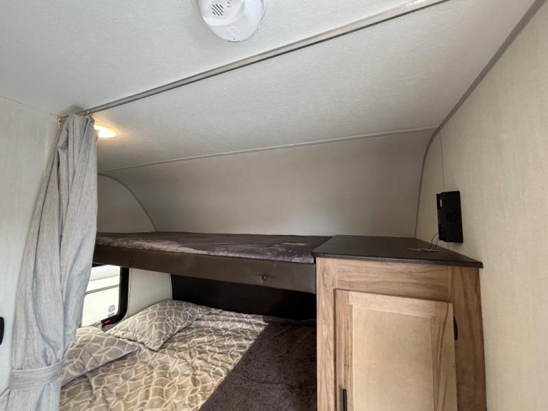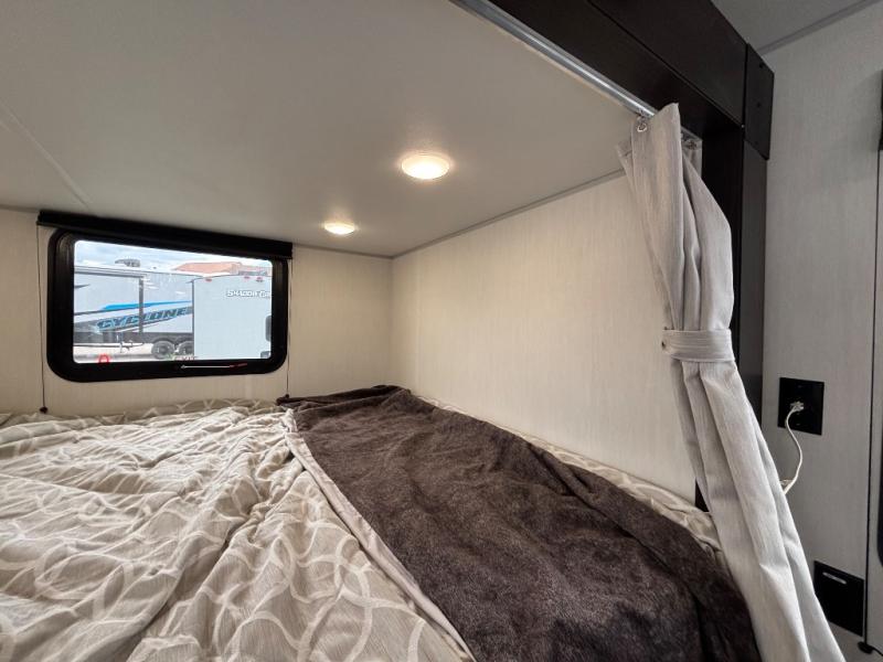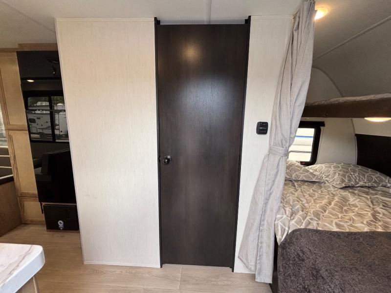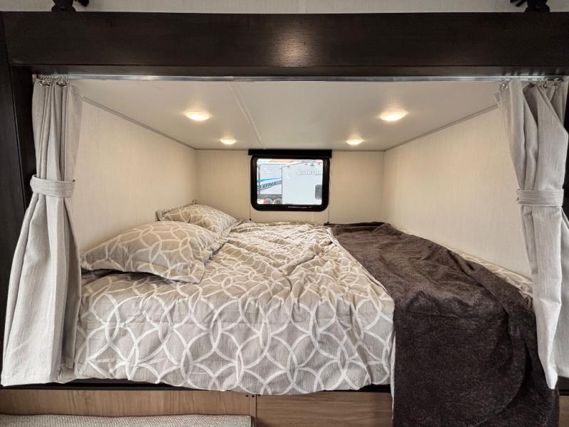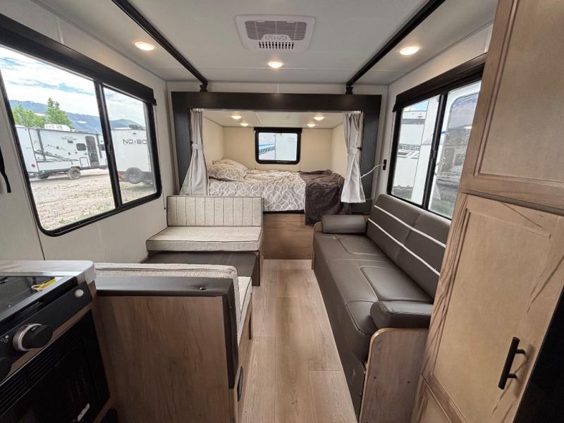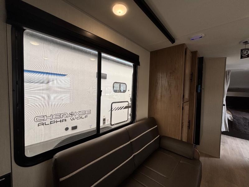 A family of seven or eight can enjoy many outdoor adventures in this Cherokee Grey Wolf travel trailer which features two queen beds and a bunk above the front bed. With the rear queen bed slide, you gain sleeping space without having additional tow length added. You will find large overhead cabinets inside, a pantry to bring along your favorite snacks, and a wardrobe for keeping your clothes wrinkle free. There is a booth dinette for you to enjoy your meals at or play some card games, and there is also a sofa for those who just want to sit back and watch. A conveniently located bathroom that sits directly across from the main entry makes it easy to access from outside. There is also a nice 15' power awning for creating additional living space so that you can enjoy the outdoors whether rain or shine!
