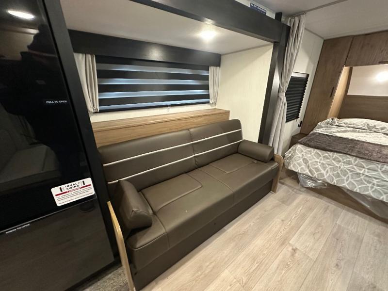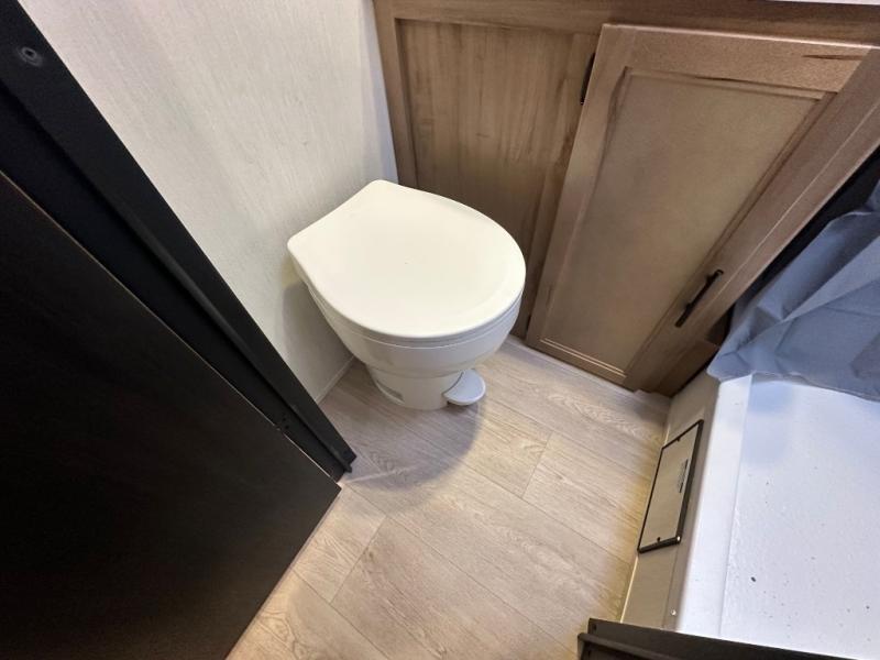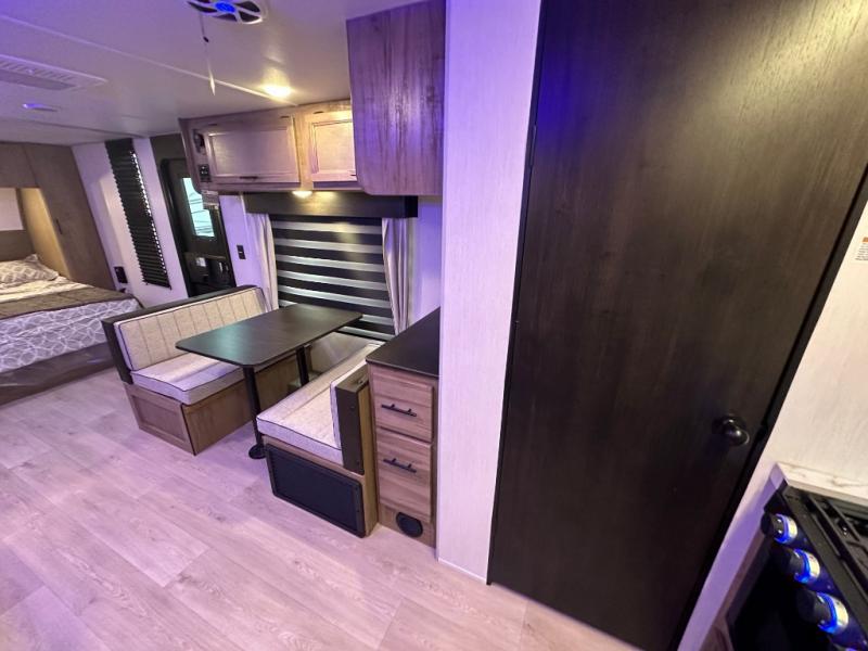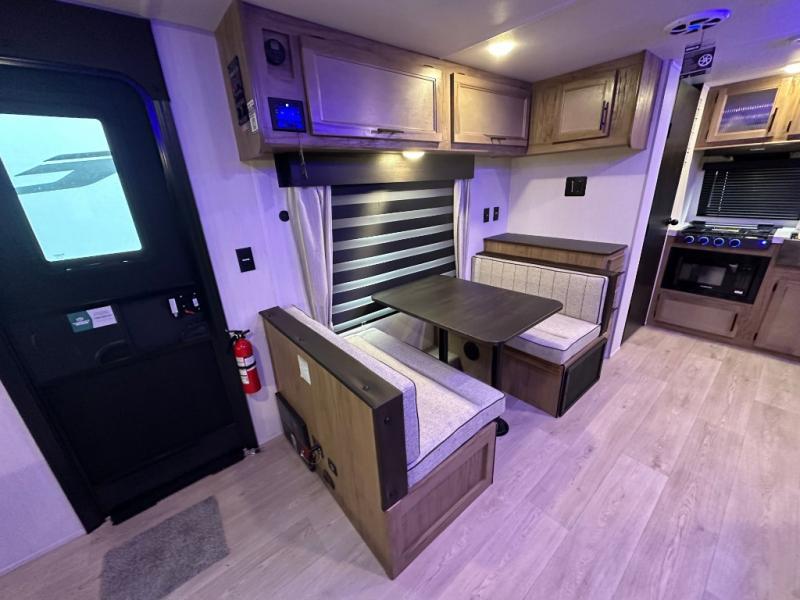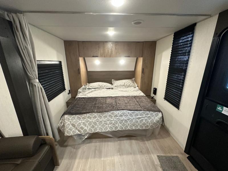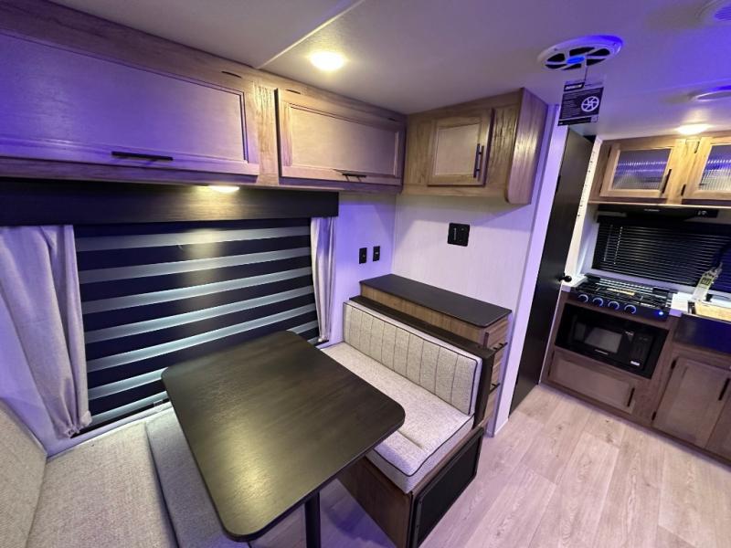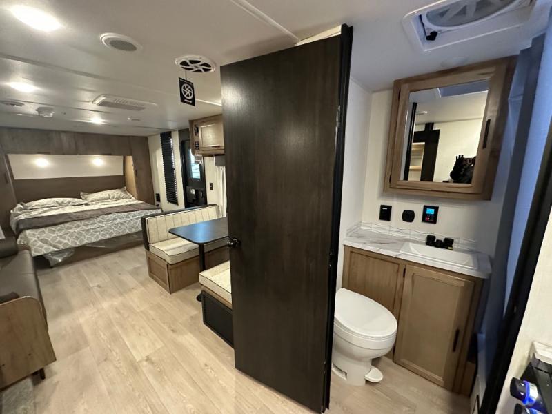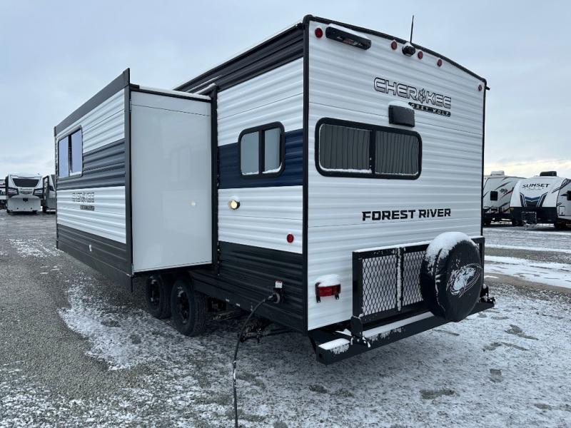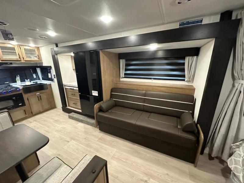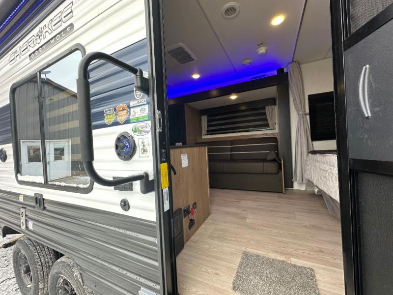 You will love traveling with this Cherokee Grey Wolf in tow. This is a great unit for a couple or family as the booth dinette and sofa can both be used for added sleeping for children or quests if needed. There is a comfortable RV king bed up front that you will love for a great night's rest with storage space in nightstands and wardrobes for your clothing and things on either side of the bed. A cooktop and air fryer is available for cooking inside, and the rear corner bath includes a tub/shower, toilet and sink. A nice 15' awning creates more outdoor living space to enjoy protected from the elements both day and night with an LED light strip for after dark. You can also add a TV on the exterior as it has an outside TV mount.