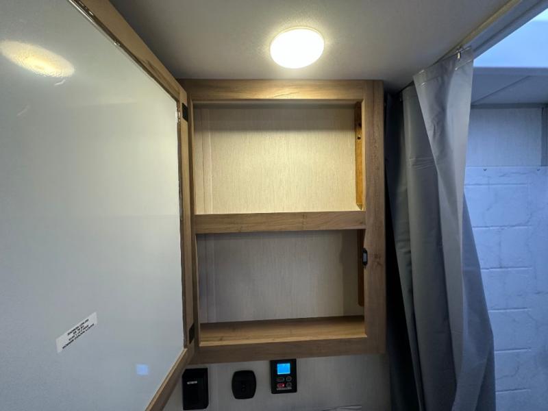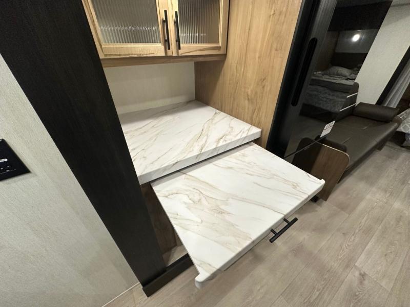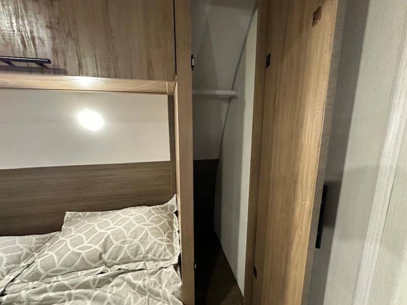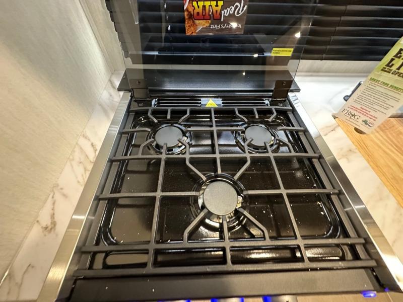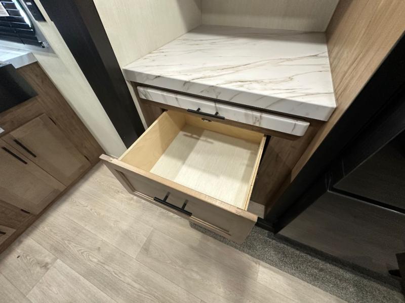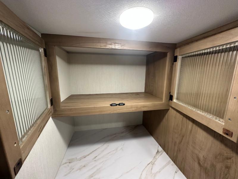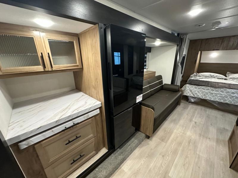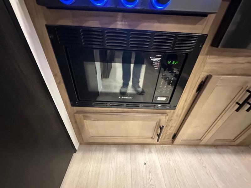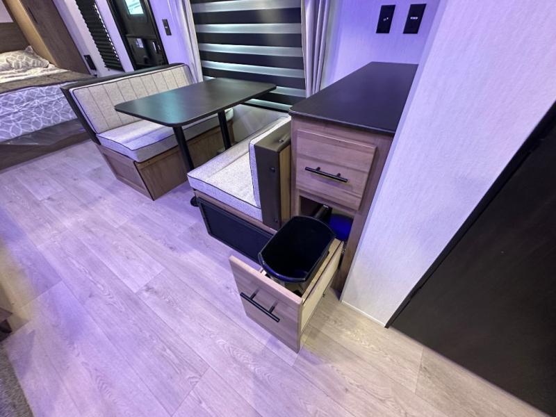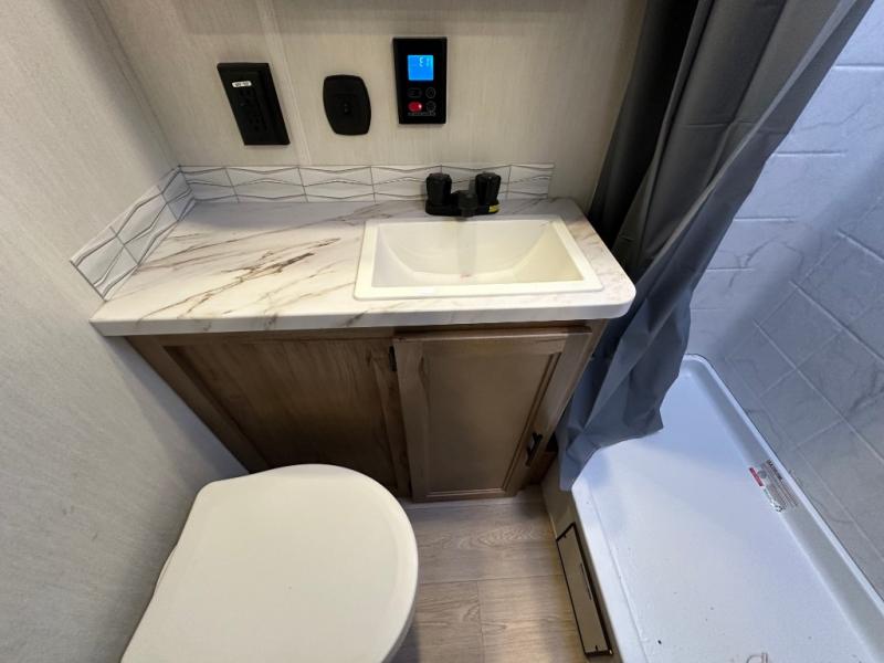 You will love traveling with this Cherokee Grey Wolf in tow. This is a great unit for a couple or family as the booth dinette and sofa can both be used for added sleeping for children or quests if needed. There is a comfortable RV king bed up front that you will love for a great night's rest with storage space in nightstands and wardrobes for your clothing and things on either side of the bed. A cooktop and air fryer is available for cooking inside, and the rear corner bath includes a tub/shower, toilet and sink. A nice 15' awning creates more outdoor living space to enjoy protected from the elements both day and night with an LED light strip for after dark. You can also add a TV on the exterior as it has an outside TV mount.