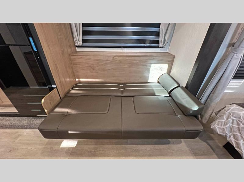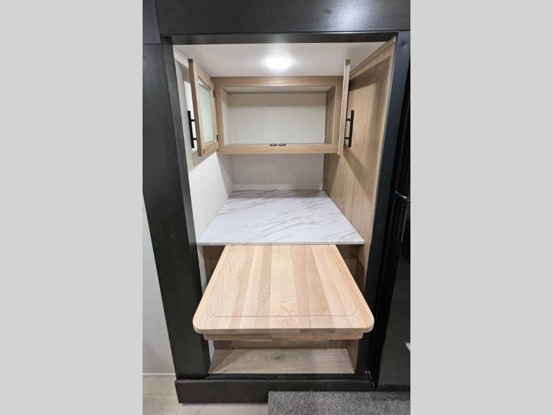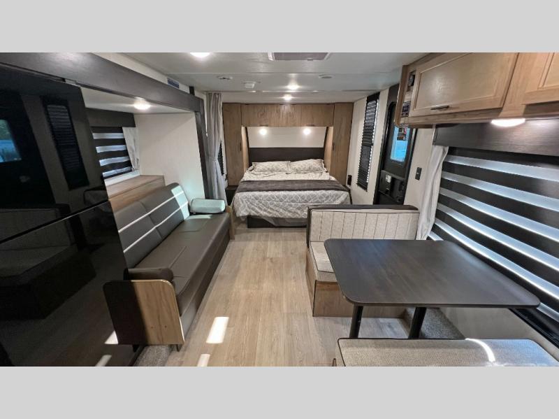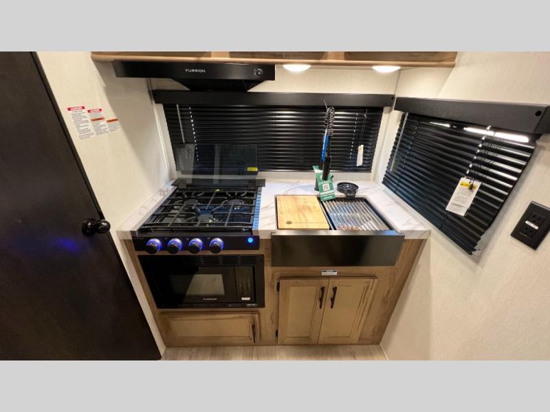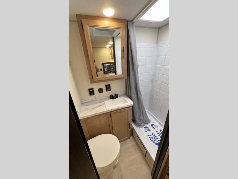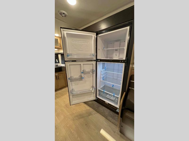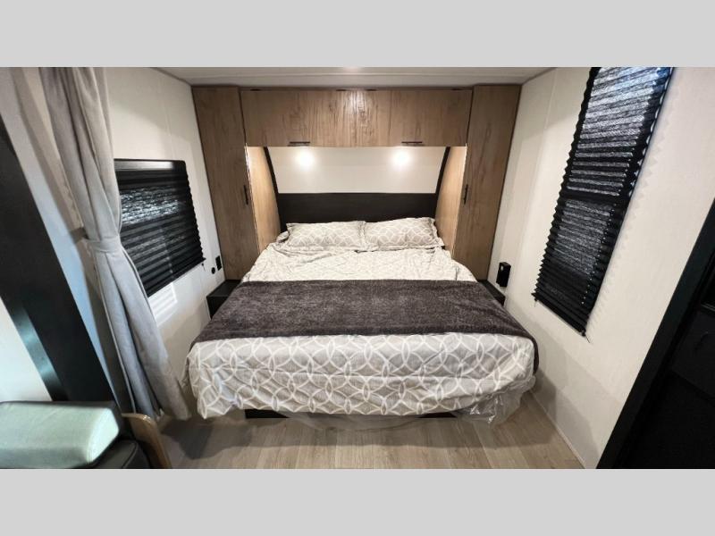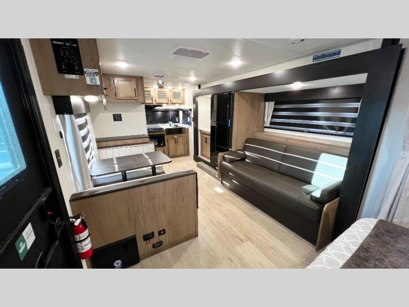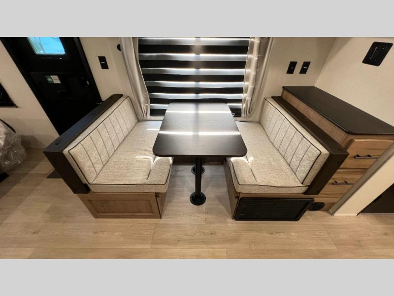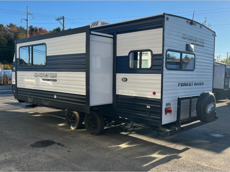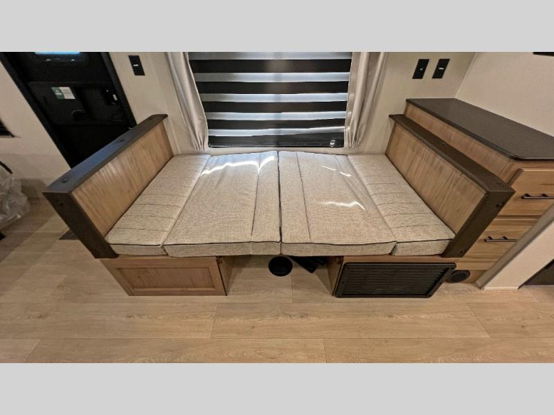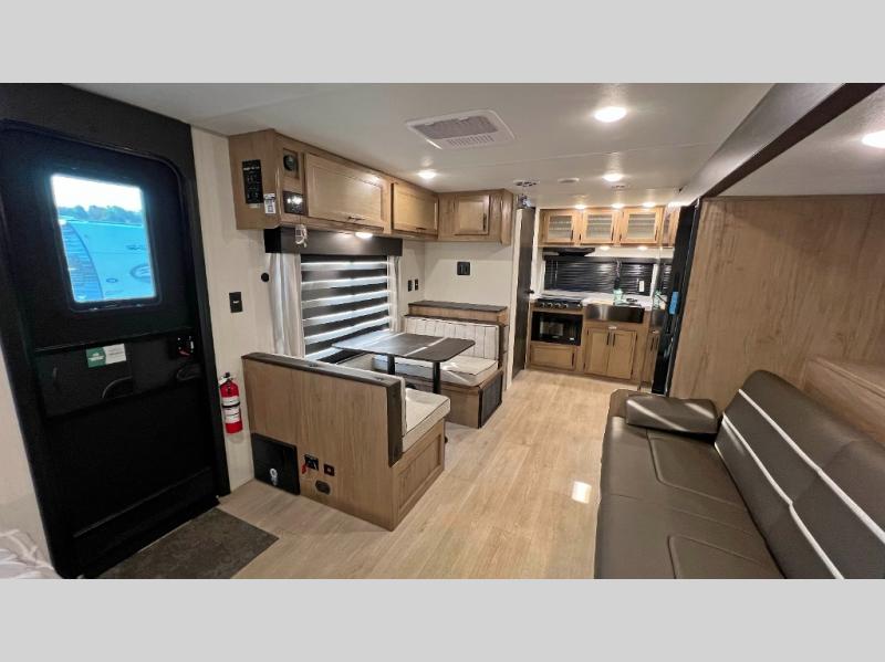 You will love traveling with this Cherokee Grey Wolf in tow. This is a great unit for a couple or family as the booth dinette and sofa can both be used for added sleeping for children or quests if needed. There is a comfortable RV king bed up front that you will love for a great night's rest with storage space in nightstands and wardrobes for your clothing and things on either side of the bed. A cooktop and air fryer is available for cooking inside, and the rear corner bath includes a tub/shower, toilet and sink. A nice 15' awning creates more outdoor living space to enjoy protected from the elements both day and night with an LED light strip for after dark. You can also add a TV on the exterior as it has an outside TV mount.