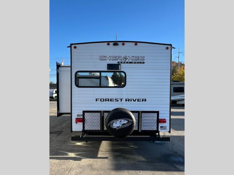 Whether it's a journey that will take you to new locations or a tried-and-true getaway to that favorite and memorable destination, the Forest River Cherokee Grey Wolf travel trailers and toy haulers are going to make the trip worth it every single time! You can travel in confidence with the premium wheel package, seamless roofing membrane with heat reflectivity, Power Gear frame technology with space-saver rail design, and Cherokee back-up camera system. The Cherokee Grey Wolf's interior is highly attractive with its stainless steel kitchen suite package and premium bedding ensemble and comforter, and 8" ceiling-mounted subwoofer with accent lighting. You will also find a black waste tank flush-out kit, an outside shower with hot and cold water, an armored underbelly tank enclosure, and an RV grill quick connect.