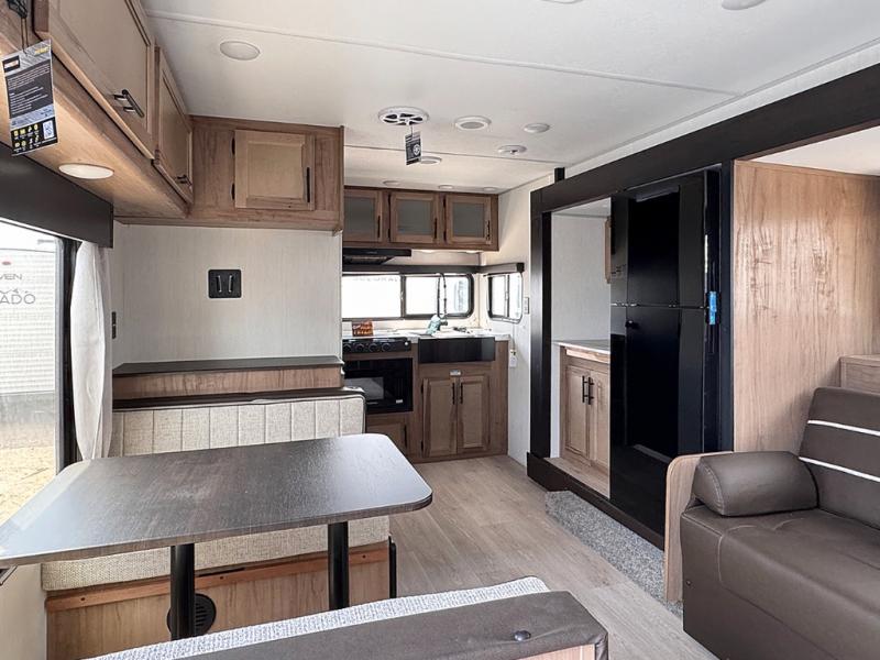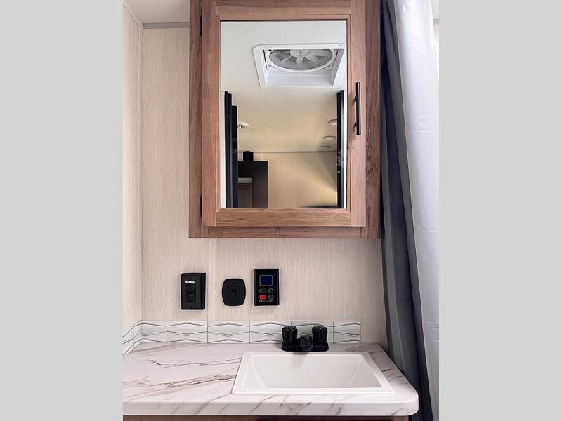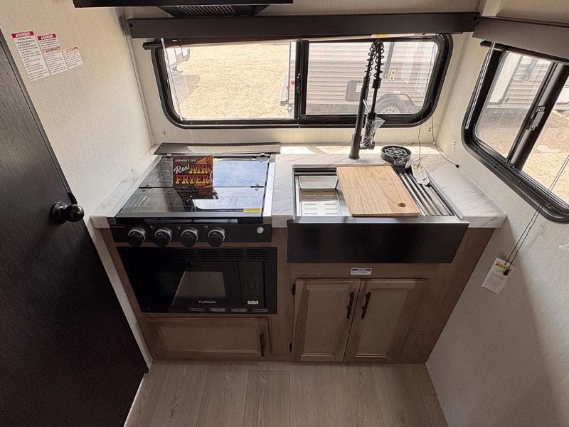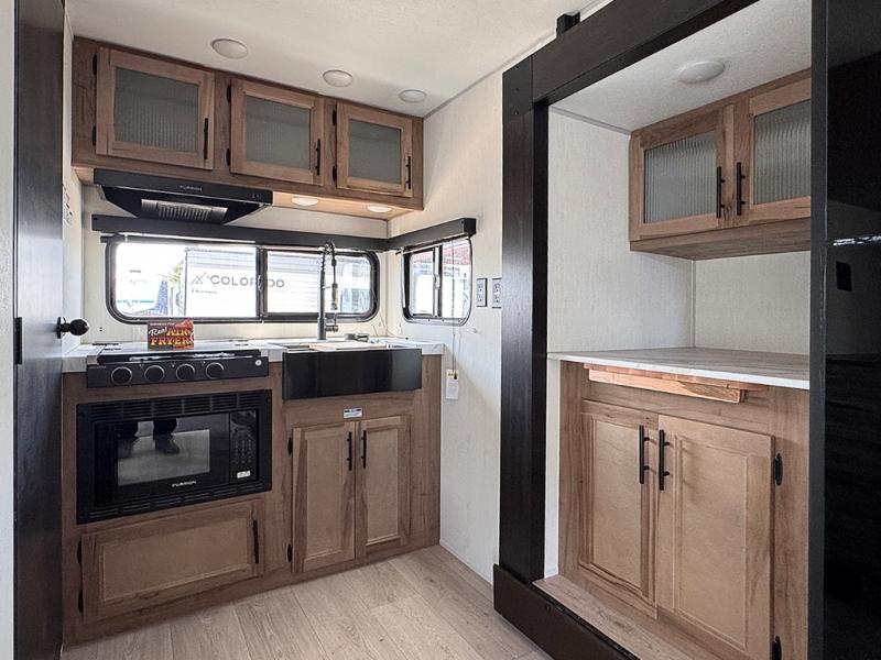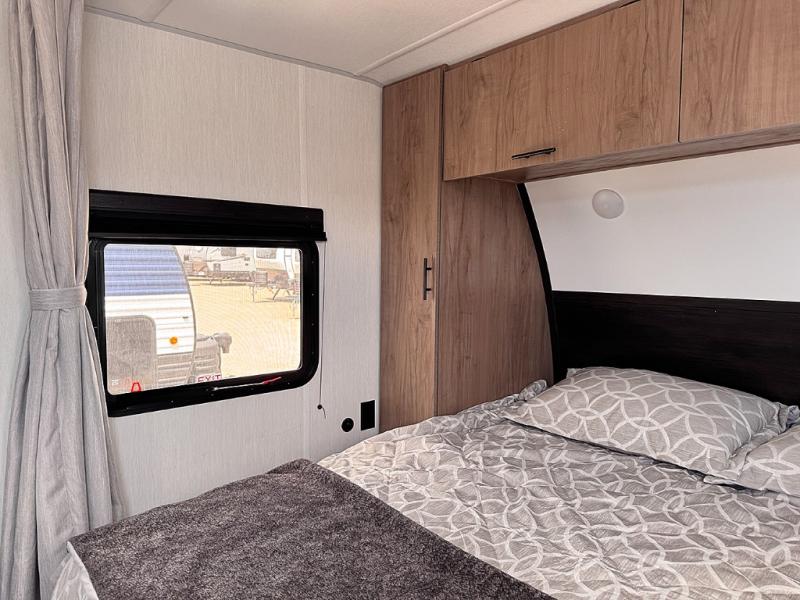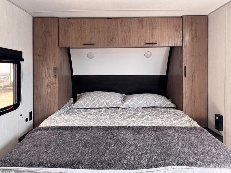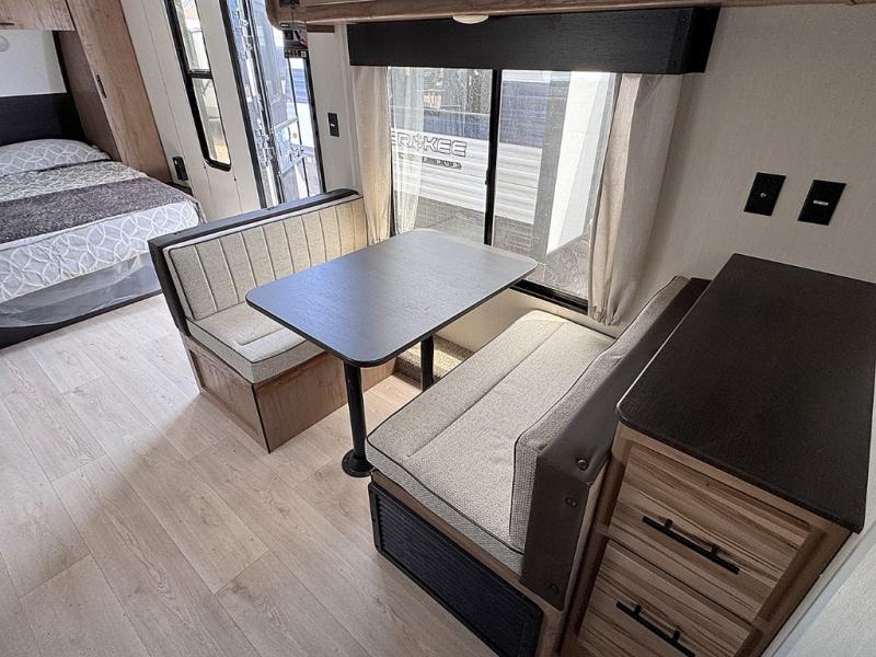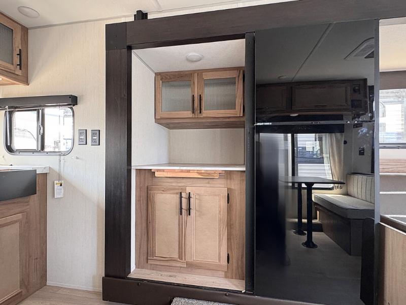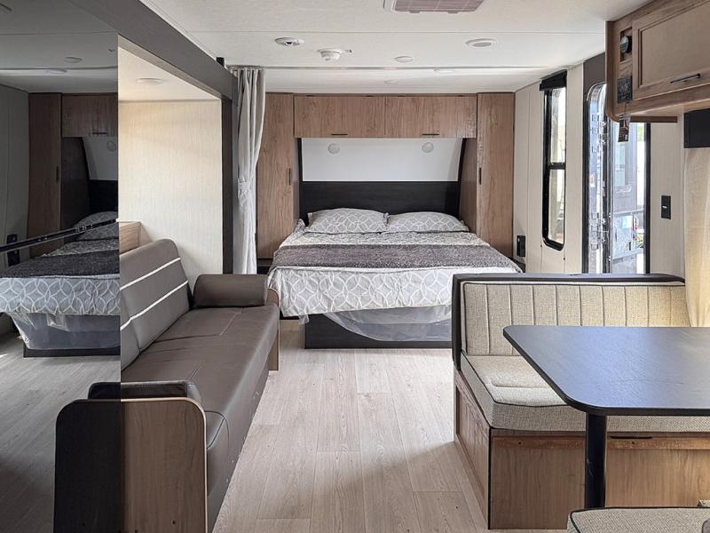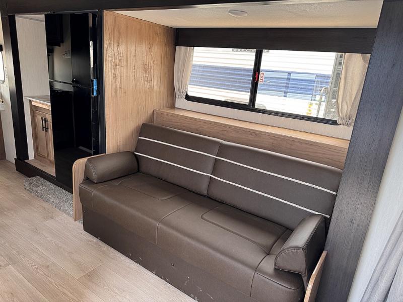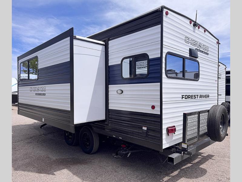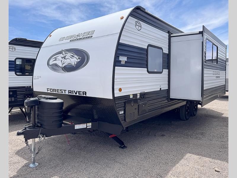 You will love traveling with this Cherokee Grey Wolf in tow. This is a great unit for a couple or family as the booth dinette and sofa can both be used for added sleeping for children or quests if needed. There is a comfortable RV king bed up front that you will love for a great night's rest with storage space in nightstands and wardrobes for your clothing and things on either side of the bed. A cooktop and air fryer is available for cooking inside, and the rear corner bath includes a tub/shower, toilet and sink. A nice 15' awning creates more outdoor living space to enjoy protected from the elements both day and night with an LED light strip for after dark. You can also add a TV on the exterior as it has an outside TV mount.