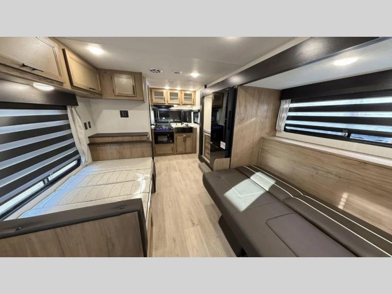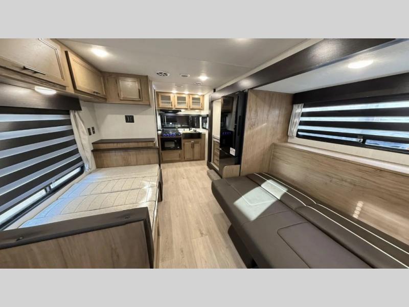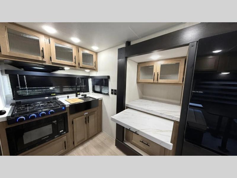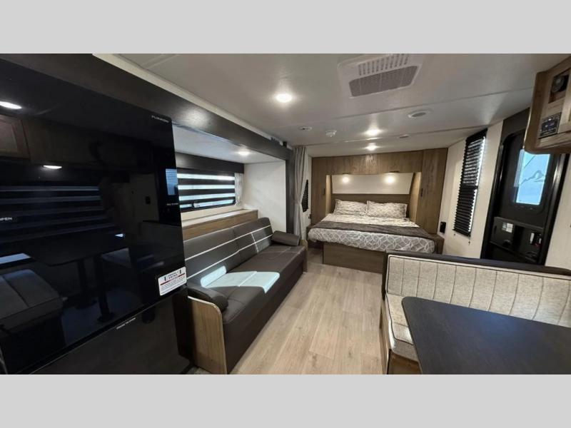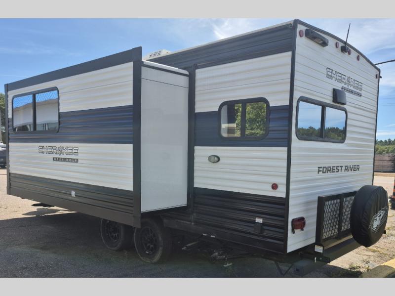 You will love traveling with this Cherokee Grey Wolf in tow. This is a great unit for a couple or family as the booth dinette and sofa can both be used for added sleeping for children or quests if needed. There is a comfortable RV king bed up front that you will love for a great night's rest with storage space in nightstands and wardrobes for your clothing and things on either side of the bed. A cooktop and air fryer is available for cooking inside, and the rear corner bath includes a tub/shower, toilet and sink. A nice 15' awning creates more outdoor living space to enjoy protected from the elements both day and night with an LED light strip for after dark. You can also add a TV on the exterior as it has an outside TV mount.