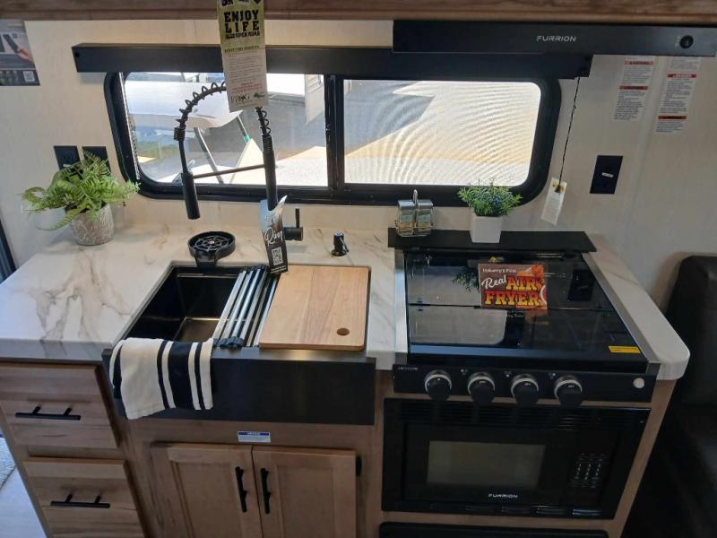 You will love this Cherokee Grey Wolf toy hauler with a rear ramp door for loading and unloading your toys and gear. If you position the fold-down sofas up against the wall, you will have even more room for extra gear when you are moving down the road. Set up camp and easily create a great dining area with the removable table between each fold-down sofa. You can also create your best meals in a breeze with the airy fryer or cooktop. A large pantry allows you to pack all of the snacks and canned goods you need for your adventure. You will appreciate the master suite up front for a great night's rest on the RV king bed along with easy access into the dual-entry bath.