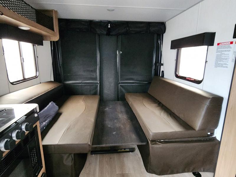 You will love this Cherokee Grey Wolf toy hauler with a rear ramp door for loading and unloading your toys and gear. If you position the fold-down sofas up against the wall, you will have even more room for extra gear when you are moving down the road. Set up camp and easily create a great dining area with the removable table between each fold-down sofa. You can also create your best meals in a breeze with the airy fryer or cooktop. A large pantry allows you to pack all of the snacks and canned goods you need for your adventure. You will appreciate the master suite up front for a great night's rest on the RV king bed along with easy access into the dual-entry bath.