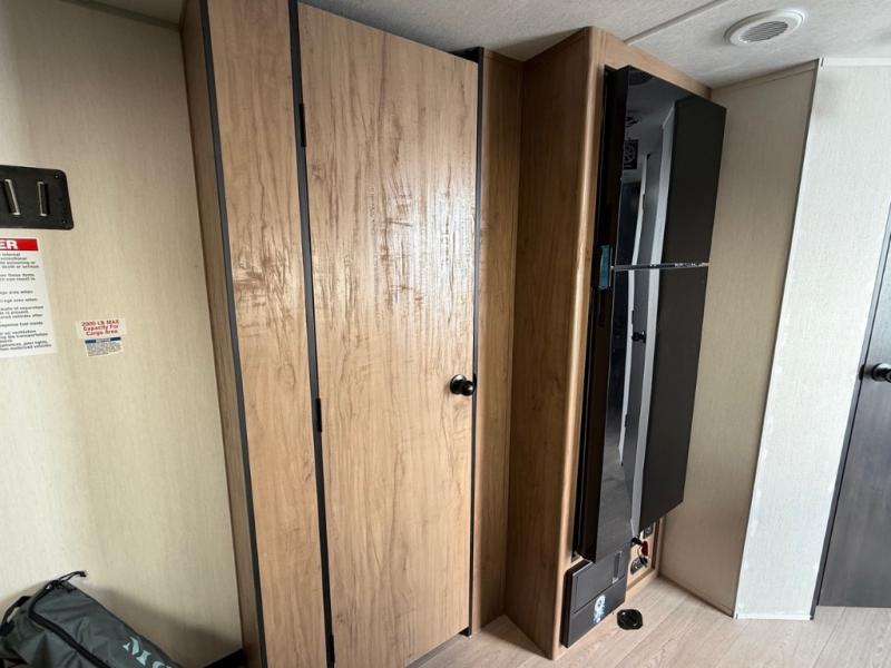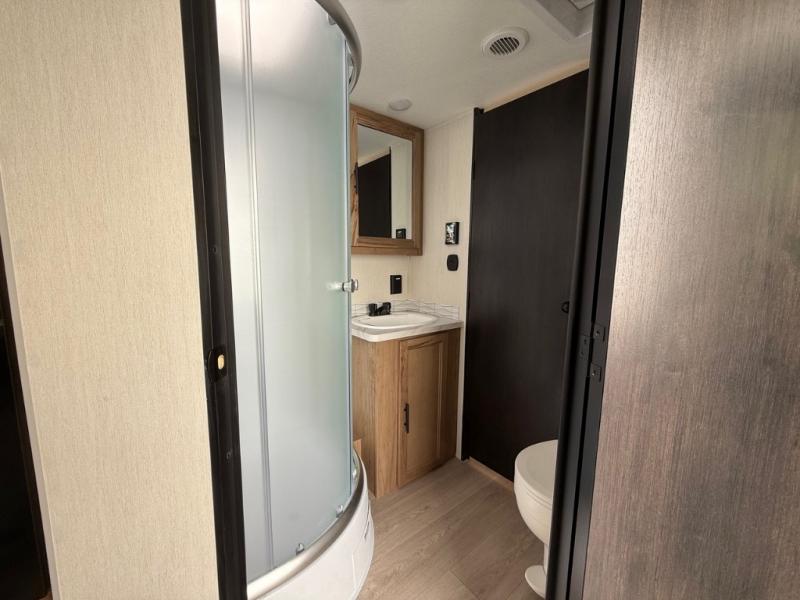 You will love this Cherokee Grey Wolf toy hauler with a rear ramp door for loading and unloading your toys and gear. If you position the fold-down sofas up against the wall, you will have even more room for extra gear when you are moving down the road. Set up camp and easily create a great dining area with the removable table between each fold-down sofa. You can also create your best meals in a breeze with the airy fryer or cooktop. A large pantry allows you to pack all of the snacks and canned goods you need for your adventure. You will appreciate the master suite up front for a great night's rest on the RV king bed along with easy access into the dual-entry bath.