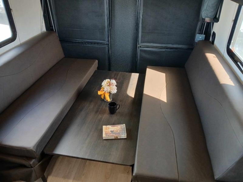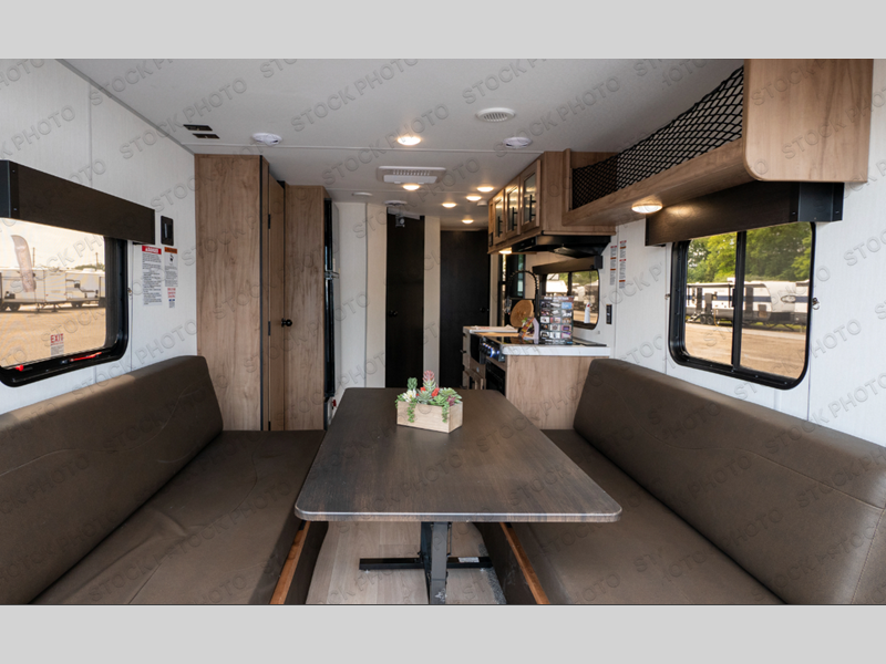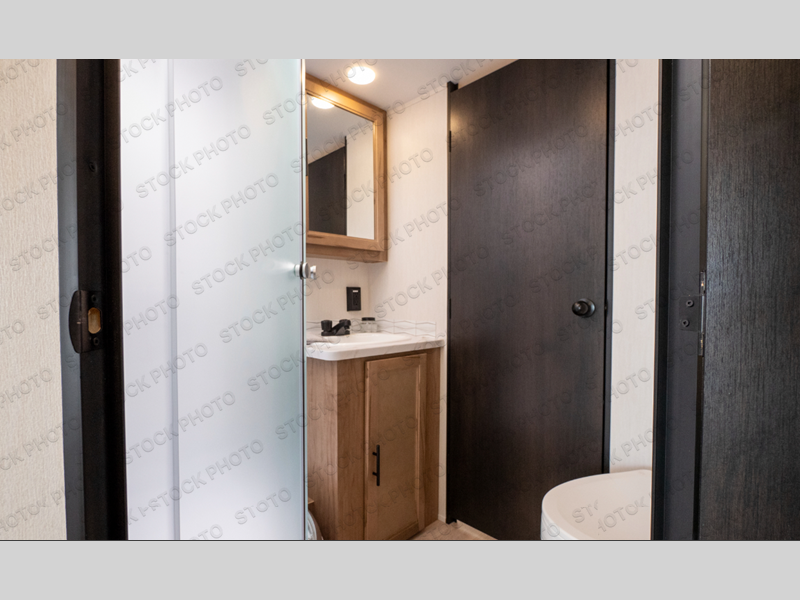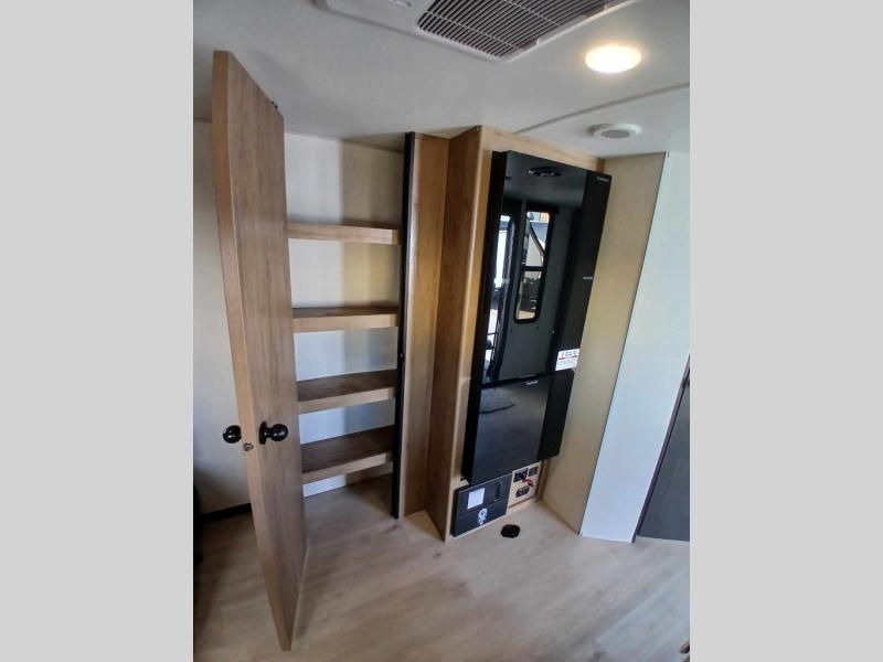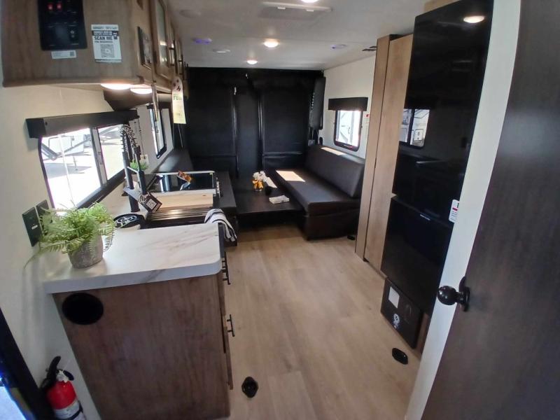 You will love this Cherokee Grey Wolf toy hauler with a rear ramp door for loading and unloading your toys and gear. If you position the fold-down sofas up against the wall, you will have even more room for extra gear when you are moving down the road. Set up camp and easily create a great dining area with the removable table between each fold-down sofa. You can also create your best meals in a breeze with the airy fryer or cooktop. A large pantry allows you to pack all of the snacks and canned goods you need for your adventure. You will appreciate the master suite up front for a great night's rest on the RV king bed along with easy access into the dual-entry bath.