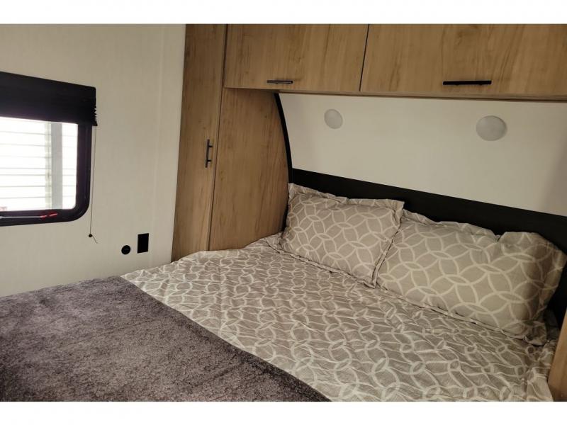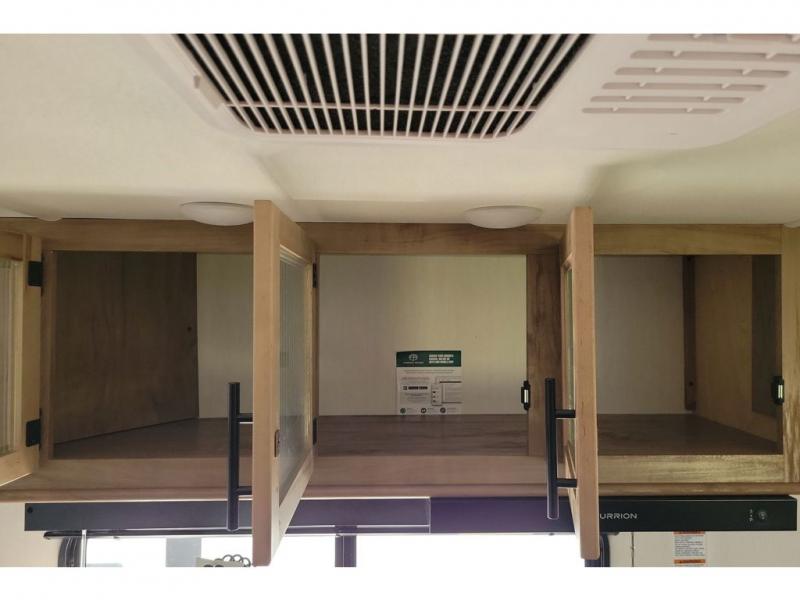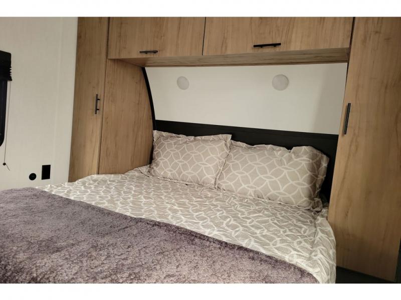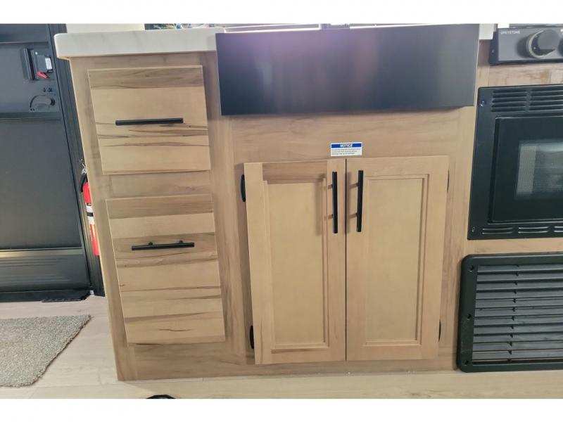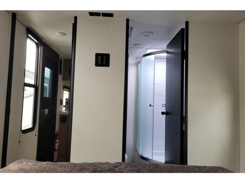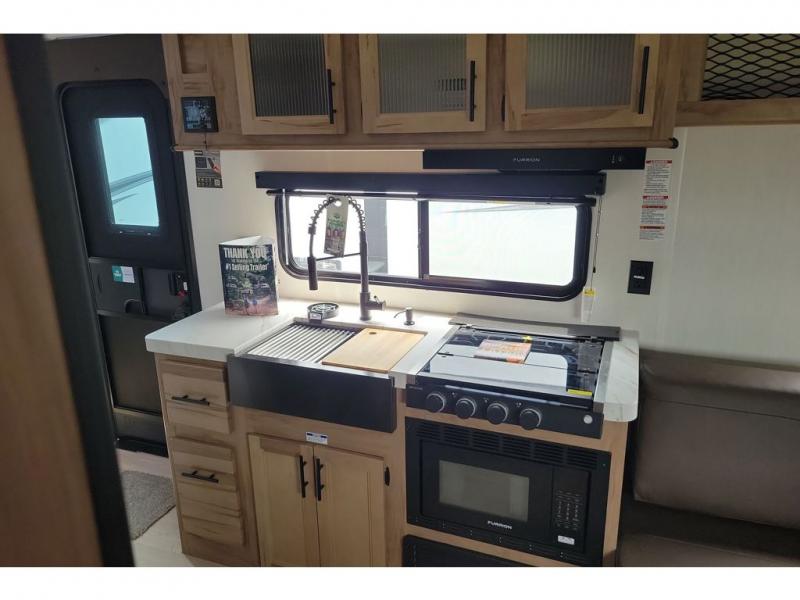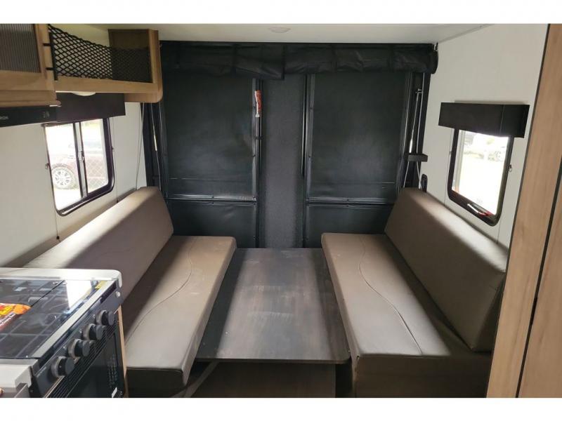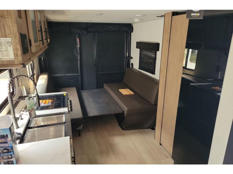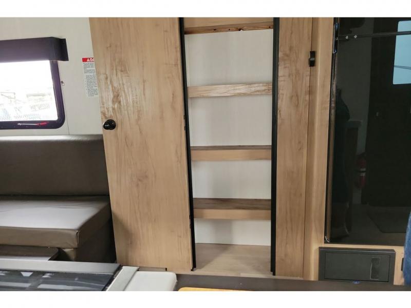 You will love this Cherokee Grey Wolf toy hauler with a rear ramp door for loading and unloading your toys and gear. If you position the fold-down sofas up against the wall, you will have even more room for extra gear when you are moving down the road. Set up camp and easily create a great dining area with the removable table between each fold-down sofa. You can also create your best meals in a breeze with the airy fryer or cooktop. A large pantry allows you to pack all of the snacks and canned goods you need for your adventure. You will appreciate the master suite up front for a great night's rest on the RV king bed along with easy access into the dual-entry bath.