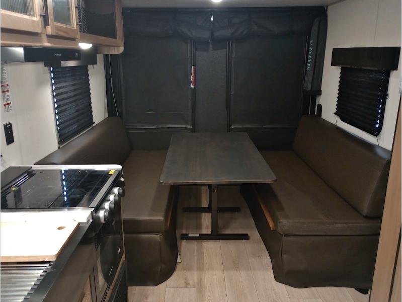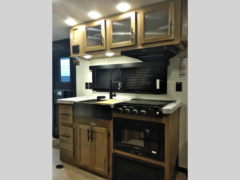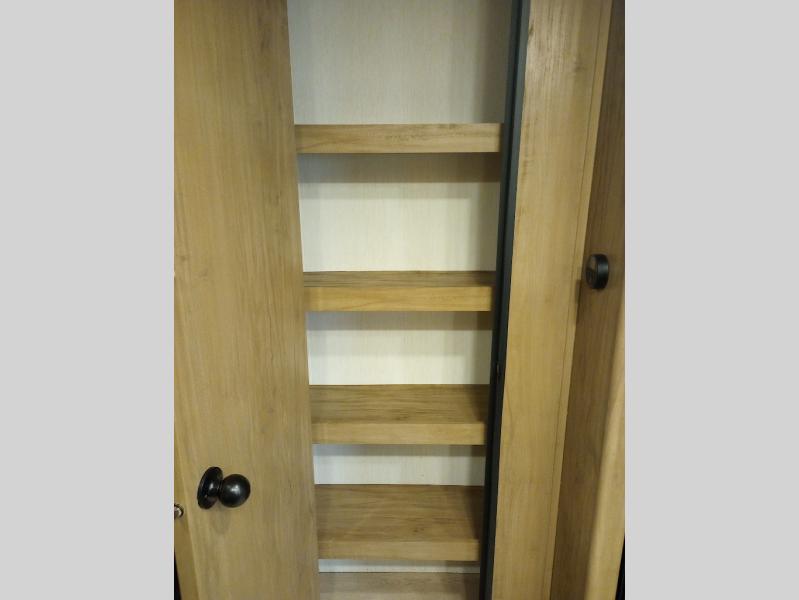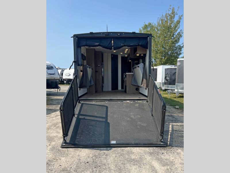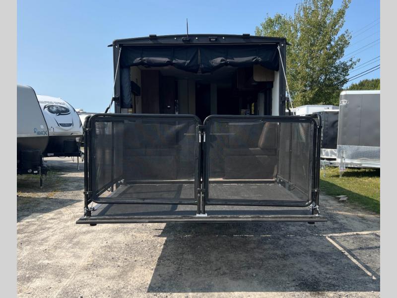 You will love this Cherokee Grey Wolf toy hauler with a rear ramp door for loading and unloading your toys and gear. If you position the fold-down sofas up against the wall, you will have even more room for extra gear when you are moving down the road. Set up camp and easily create a great dining area with the removable table between each fold-down sofa. You can also create your best meals in a breeze with the airy fryer or cooktop. A large pantry allows you to pack all of the snacks and canned goods you need for your adventure. You will appreciate the master suite up front for a great night's rest on the RV king bed along with easy access into the dual-entry bath.