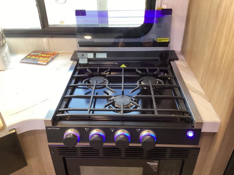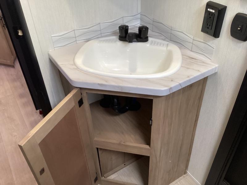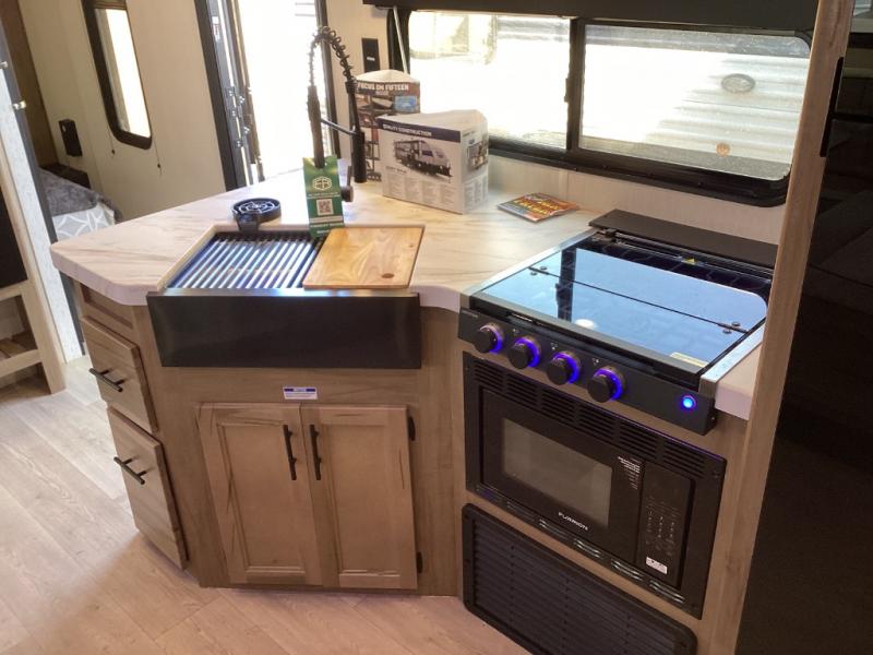 Cook inside in the fully equipped kitchen or take dinner outside with the exterior mini kitchen and awning setup — ideal for campfire nights and morning coffee with a view. With lightweight construction and thoughtful storage throughout, this travel trailer is easy to tow, easy to love, and ready for wherever the road takes you.