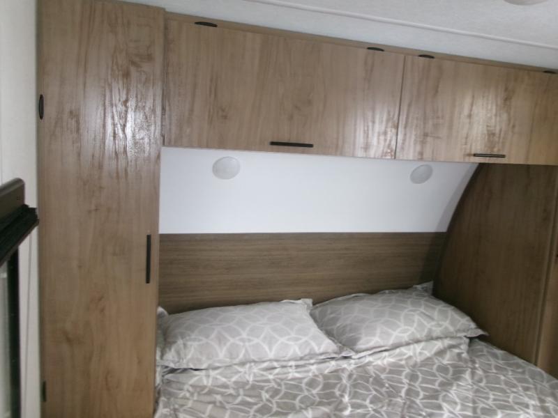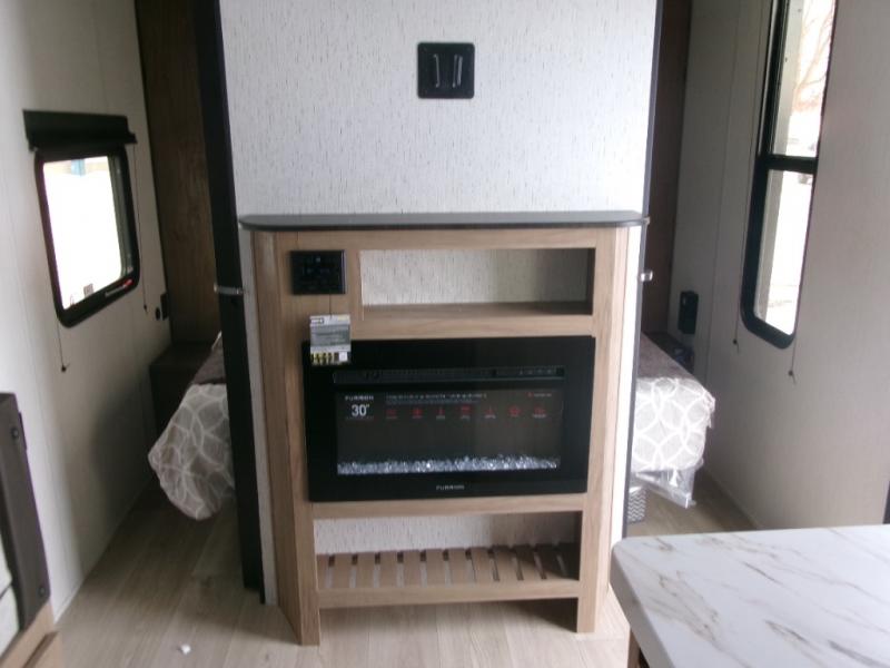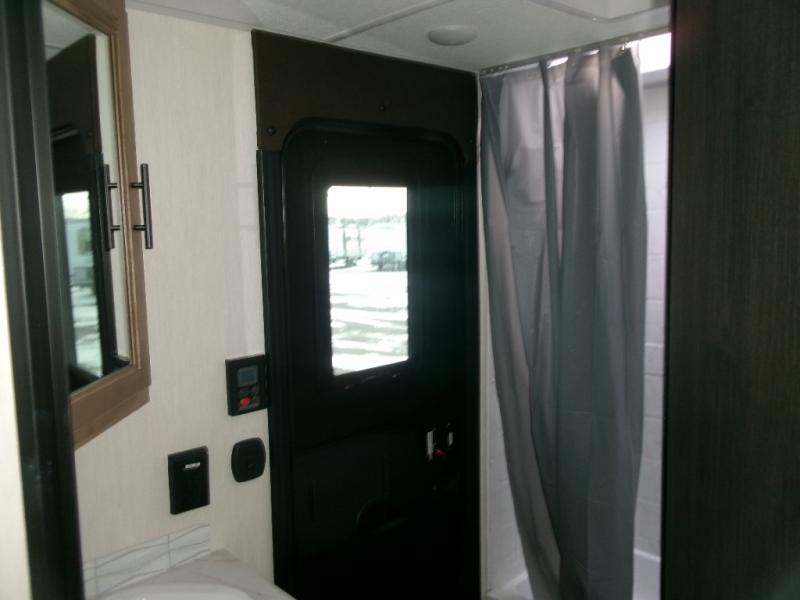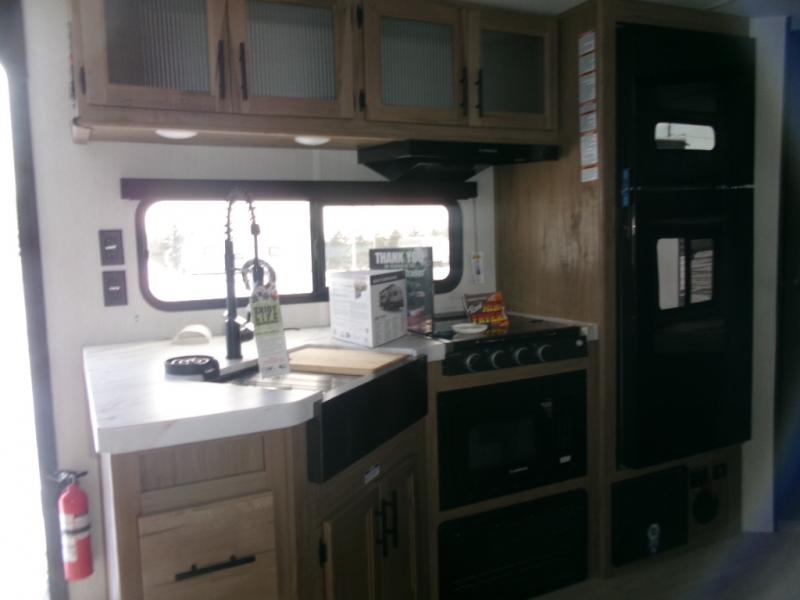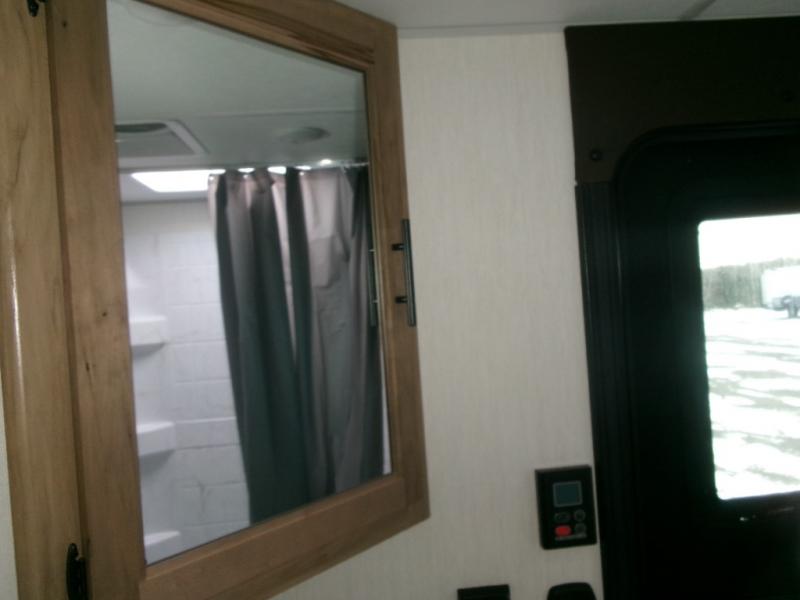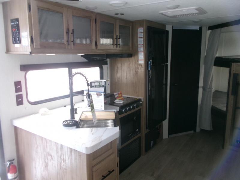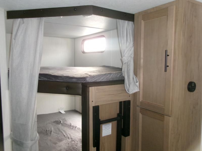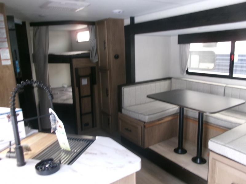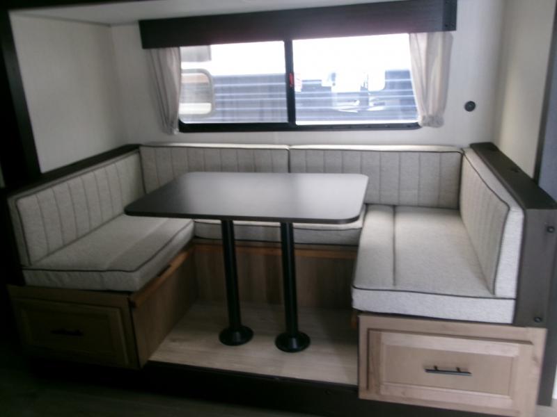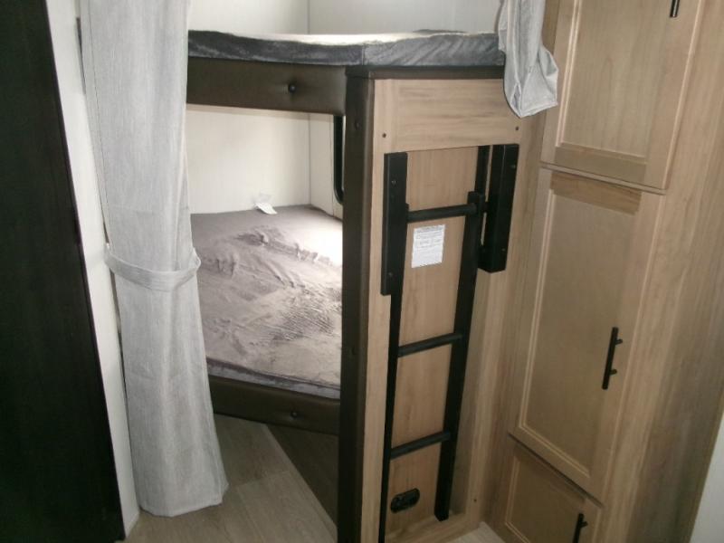 You will love the space provided in this dual entry Cherokee Grey Wolf travel trailer that has double-size bunks! The rear entry door leads right into the full bath allowing easy access from outside when you need to use the bathroom while you're enjoying the great outdoors. The large U-shaped dinette slide will not only seat everyone comfortably for a meal or a game, but since it also slides out, it opens up the interior even more to give you plenty of space for foot traffic. For all of your outdoor gear, you will find the outside storage compartments handy for stowing away your things when not in use. While the kids enjoy their bunk beds, you will enjoy a good night's rest in your RV king bed with wardrobes on either side up in the front private bedroom!