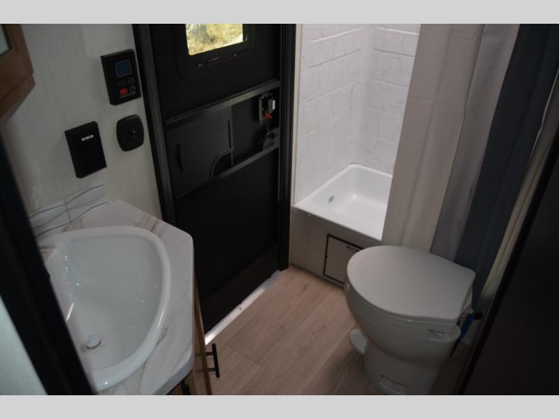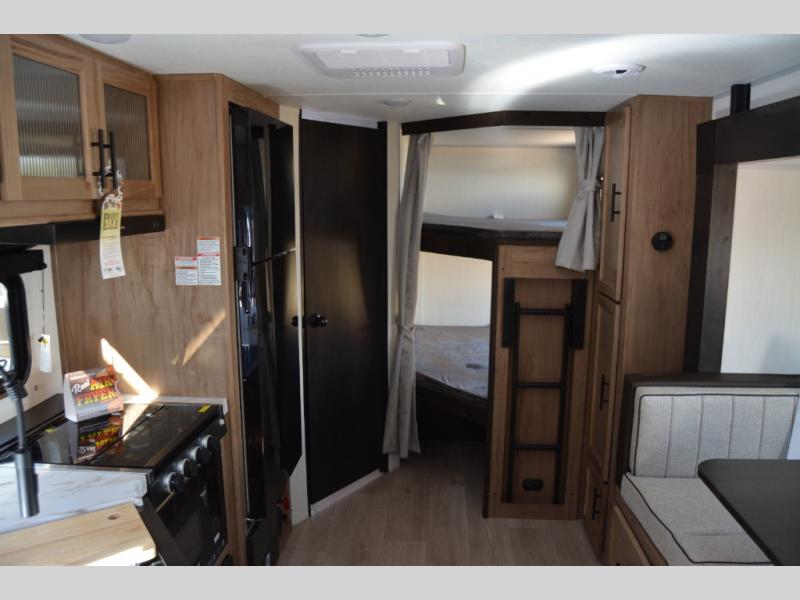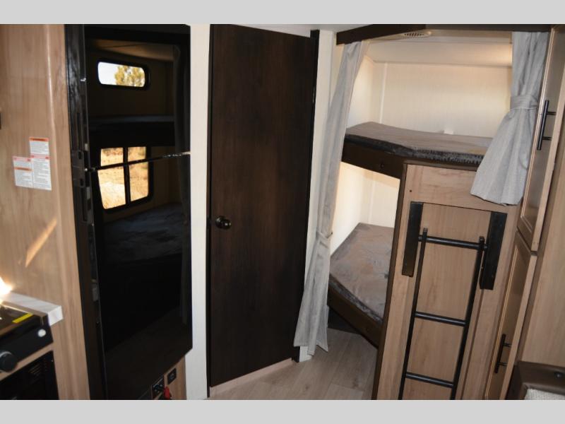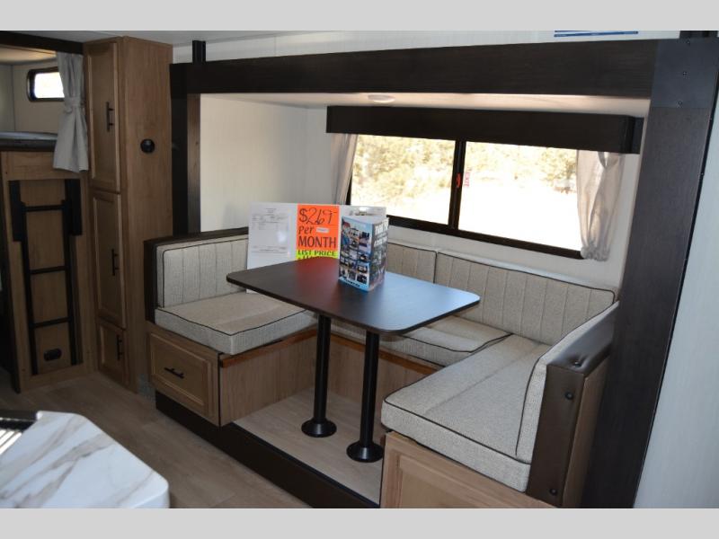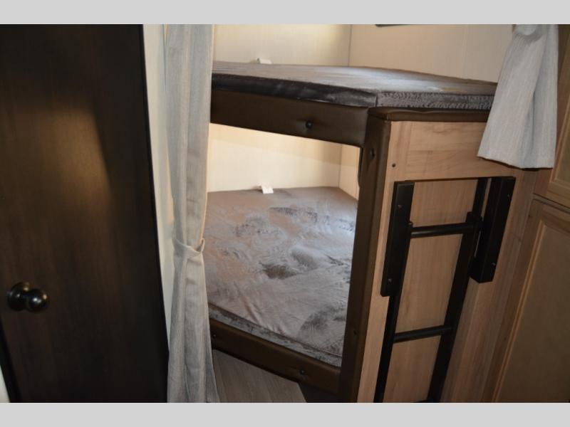 You will love the space provided in this dual entry Cherokee Grey Wolf travel trailer that has double-size bunks! The rear entry door leads right into the full bath allowing easy access from outside when you need to use the bathroom while you're enjoying the great outdoors. The large U-shaped dinette slide will not only seat everyone comfortably for a meal or a game, but since it also slides out, it opens up the interior even more to give you plenty of space for foot traffic. For all of your outdoor gear, you will find the outside storage compartments handy for stowing away your things when not in use. While the kids enjoy their bunk beds, you will enjoy a good night's rest in your RV king bed with wardrobes on either side up in the front private bedroom!