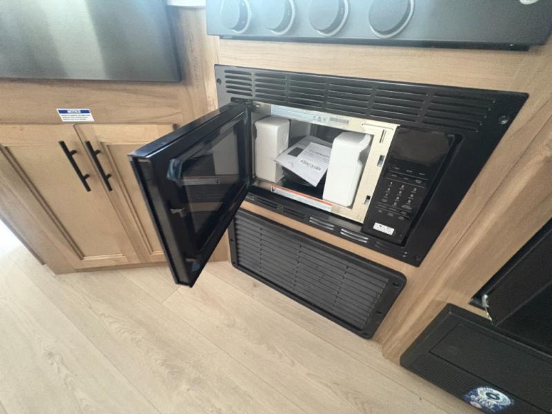 Kitchen Amenities: The kitchen is equipped with a 10 cu ft 12V high-efficiency refrigerator, a 3-burner cooktop, a microwave, and a double sink, providing all the essentials for meal preparation.