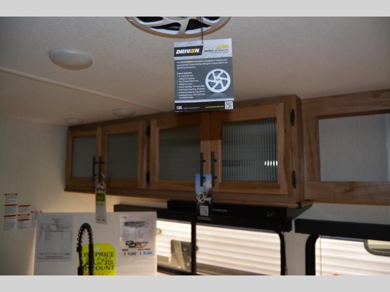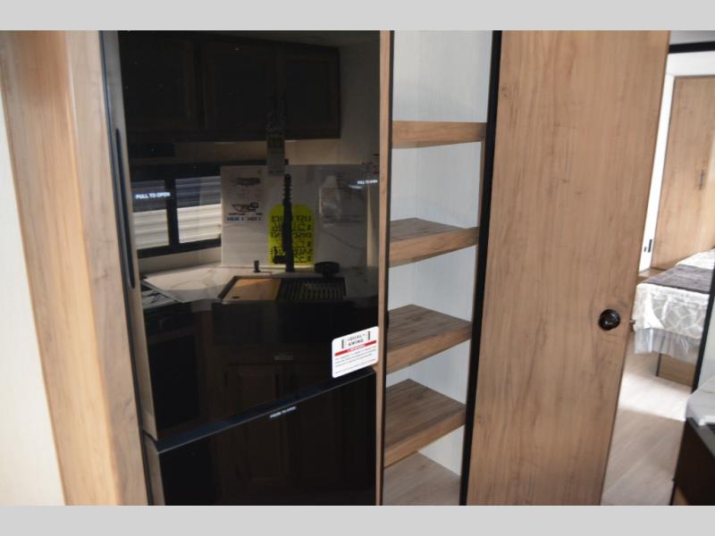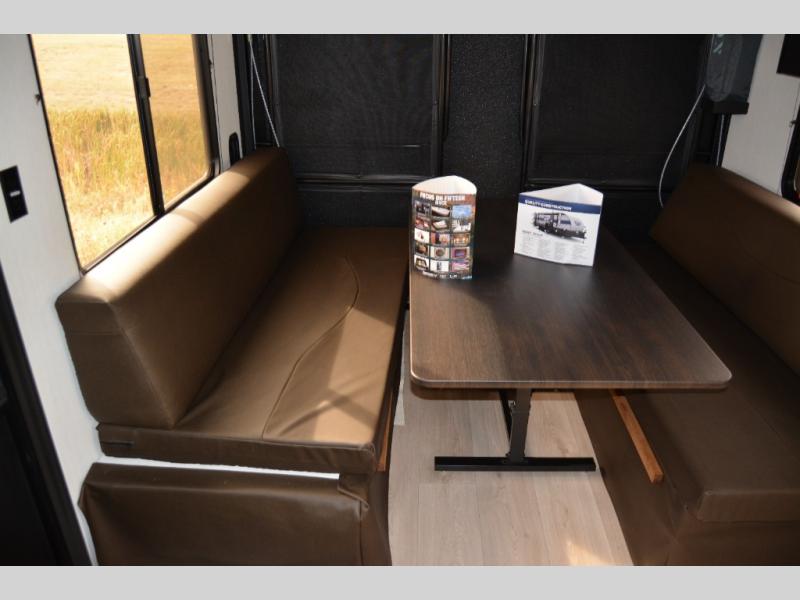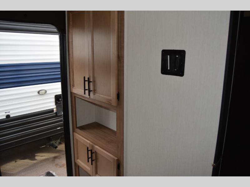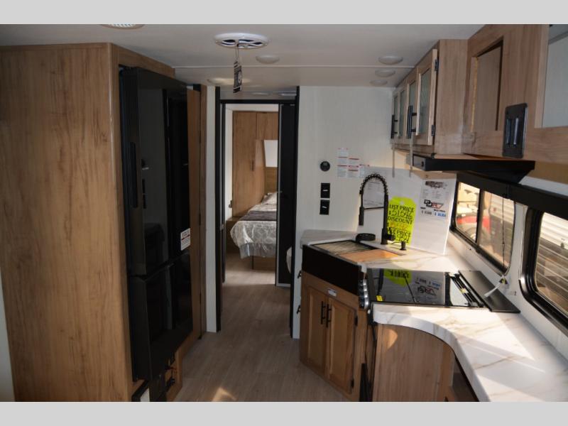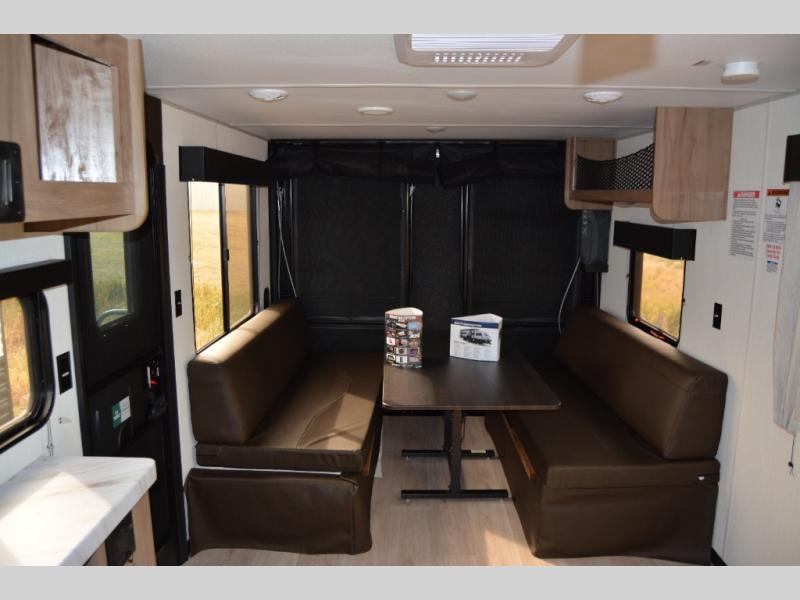 This dual entry toy hauler will allow you to enter in through the main living area or the front master bedroom for convenience! There is a walk-through bath that will be easily accessible for everyone, and there is plenty of storage space for personal belongings. Head to the full kitchen to prepare a home cooked meal, or head outdoors to enjoy the mini kitchen. There is also an outside TV mount if you brought a TV along, and a 15' power awning to provide shade. You can easily unload your toys using the ramp door, then relax on the fold-down sofas with a dinette.