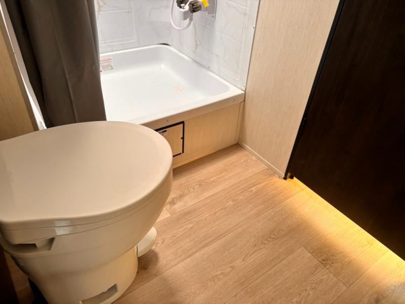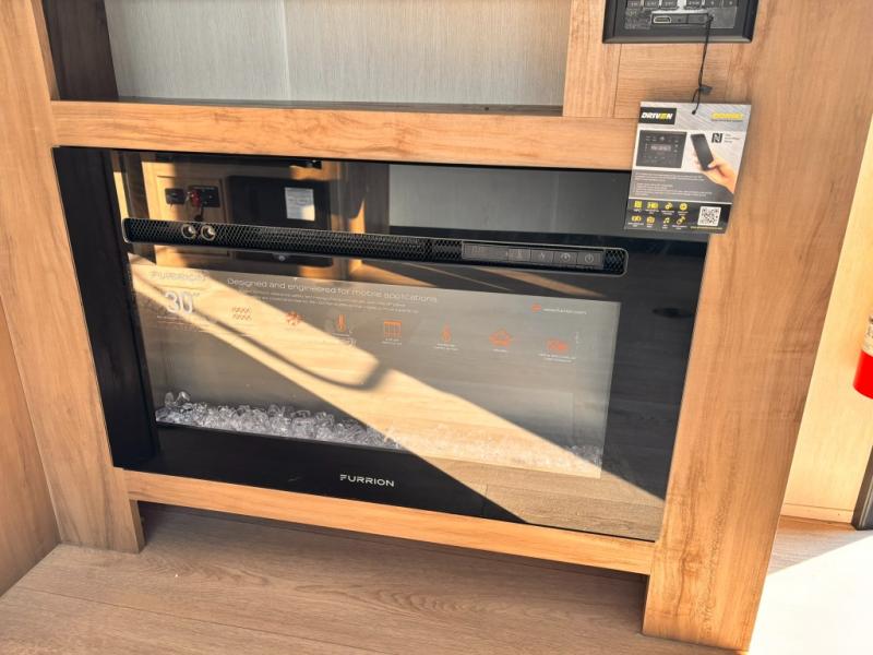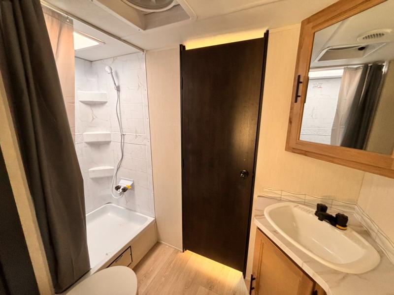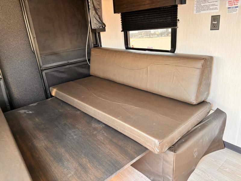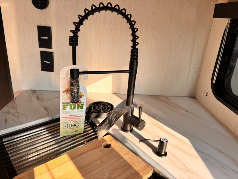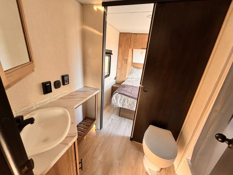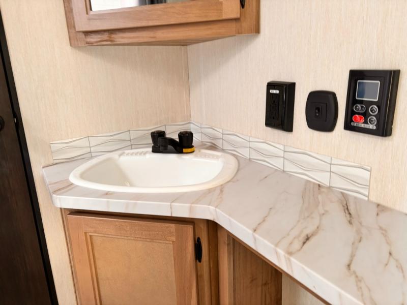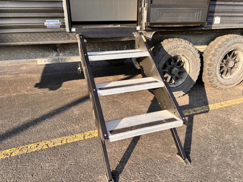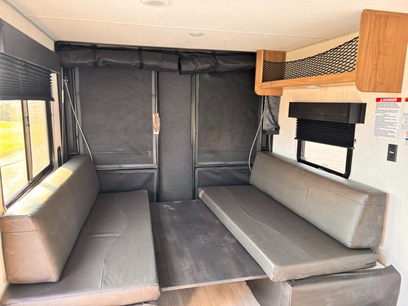 This dual entry toy hauler will allow you to enter in through the main living area or the front master bedroom for convenience! There is a walk-through bath that will be easily accessible for everyone, and there is plenty of storage space for personal belongings. Head to the full kitchen to prepare a home cooked meal, or head outdoors to enjoy the mini kitchen. There is also an outside TV mount if you brought a TV along, and a 15' power awning to provide shade. You can easily unload your toys using the ramp door, then relax on the fold-down sofas with a removable table.