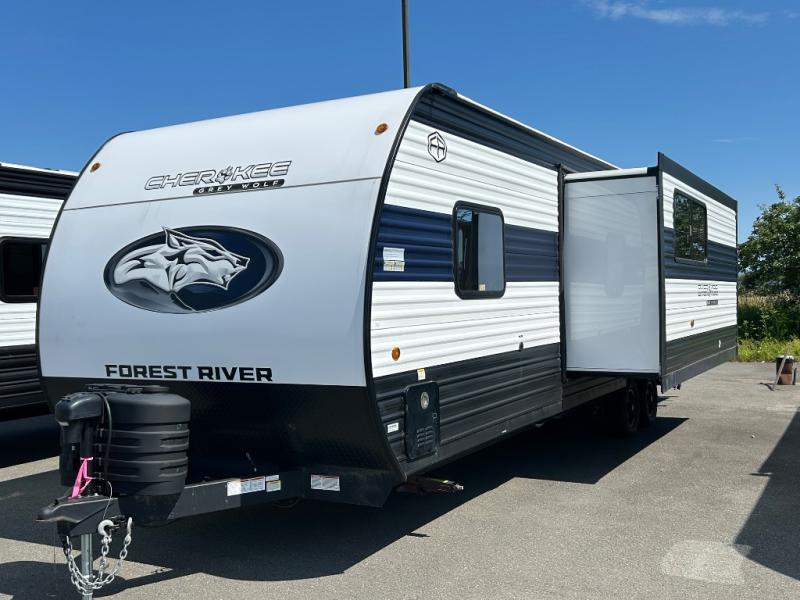 Whether it's a journey that will take you to new locations or a tried-and-true getaway to that favorite and memorable destination, the Forest River Cherokee Grey Wolf travel trailers and toy haulers are going to make the trip worth it every single time! You can travel in confidence with the premium wheel package, seamless roofing membrane with heat reflectivity, Power Gear frame technology with space-saver rail design, and Cherokee back-up camera system. The Cherokee Grey Wolf's interior is highly attractive with its stainless steel kitchen suite package and premium bedding ensemble and comforter. You will also find a black waste tank flush-out kit, an outside shower with hot and cold water, an armored underbelly tank enclosure, and an RV grill quick connect.