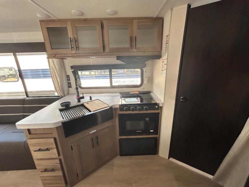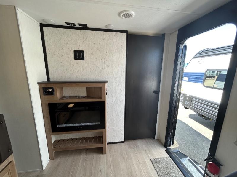 This Cherokee Grey Wolf travel trailer has some of the best accommodations for your group! First of all, it provides you with two entry doors so that everyone can come and go as they please. And before you even reach the interior, you will find that this trailer has an outdoor kitchen all ready for your summertime picnics. Once you do finally make your way to the interior, you'll find that the fireplace creates a beautiful living space next to the sofa and U-shaped dinette. You will also appreciate having a large pantry so that you can stock up on the food your family loves. The double-size bunks have a ladder for easy climbing, and the private bedroom has an RV king bed for easy relaxing.