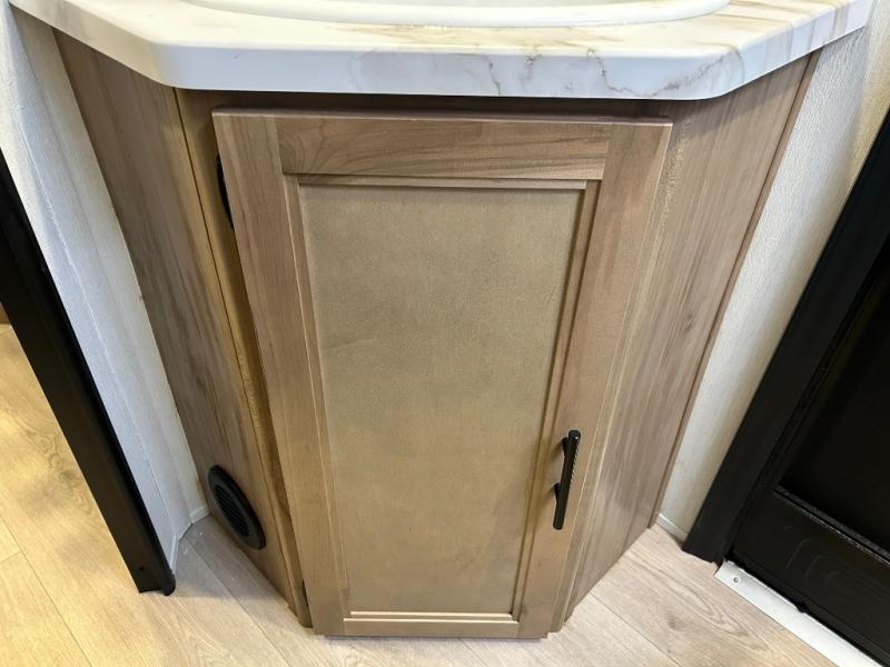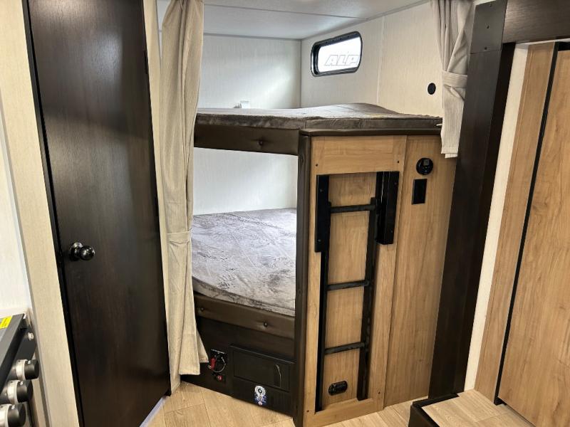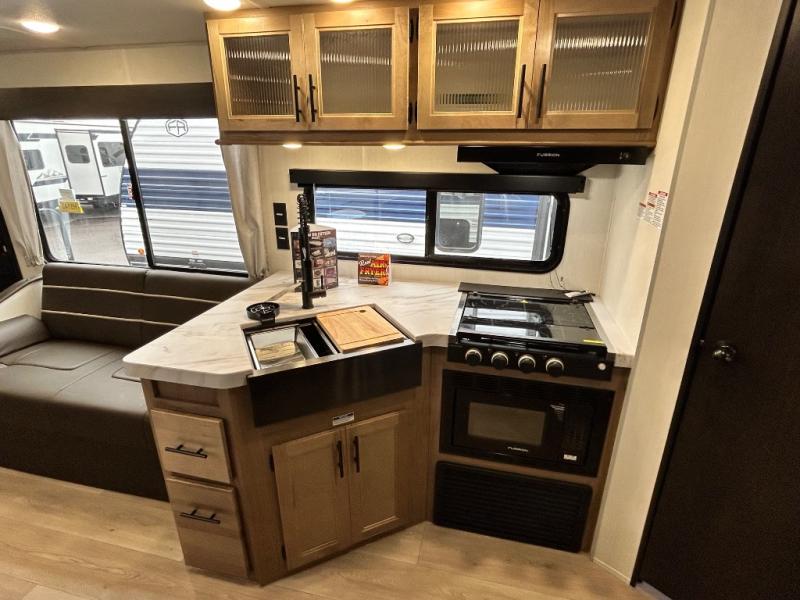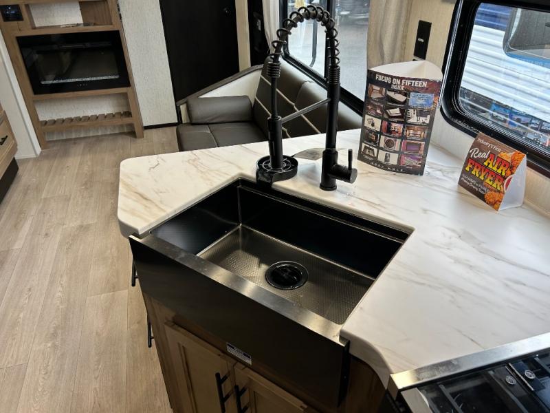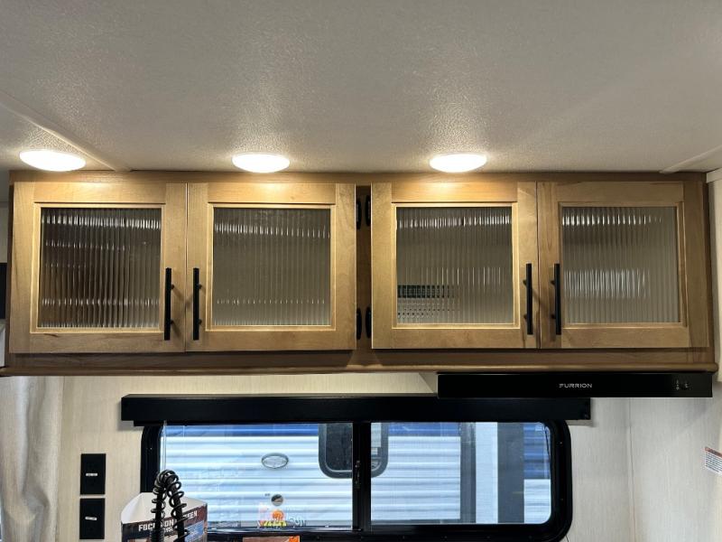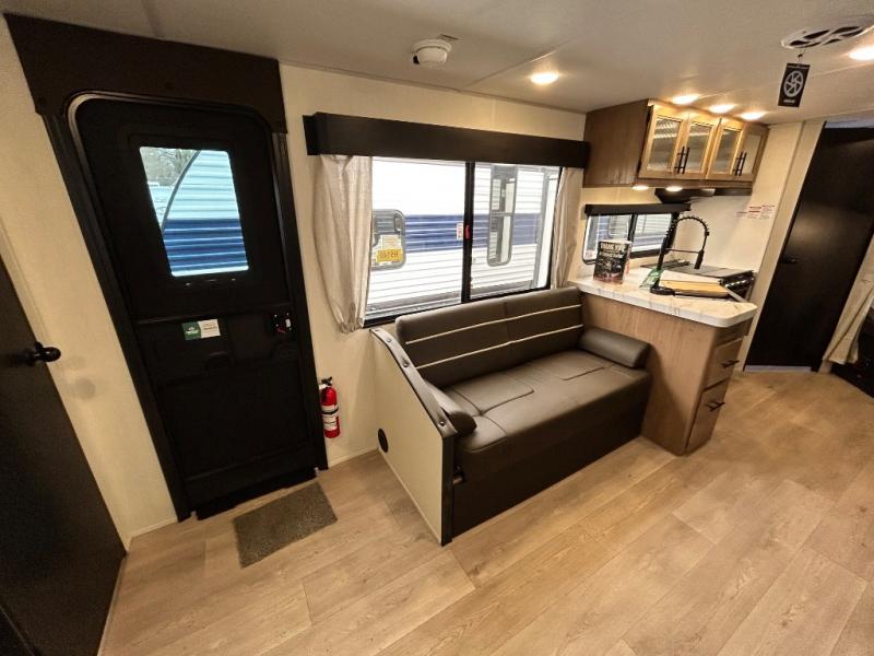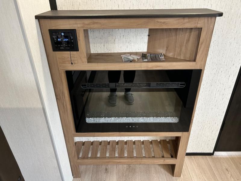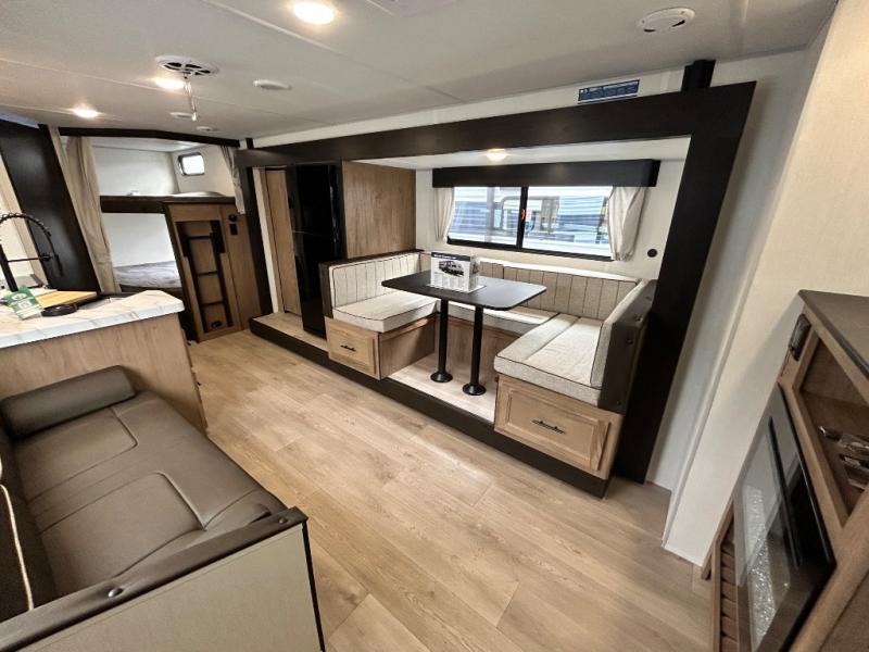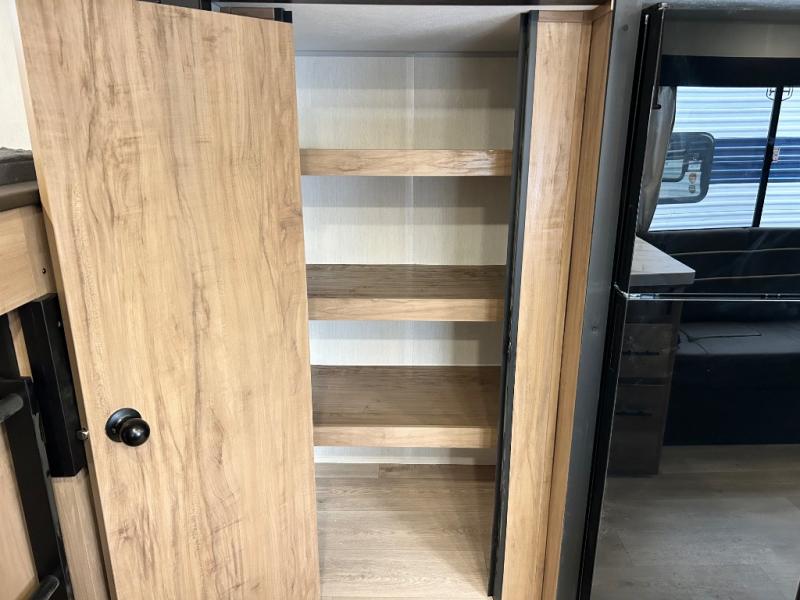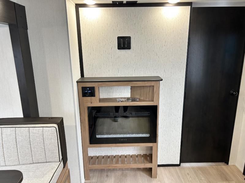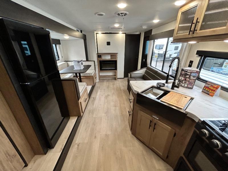 This Cherokee Grey Wolf travel trailer has some of the best accommodations for your group! First of all, it provides you with two entry doors so that everyone can come and go as they please. And before you even reach the interior, you will find that this trailer has an outdoor kitchen all ready for your summertime picnics. Once you do finally make your way to the interior, you'll find that the fireplace creates a beautiful living space next to the sofa and U-shaped dinette. You will also appreciate having a large pantry so that you can stock up on the food your family loves. The double-size bunks have a ladder for easy climbing, and the private bedroom has an RV king bed for easy relaxing.