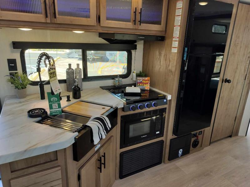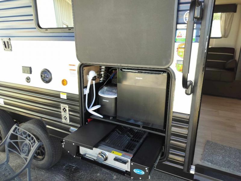 Come on inside this Cherokee Grey Wolf travel trailer and experience the convenience of a smooth flow of traffic in and out with two entry doors. The rear door leads into a full bath which is great for accessibility. Once inside, you will notice the large U-shaped dinette and the sofa which sit on the slide and create a spacious footprint for moving about, as well as great places to play games and socialize with your friends and family. A walk-in pantry provides plenty of storage allowing you to stock up on your favorite snacks and dry goods for your family adventure. At night, there is sleeping space for everyone between the double-size bunks and the RV king bed, plus the furniture.