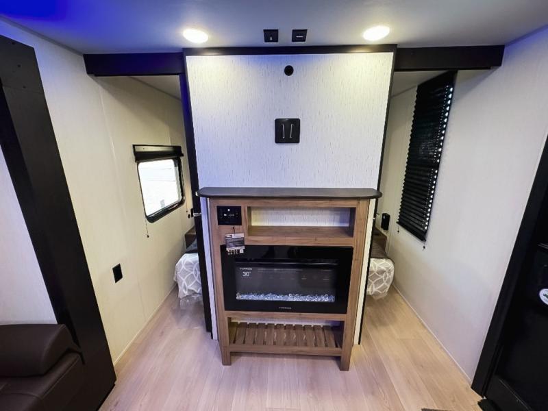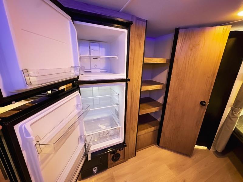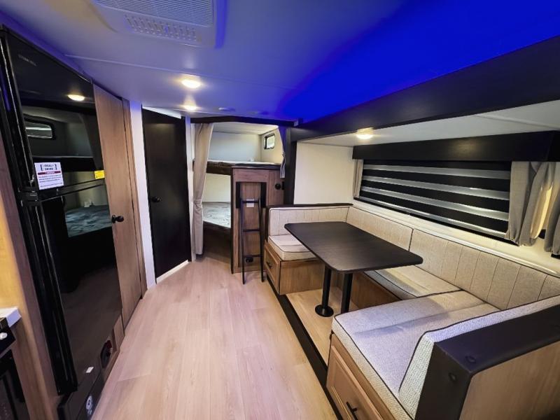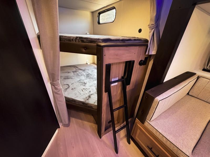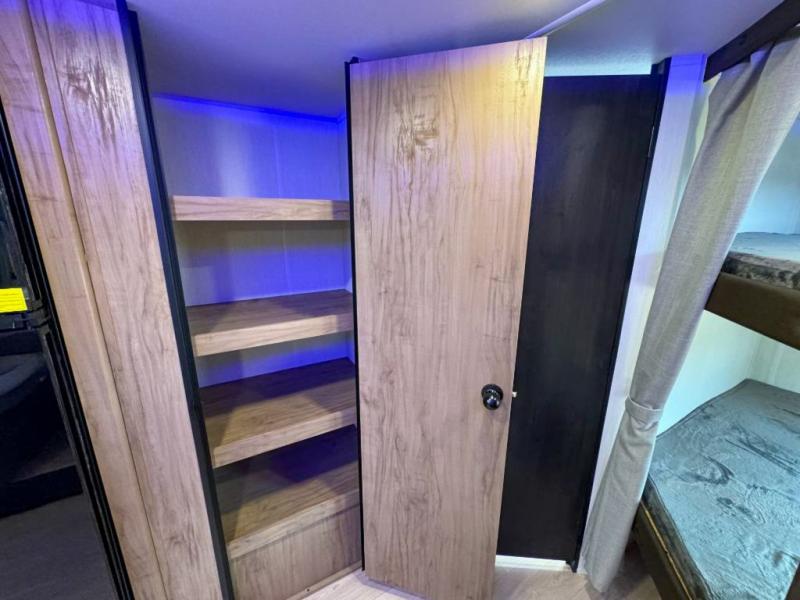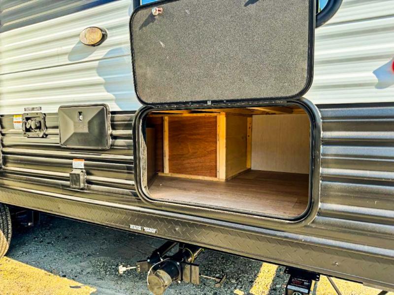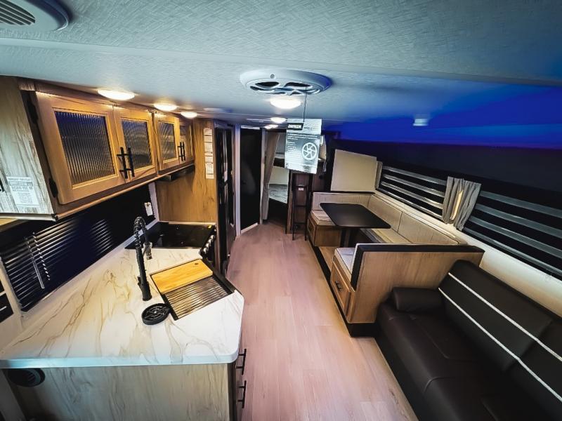 Come on inside this Cherokee Grey Wolf travel trailer and experience the convenience of a smooth flow of traffic in and out with two entry doors. The rear door leads into a full bath which is great for accessibility. Once inside, you will notice the large U-shaped dinette and the sofa which sit on the slide and create a spacious footprint for moving about, as well as great places to play games and socialize with your friends and family. A walk-in pantry provides plenty of storage allowing you to stock up on your favorite snacks and dry goods for your family adventure. At night, there is sleeping space for everyone between the double-size bunks and the RV king bed, plus the furniture.