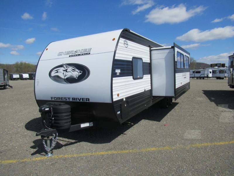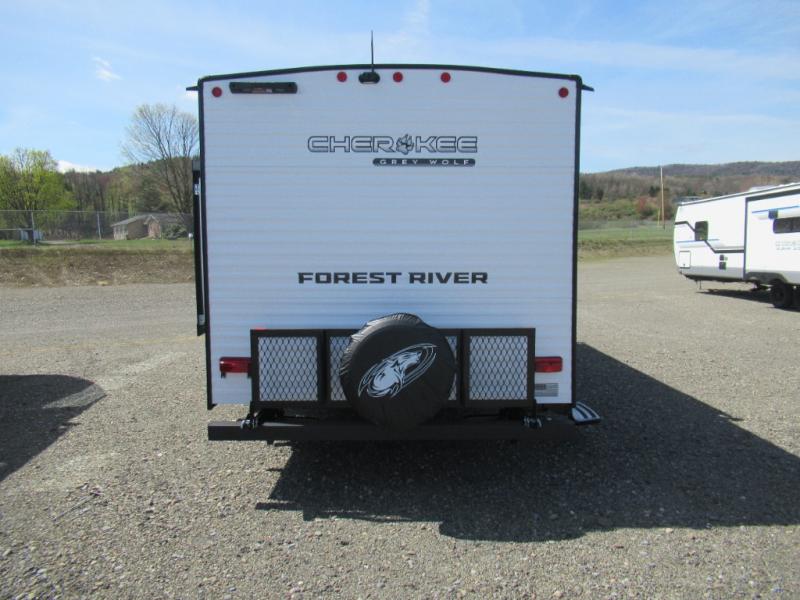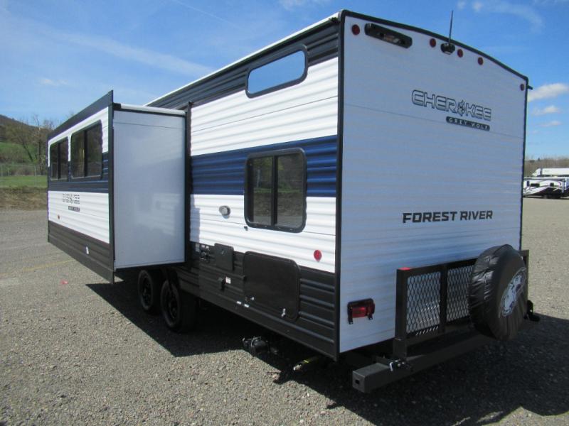 Whether it's a journey that will take you to new locations or a tried-and-true getaway to that favorite and memorable destination, the Forest River Cherokee Grey Wolf travel trailers and toy haulers are going to make the trip worth it every single time! You can travel in confidence with the premium wheel package, seamless roofing membrane with heat reflectivity, Power Gear frame technology with space-saver rail design, and Cherokee back-up camera system. The Cherokee Grey Wolf's interior is highly attractive with its stainless steel kitchen suite package and premium bedding ensemble and comforter. You will also find a black waste tank flush-out kit, an outside shower with hot and cold water, an armored underbelly tank enclosure, and an RV grill quick connect.