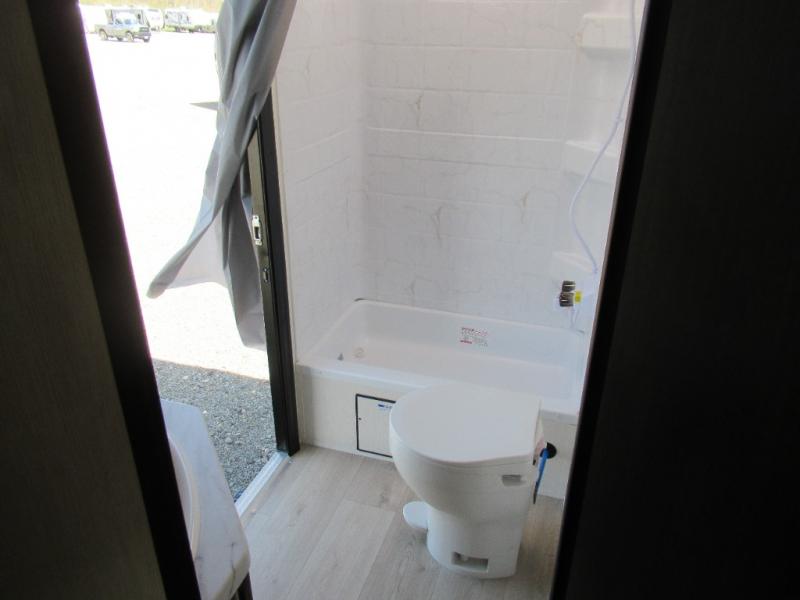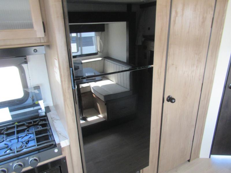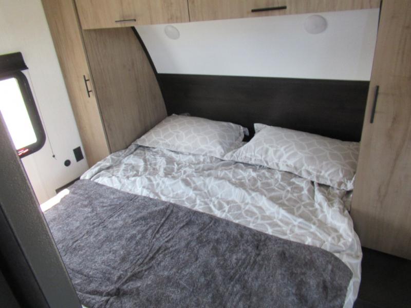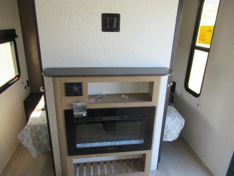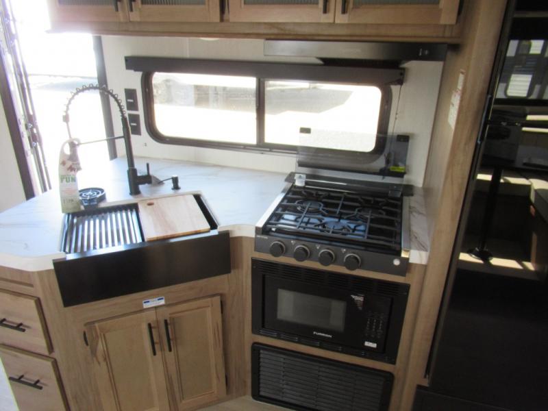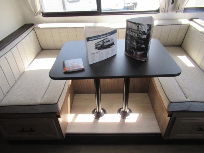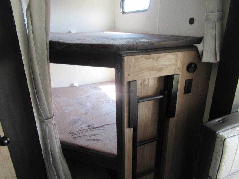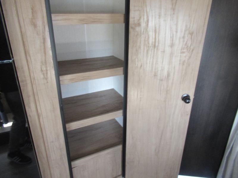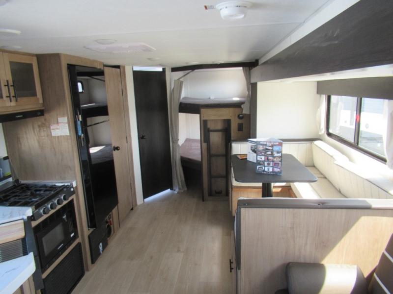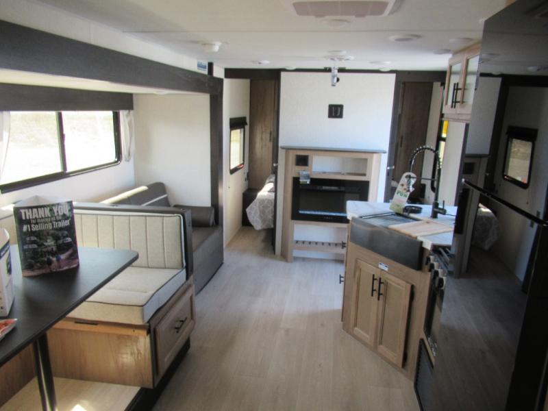 Come on inside this Cherokee Grey Wolf travel trailer and experience the convenience of a smooth flow of traffic in and out with two entry doors. The rear door leads into a full bath which is great for accessibility. Once inside, you will notice the large U-shaped dinette and the sofa which sit on the slide and create a spacious footprint for moving about, as well as great places to play games and socialize with your friends and family. A walk-in pantry provides plenty of storage allowing you to stock up on your favorite snacks and dry goods for your family adventure. At night, there is sleeping space for everyone between the double-size bunks and the RV king bed, plus the furniture.