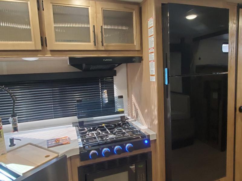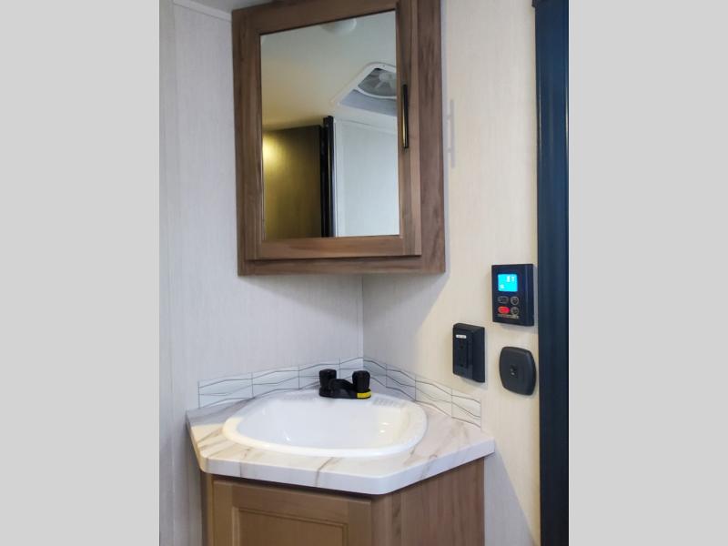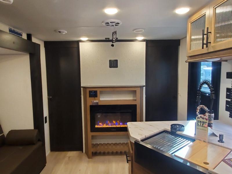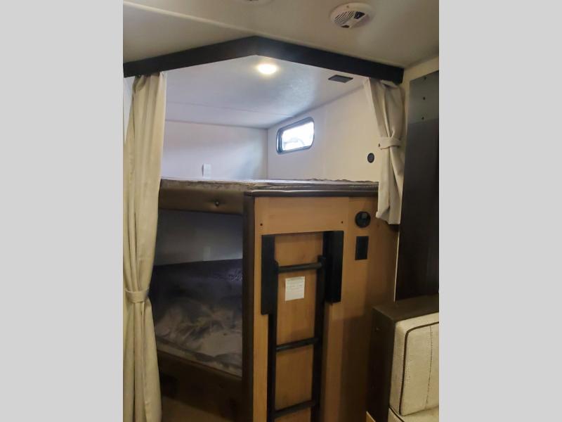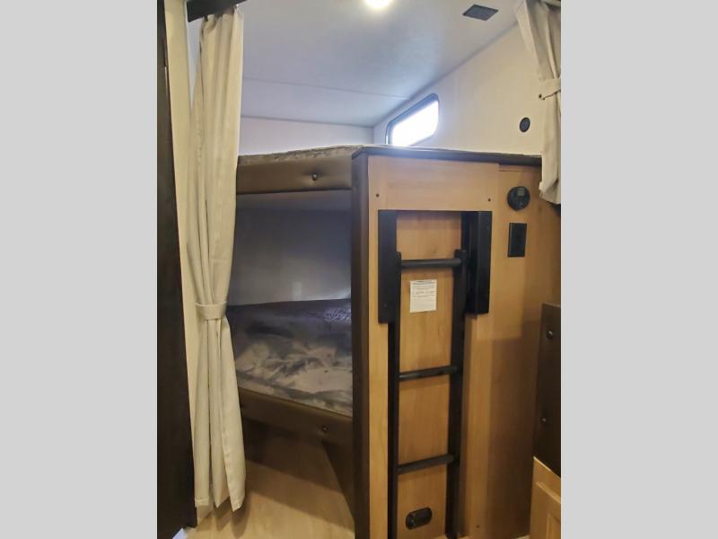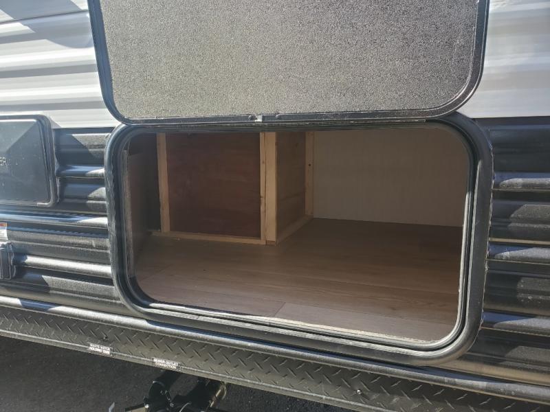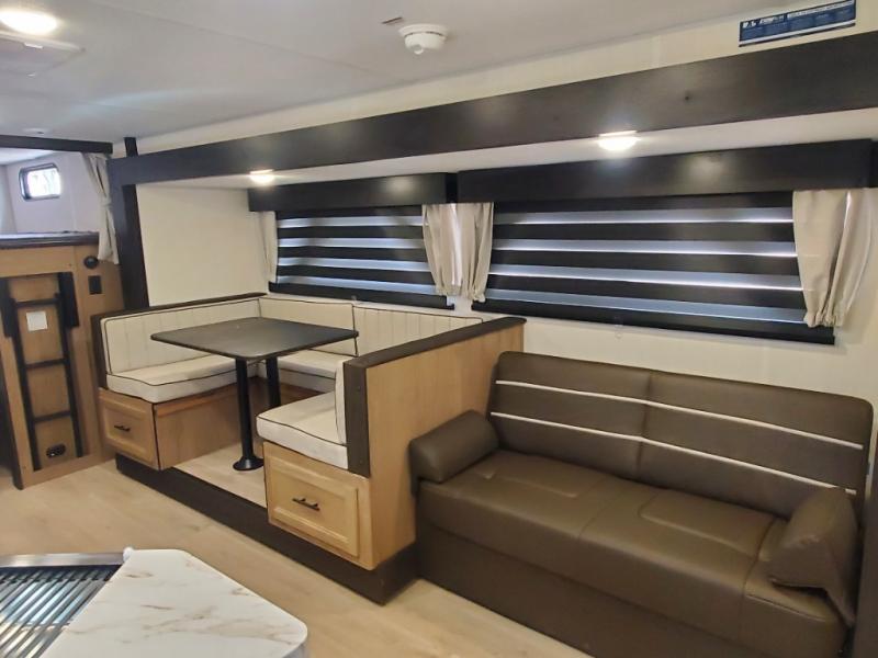 Come on inside this Cherokee Grey Wolf travel trailer and experience the convenience of a smooth flow of traffic in and out with two entry doors. The rear door leads into a full bath which is great for accessibility. Once inside, you will notice the large U-shaped dinette and the sofa which sit on the slide and create a spacious footprint for moving about, as well as great places to play games and socialize with your friends and family. A walk-in pantry provides plenty of storage allowing you to stock up on your favorite snacks and dry goods for your family adventure. At night, there is sleeping space for everyone between the double-size bunks and the RV king bed, plus the furniture.