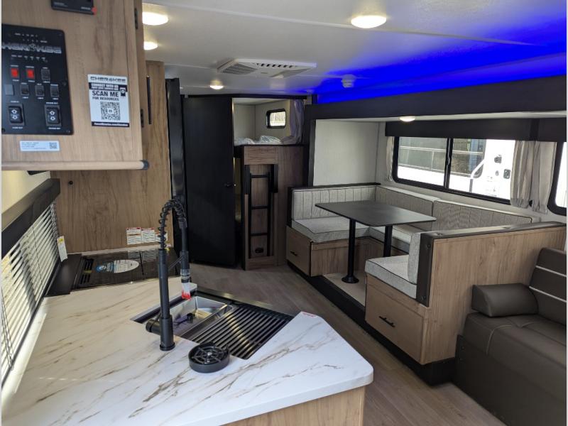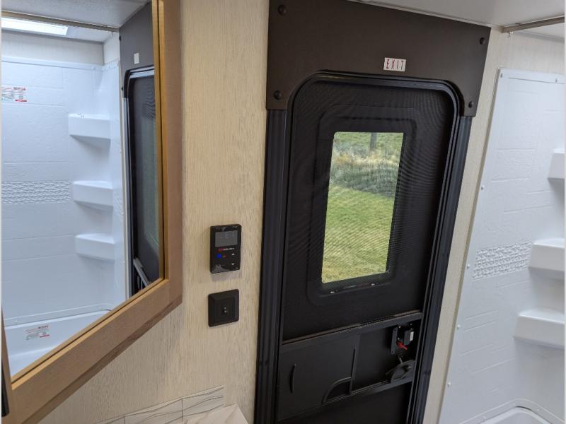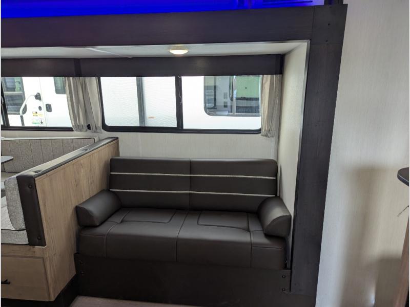Come on inside this Cherokee Grey Wolf travel trailer and experience the convenience of a smooth flow of traffic in and out with two entry doors. The rear door leads into a full bath which is great for accessibility. Once inside, you will notice the large U-shaped dinette and the sofa which sit on the slide and create a spacious footprint for moving about, as well as great places to play games and socialize with your friends and family. A walk-in pantry provides plenty of storage allowing you to stock up on your favorite snacks and dry goods for your family adventure. At night, there is sleeping space for everyone between the double-size bunks and the RV king bed, plus the furniture.