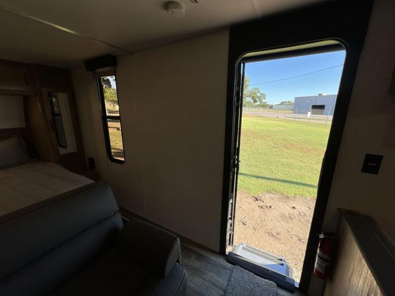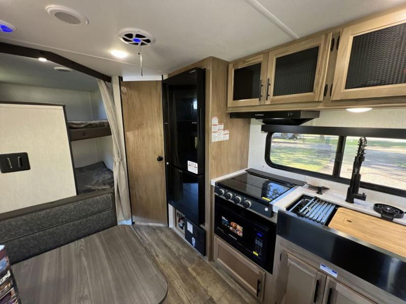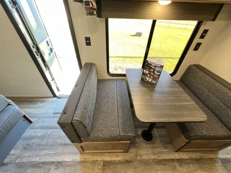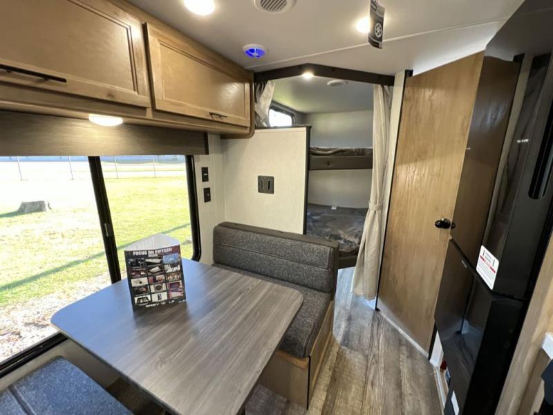 If you like to camp with more friends and family, this travel trailer is for you! Since there are double-size bunks, a queen bed, plus a sofa and booth dinette, you can sleep eight people each night! The front bedroom includes the RV king bed, along with dual bedroom wardrobes and USB ports to charge your phones overnight. A full kitchen, complete with an air fryer and refrigerator will let the chef do their thing, and everyone can head outdoors to sit under the 15' patio awning!