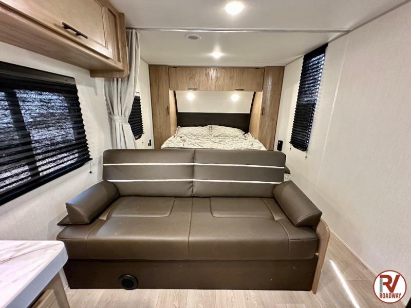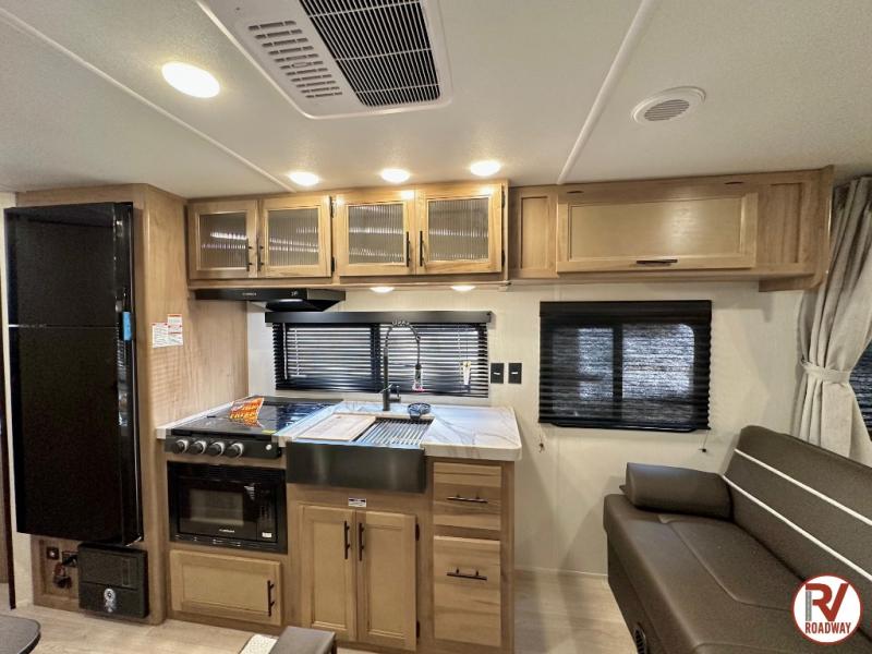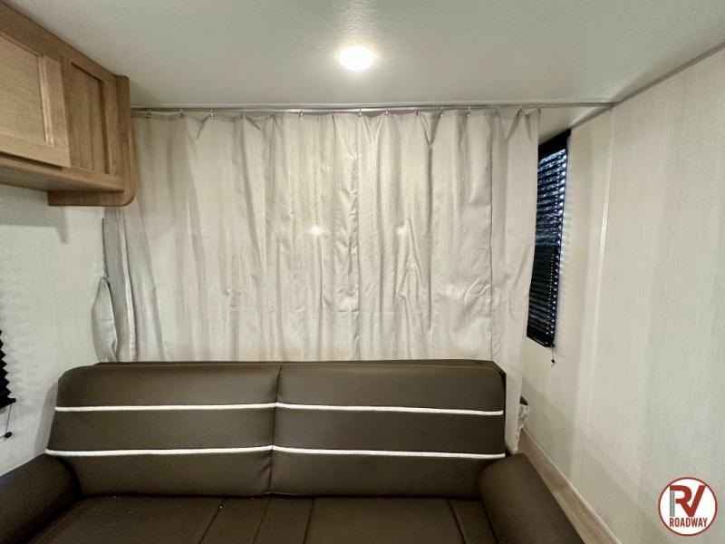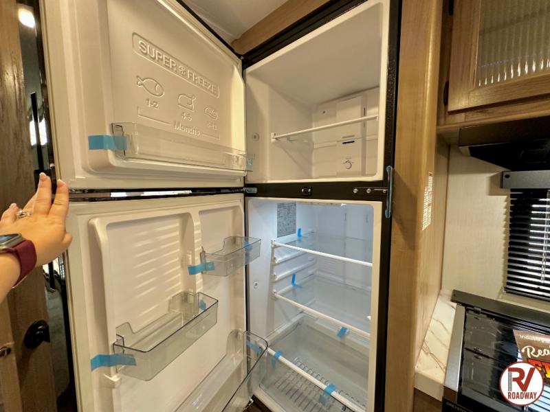 If you like to camp with more friends and family, this travel trailer is for you! Since there are double-size bunks, a queen bed, plus a sofa and booth dinette, you can sleep eight people each night! The front bedroom includes the RV king bed, along with dual bedroom wardrobes and USB ports to charge your phones overnight. A full kitchen, complete with an air fryer and refrigerator will let the chef do their thing, and everyone can head outdoors to sit under the 15' patio awning!