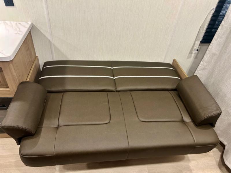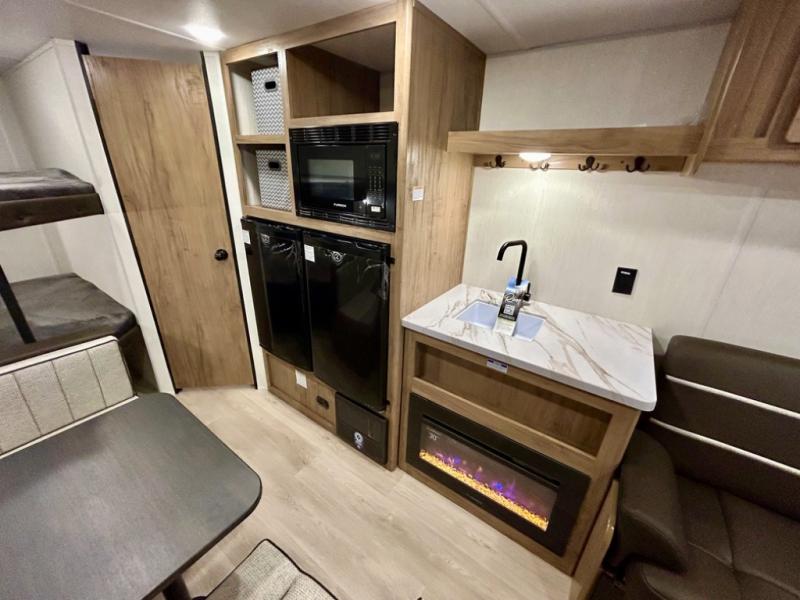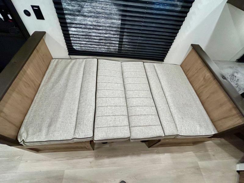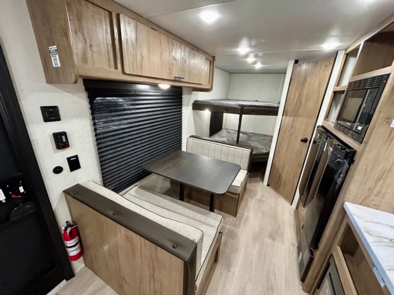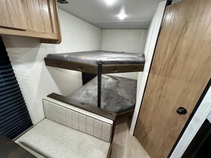 Enjoy family adventures in this bunk model which features sleeping for eight to ten depending on size with a queen bed up front, double-size bunks in the rear curbside corner, and you could even convert the booth dinette and sofa to sleep more. Inside, you will find ample storage with overhead cabinets and a large shelf above the queen bed, plus more shelves next to the entry door, as well as a pantry and storage on either side of the bed. You will appreciate the full bath with tub/shower, toilet, and sink so you can skip the campground facilities. On the outside, you will also find a 12' awning for added outdoor living, and outside storage for your camping gear, plus more!