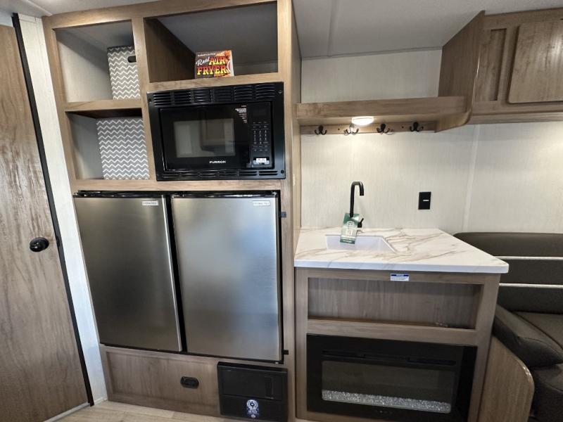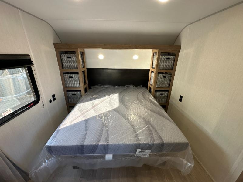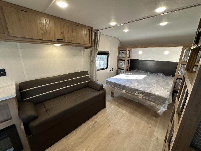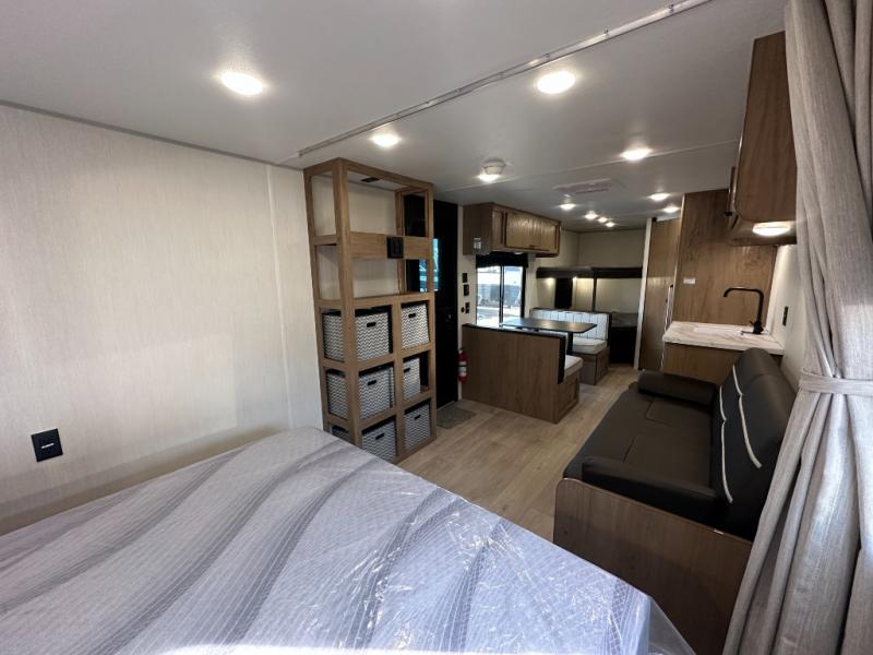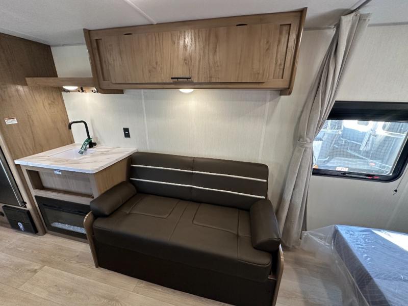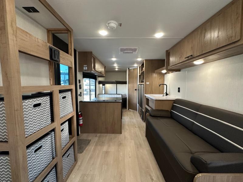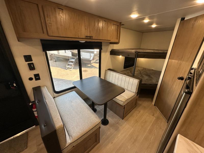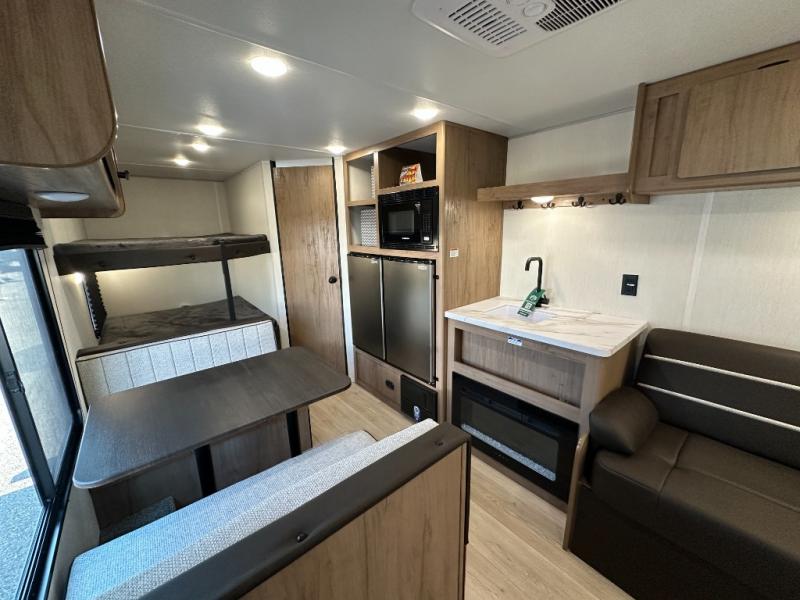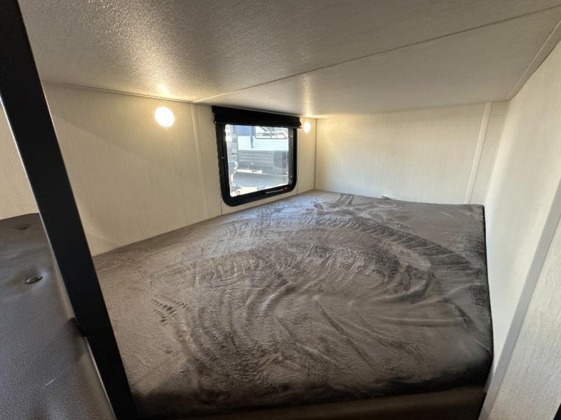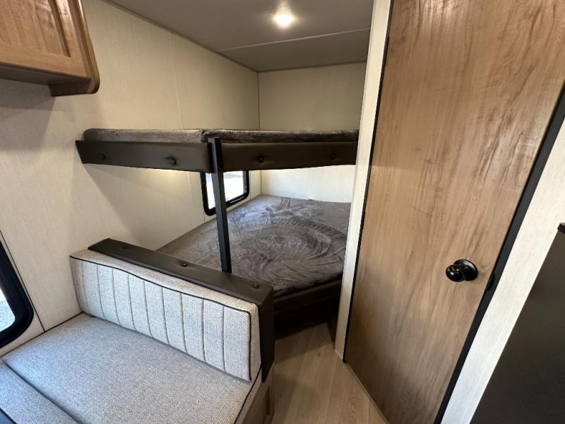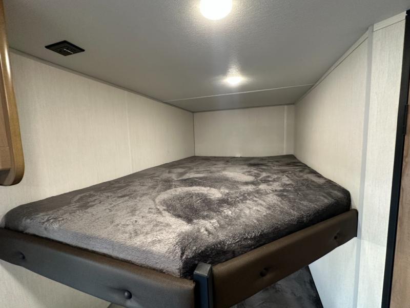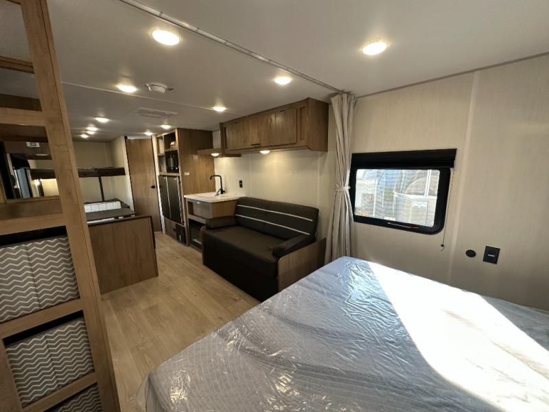 Enjoy family adventures in this bunk model which features sleeping for eight to ten depending on size with a queen bed up front, double-size bunks in the rear curbside corner, and you could even convert the booth dinette and sofa to sleep more. Inside, you will find ample storage with overhead cabinets and a large shelf above the queen bed, plus more shelves next to the entry door, as well as a pantry and storage on either side of the bed. You will appreciate the full bath with tub/shower, toilet, and sink so you can skip the campground facilities. On the outside, you will also find a 12' awning for added outdoor living, and outside storage for your camping gear, plus more!