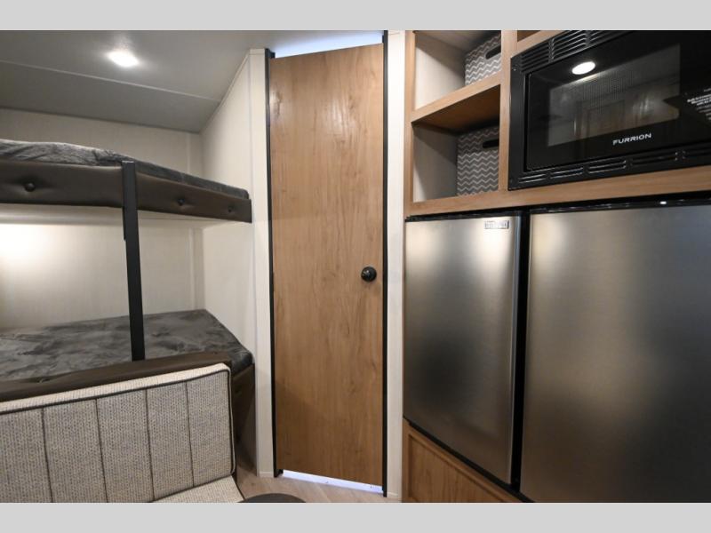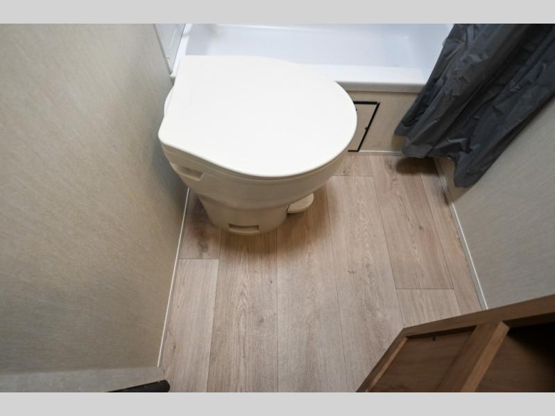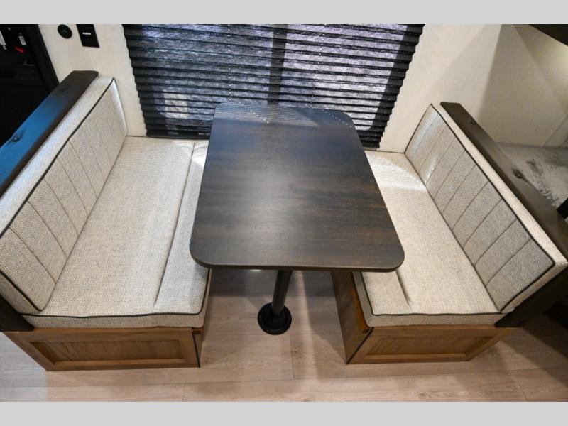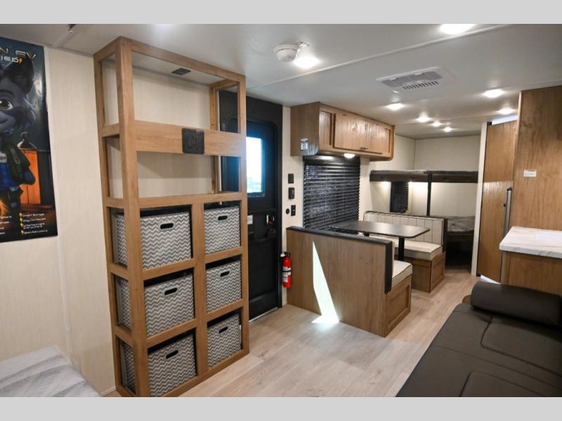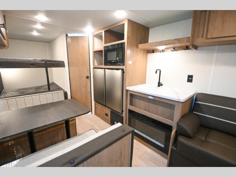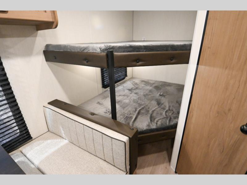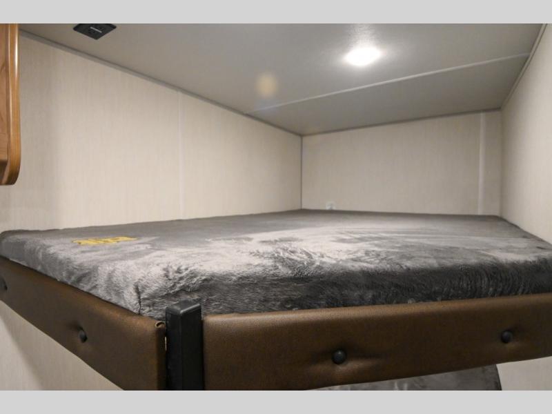 Enjoy family adventures in this bunk model which features sleeping for eight to ten depending on size with a queen bed up front, double-size bunks in the rear curbside corner, and you could even convert the booth dinette and sofa to sleep more. Inside, you will find ample storage with overhead cabinets and a large shelf above the queen bed, plus more shelves next to the entry door, as well as a pantry and storage on either side of the bed. You will appreciate the full bath with tub/shower, toilet, and sink so you can skip the campground facilities. On the outside, you will also find a 12' awning for added outdoor living, and outside storage for your camping gear, plus more!