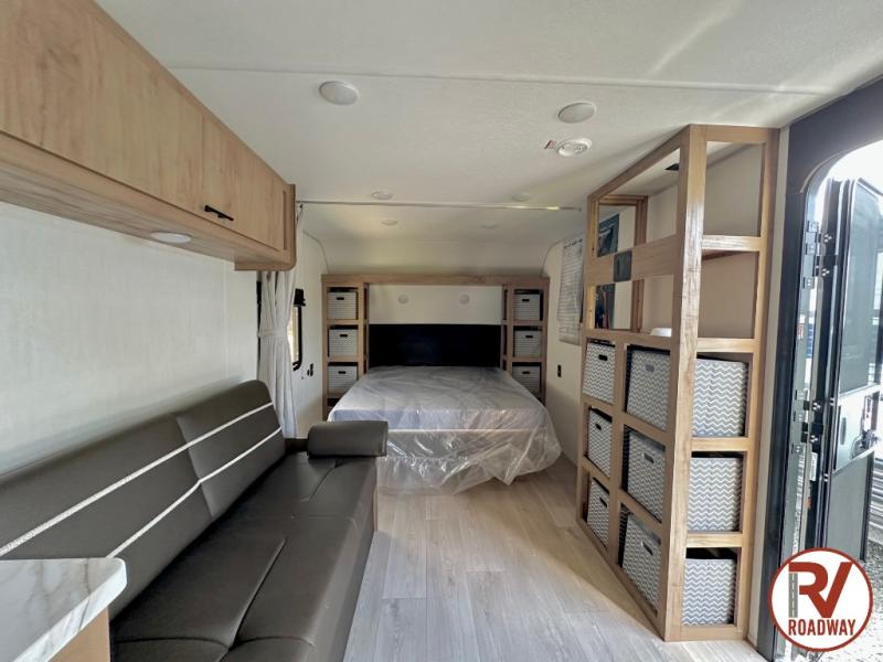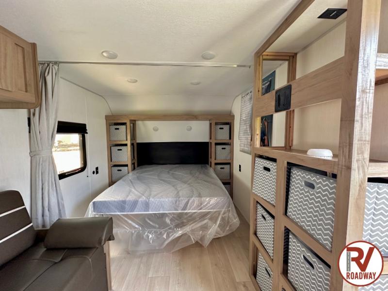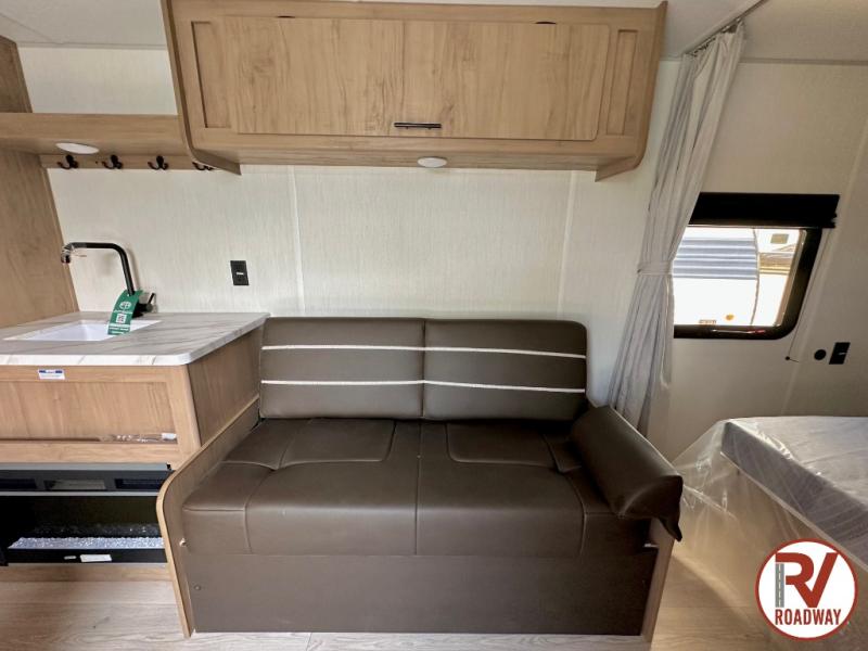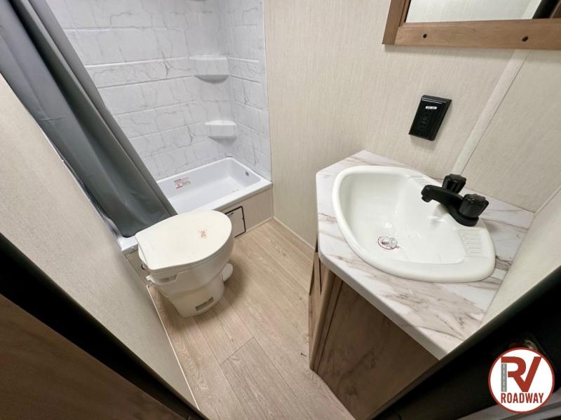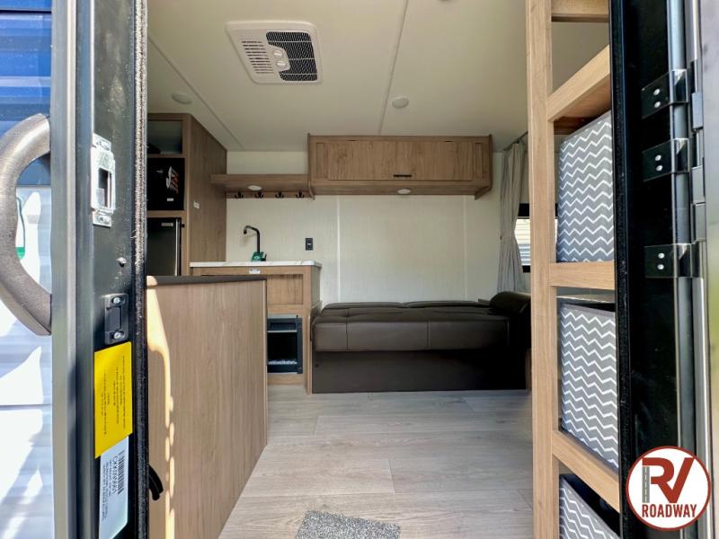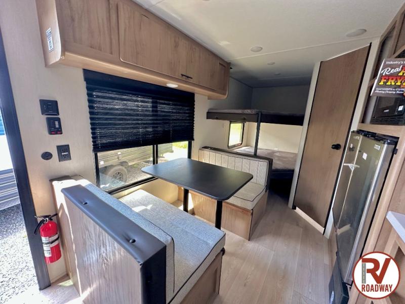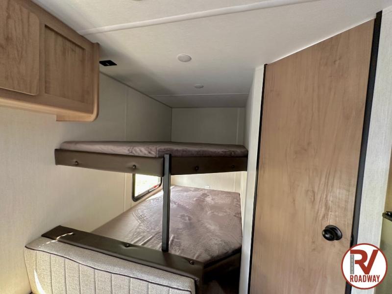 Enjoy family adventures in this bunk model which features sleeping for eight to ten depending on size with a queen bed up front, double-size bunks in the rear curbside corner, and you could even convert the booth dinette and sofa to sleep more. Inside, you will find ample storage with overhead cabinets and a large shelf above the queen bed, plus more shelves next to the entry door, as well as a pantry and storage on either side of the bed. You will appreciate the full bath with tub/shower, toilet, and sink so you can skip the campground facilities. On the outside, you will also find a 12' awning for added outdoor living, and outside storage for your camping gear, plus more!