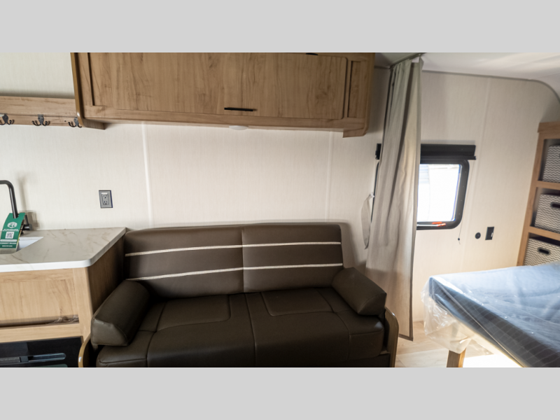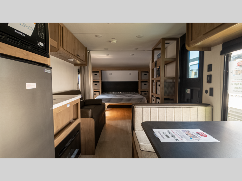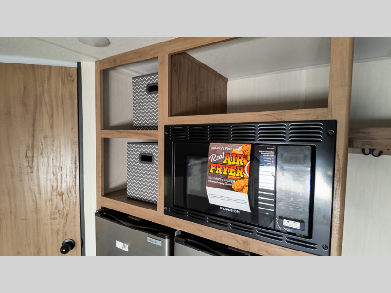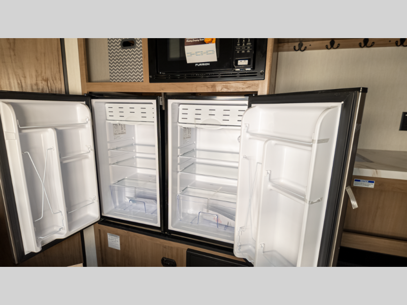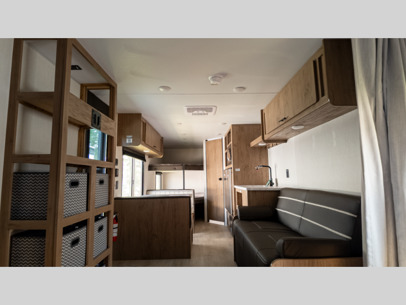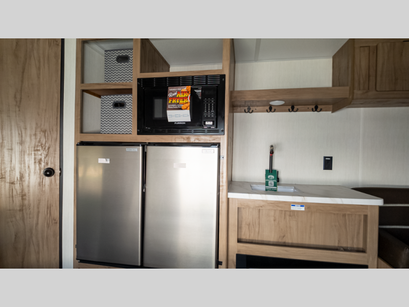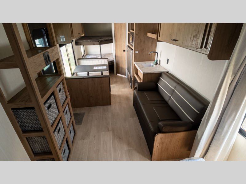 - Well-equipped kitchen: Pantry and full-sized fridge rival setups in larger models from Jayco or Coachmen