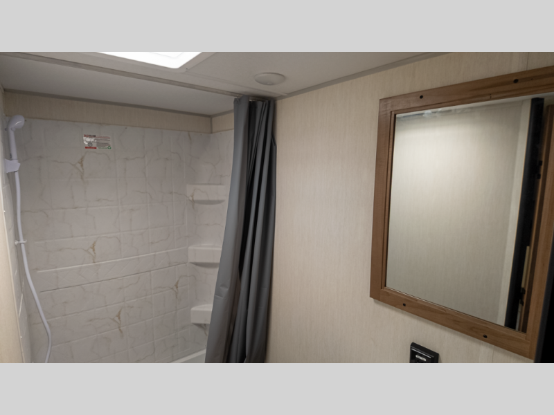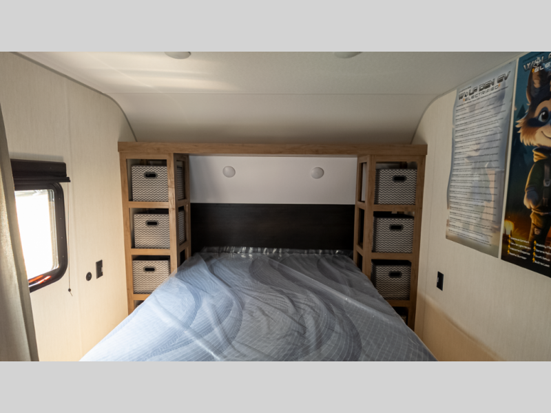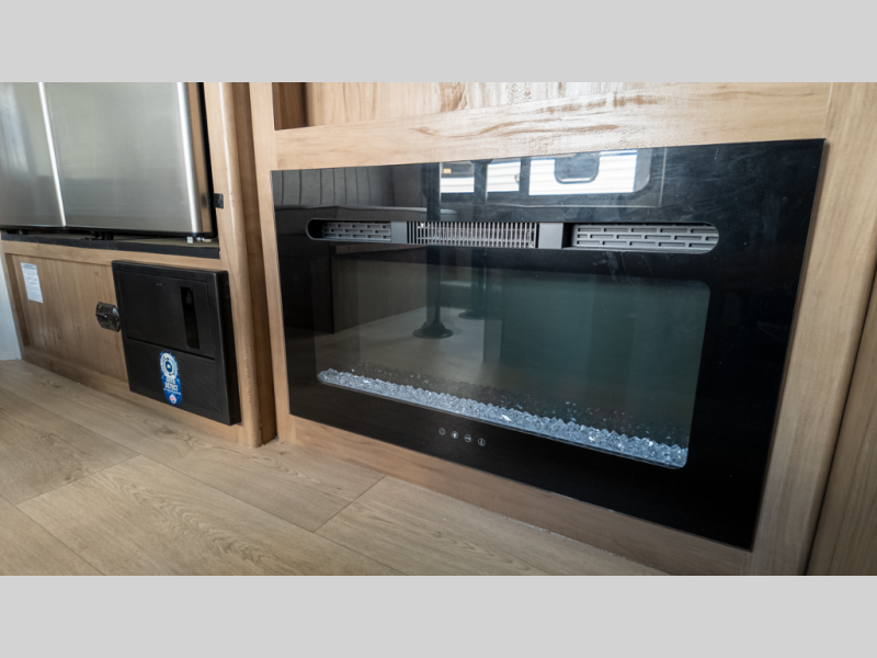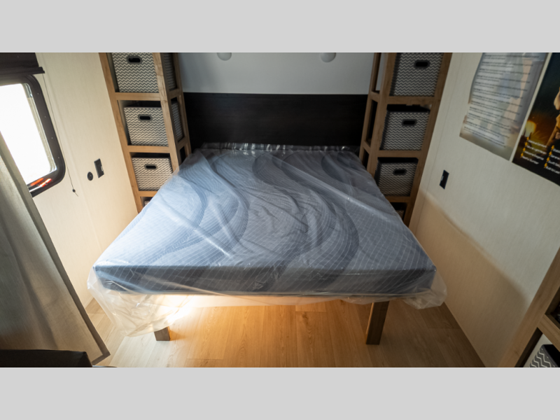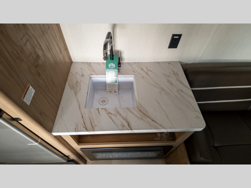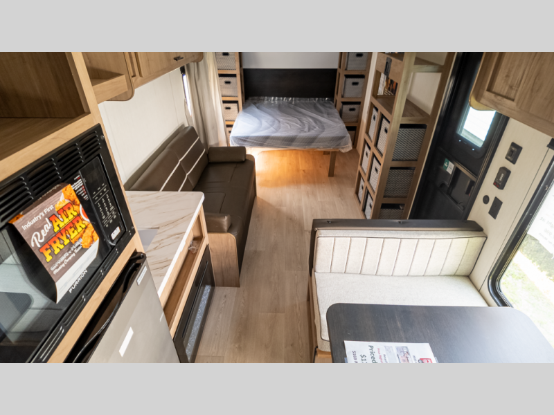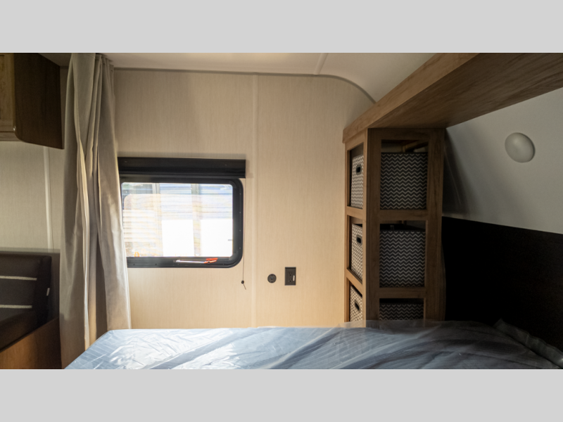 - Well-equipped kitchen: Pantry and full-sized fridge rival setups in larger models from Jayco or Coachmen